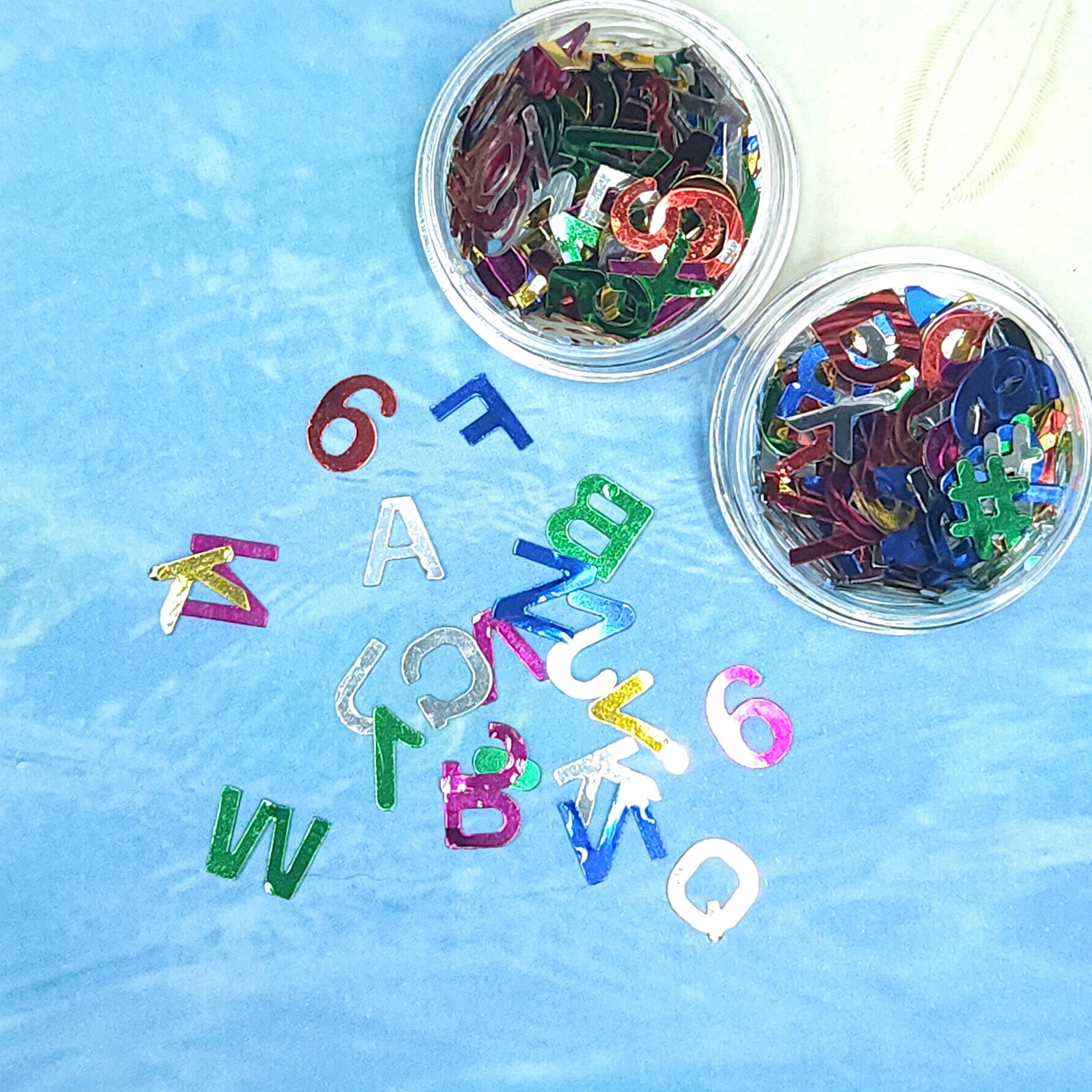 2 jars of Alphabet and Numbers glitter, giving you perfect amount of letters and numbers to finish few projects.