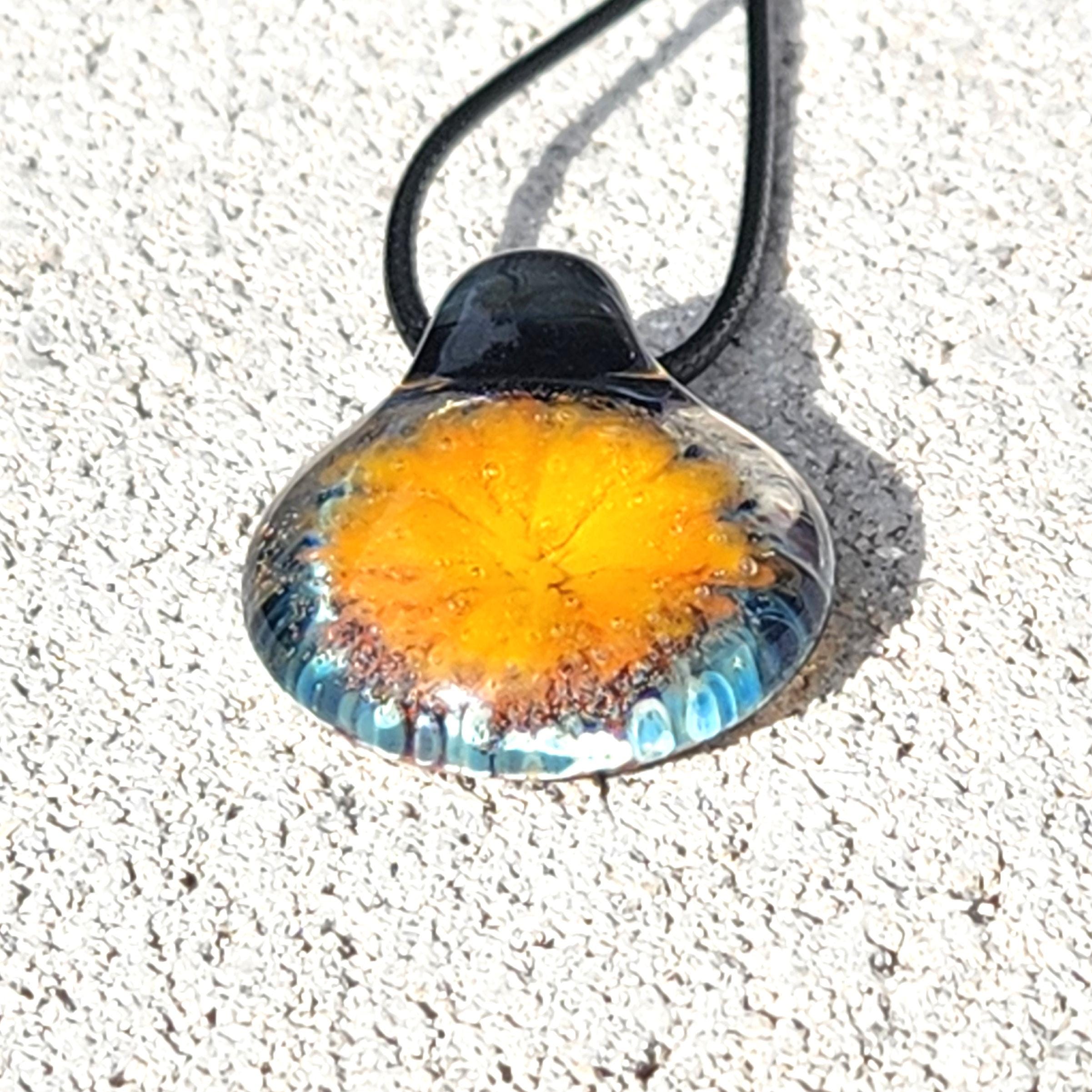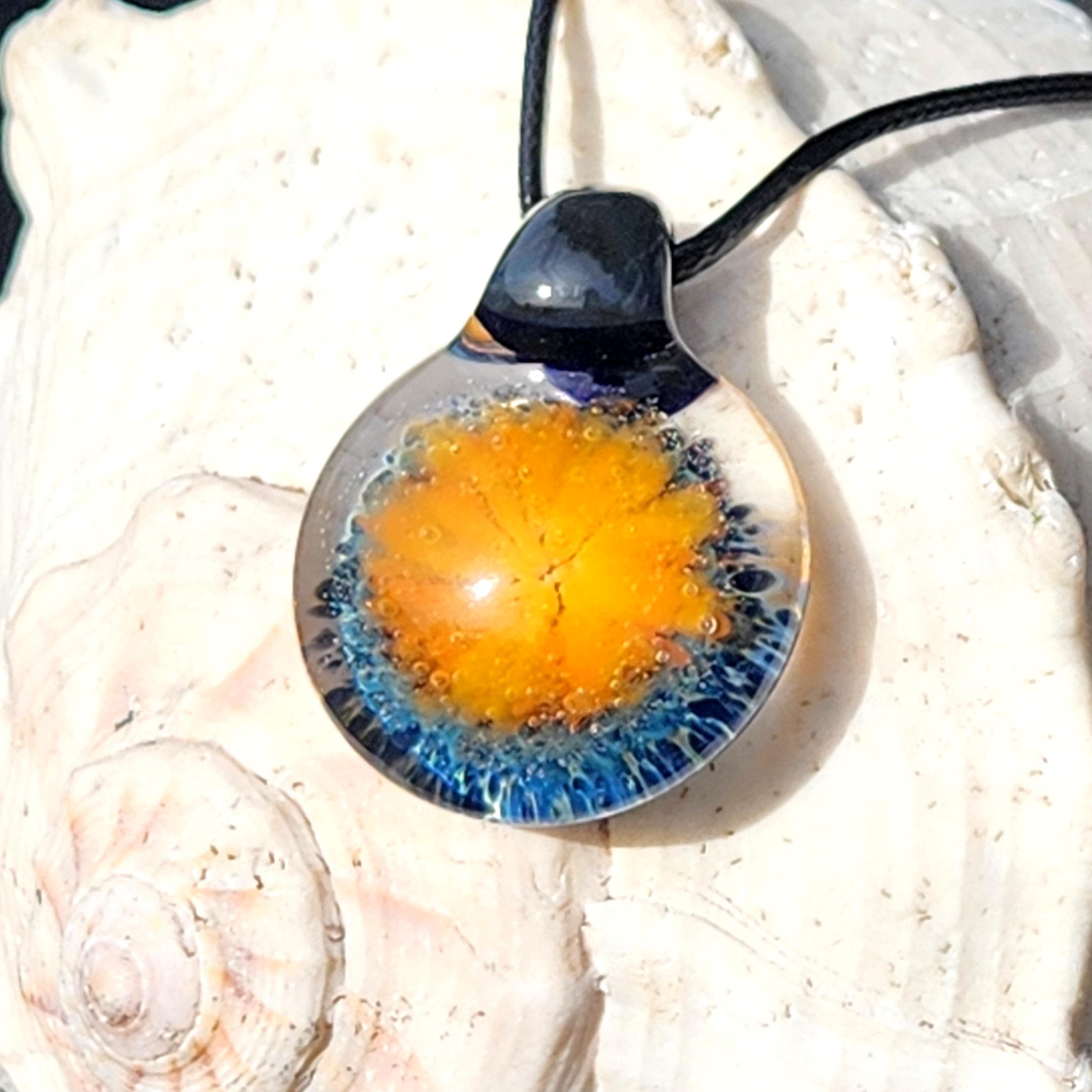 This one-of-a-kind blown glass pendant has a beautiful yellow with a slight orange tint flower inside it. Handmade from borosilicate glass in our studio in Florida, this pendant has a beautiful flower on a blue glass background. It is stunning combination of colors in the sun.