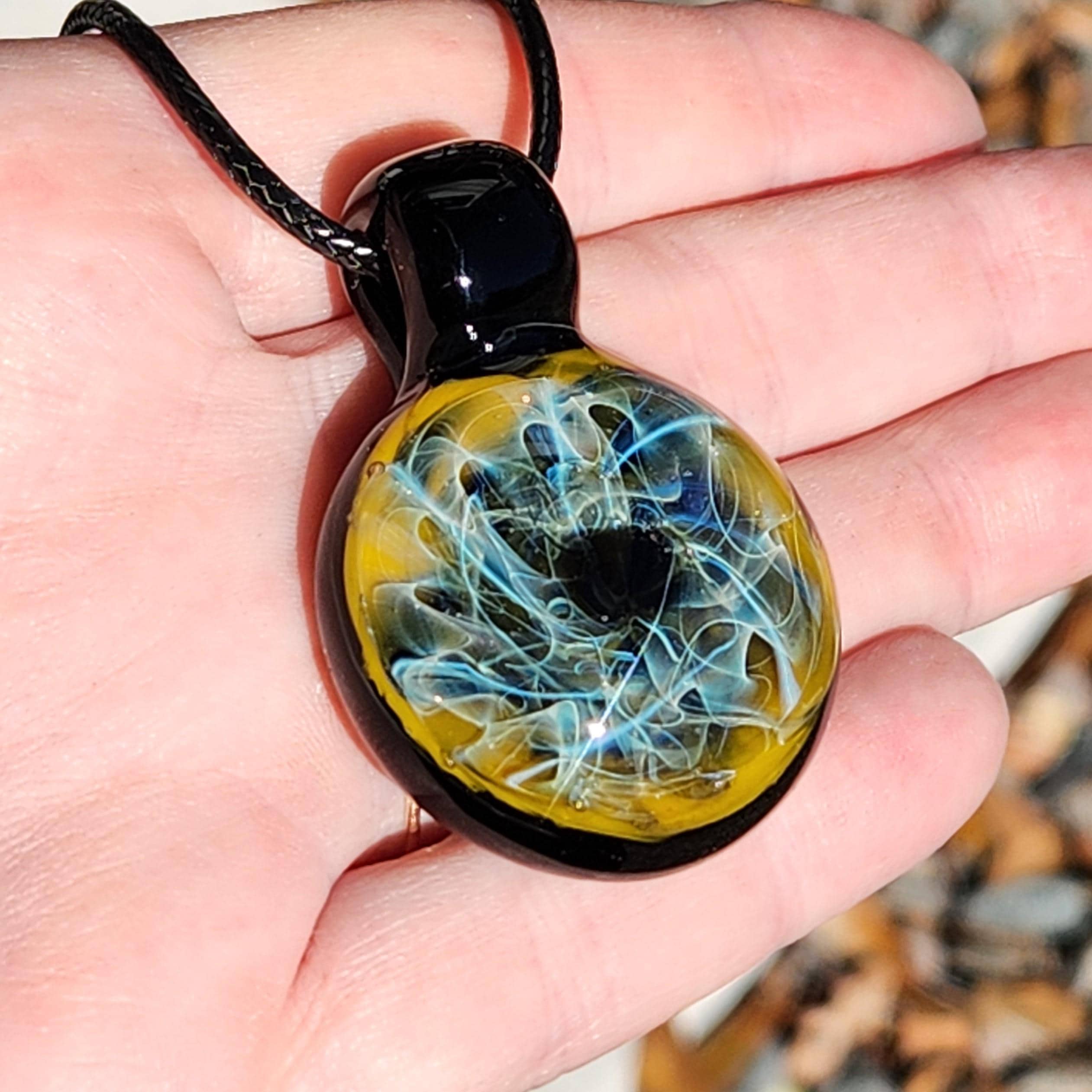 This one-of-a-kind handmade glass pendant features an intricate swirl created with pure gold and pure silver fuming, accented by warm yellow tones and encased in clear glass. The design is framed and finished in smooth black glass, giving the piece a bold, modern contrast and striking depth.