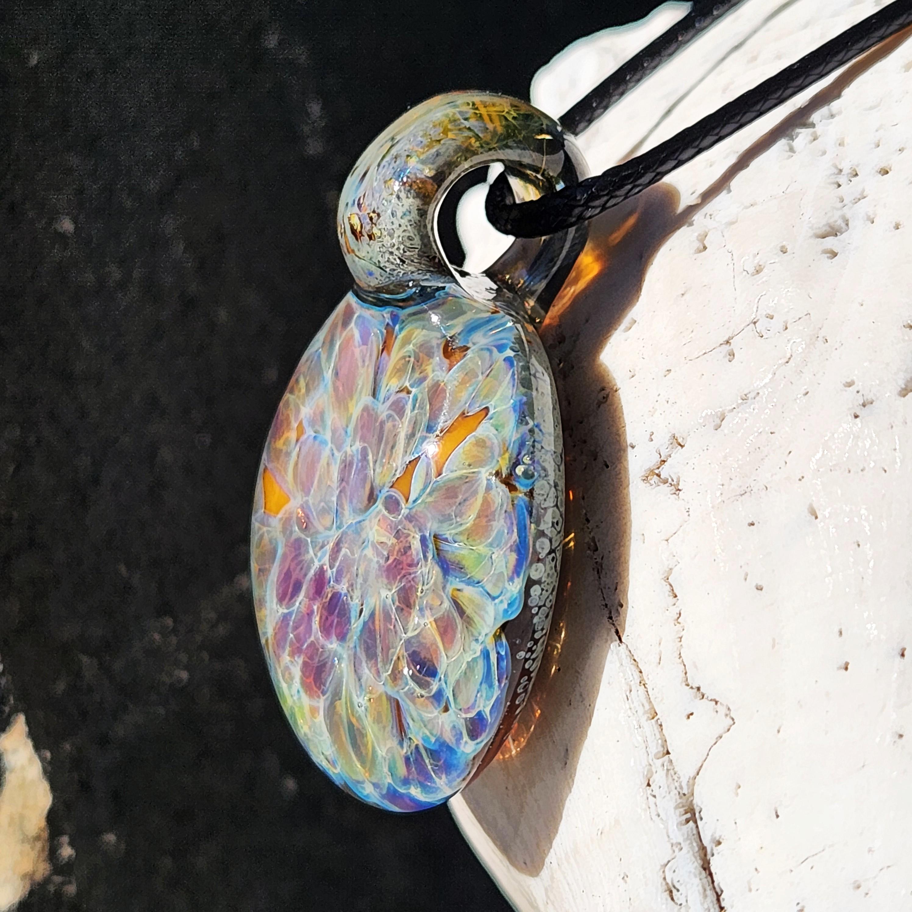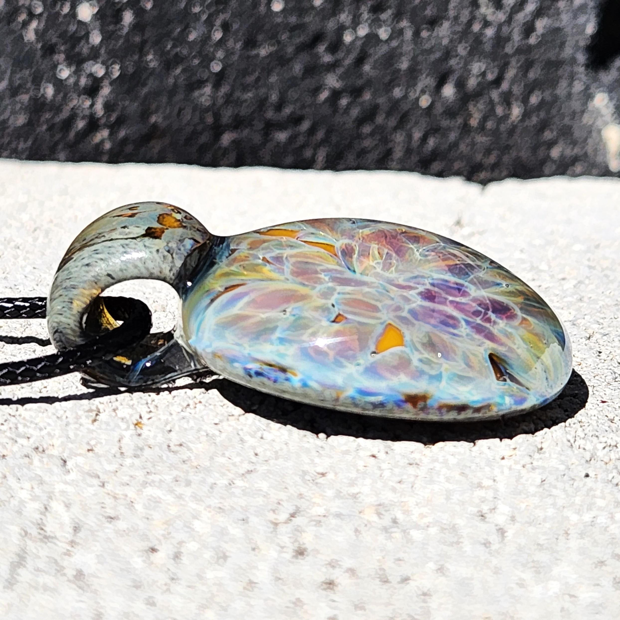 This shimmering glass pendant necklace features color-shifting glass with a metallic sparkle that changes beautifully in the light. Handmade with care from borosilicate glass, this large pendant necklace is a bold and elegant statement piece for anyone who loves unique, handcrafted jewelry.