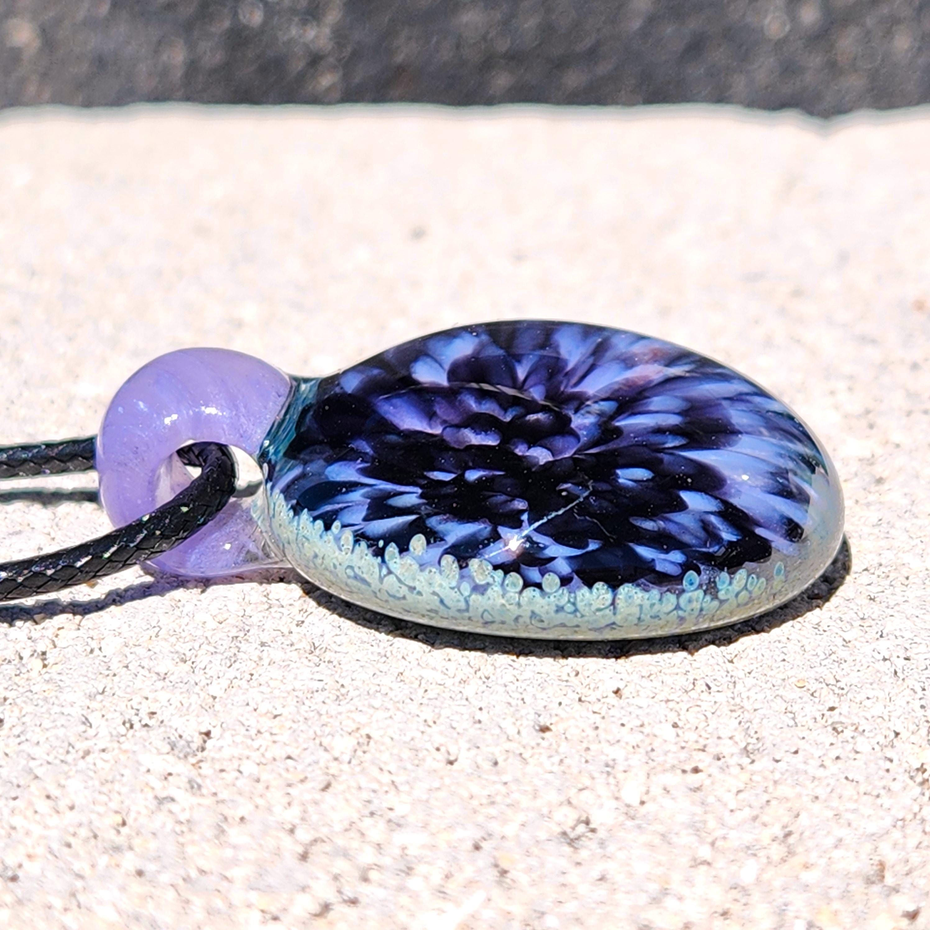 Experience the depth and movement of light with this handcrafted borosilicate glass pendant necklace featuring crushed transparent purple and pink glass layered over a black background.