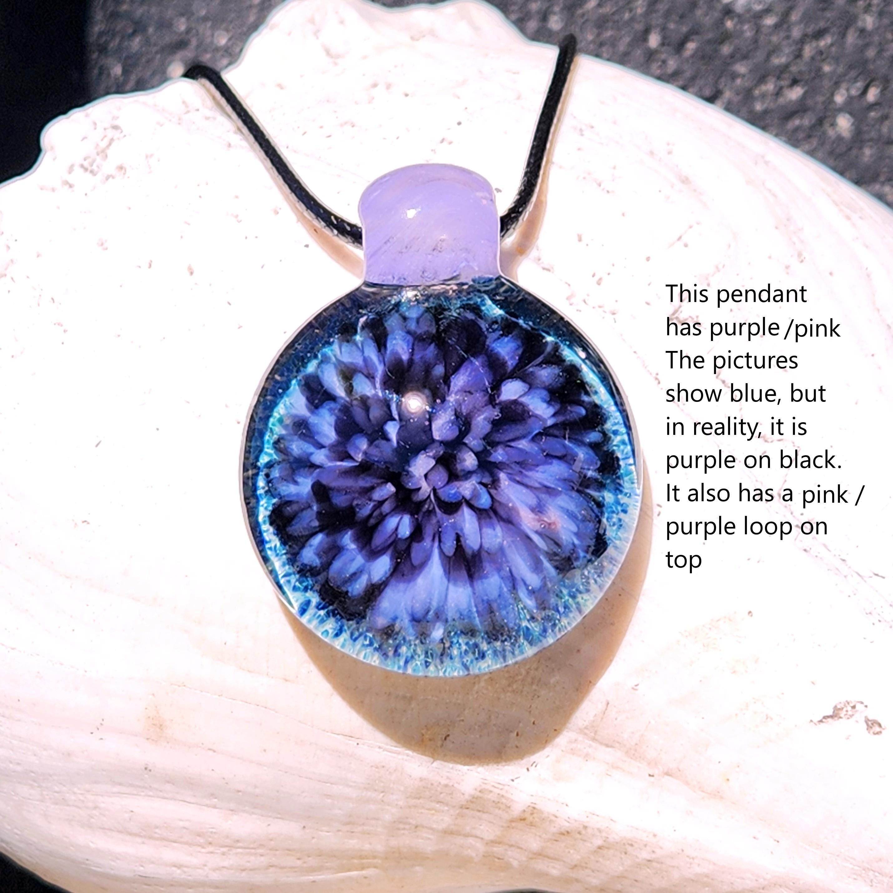 In photographs, the pendant may appear more blue due to lighting and reflection. In person, it reveals beautiful purple and pink tones that shift depending on the light, appearing more purple in some settings and warmer pink in others. A subtle blue undertone in the background adds additional depth and contrast.
