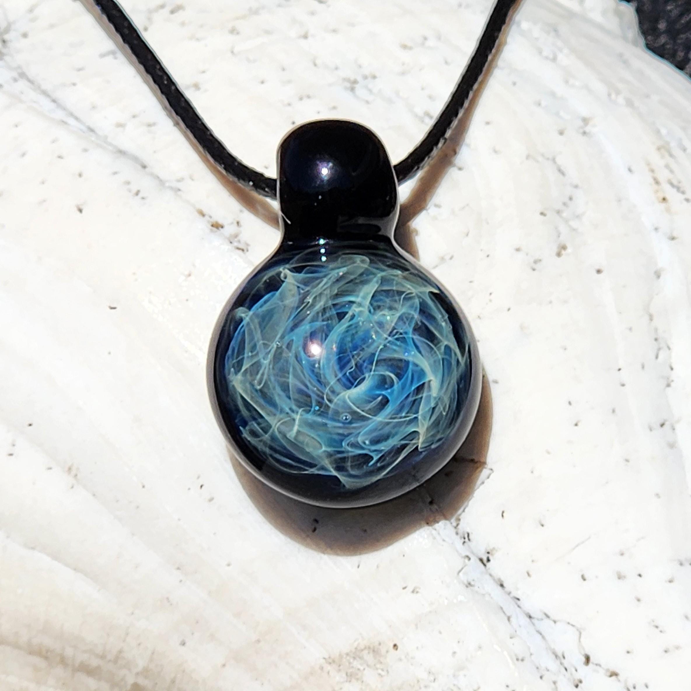 Handmade from durable borosilicate glass, this small blue swirl pendant necklace glows with soft layers of color created by pure silver fuming over a deep blue background. The smooth black finish frames the glass pendant beautifully, giving it a celestial, swirling depth, almost like a galaxy you can wear close to your heart.
