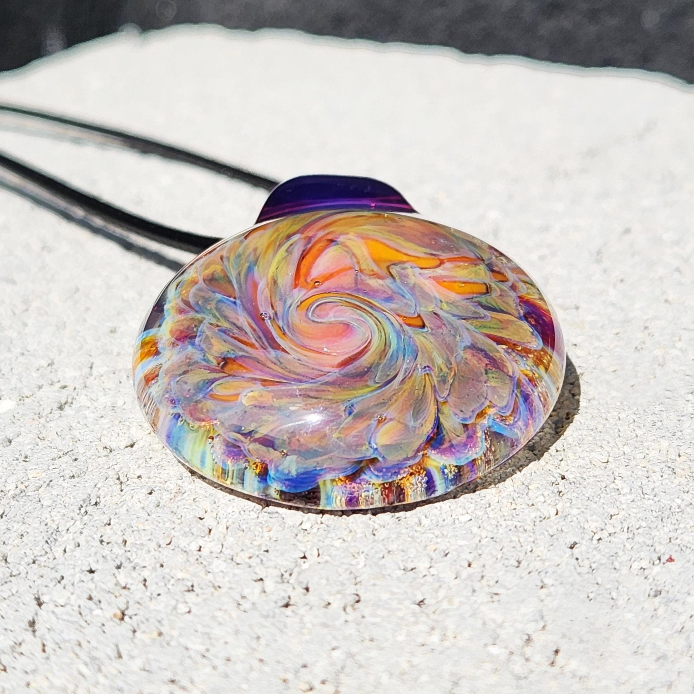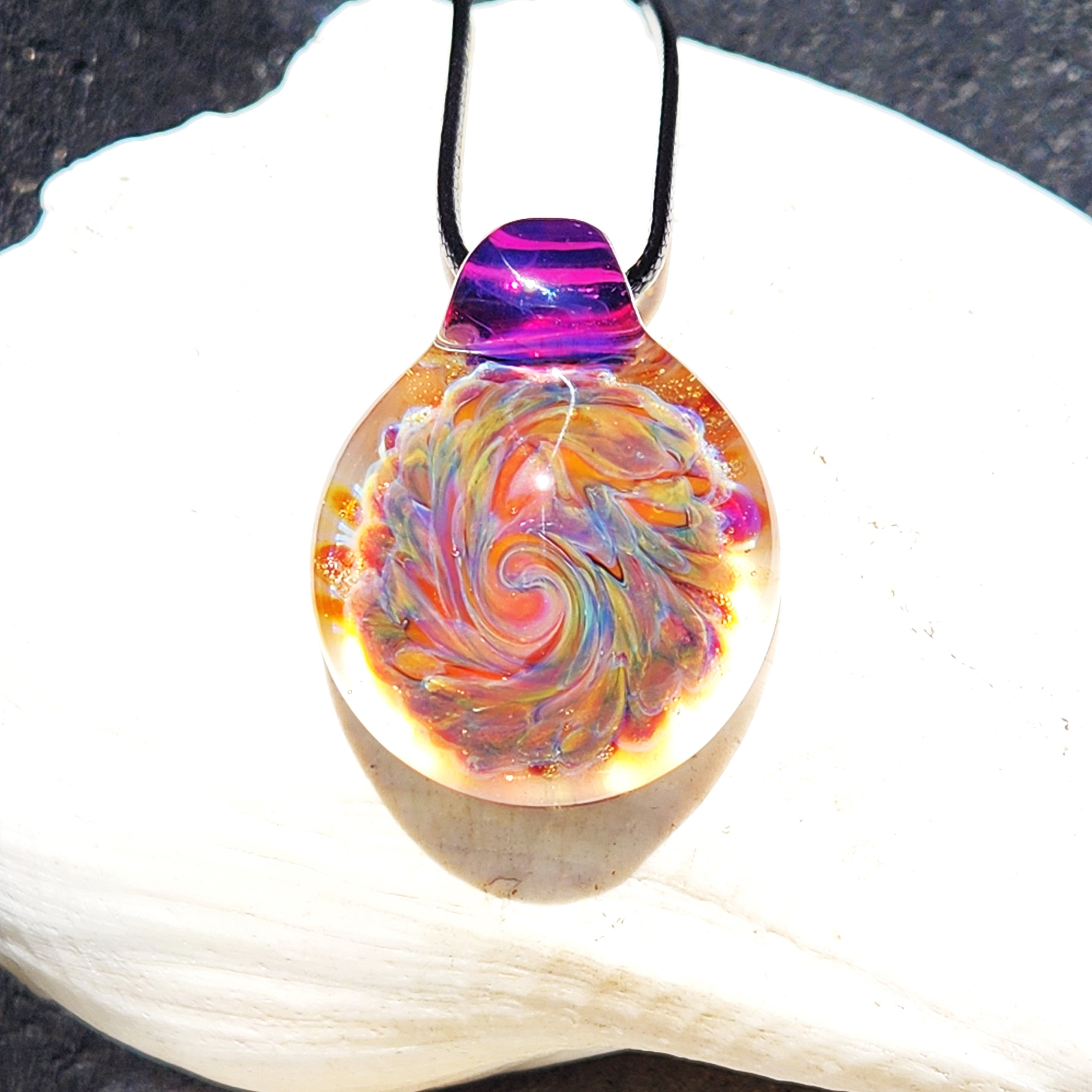 WOW! This is an amazing one-of-a-kind blown glass pendant. Handmade from borosilicate glass and annealed for strength and durability, this glass pendant will last forever. The pendant necklace features a mesmerizing display of swirling array of colors on a clear background, capturing the essence of enchantment and wonder. No two pendants are exactly alike, making this piece truly unique. The pictured piece is the one you will be holding in your own hand.
