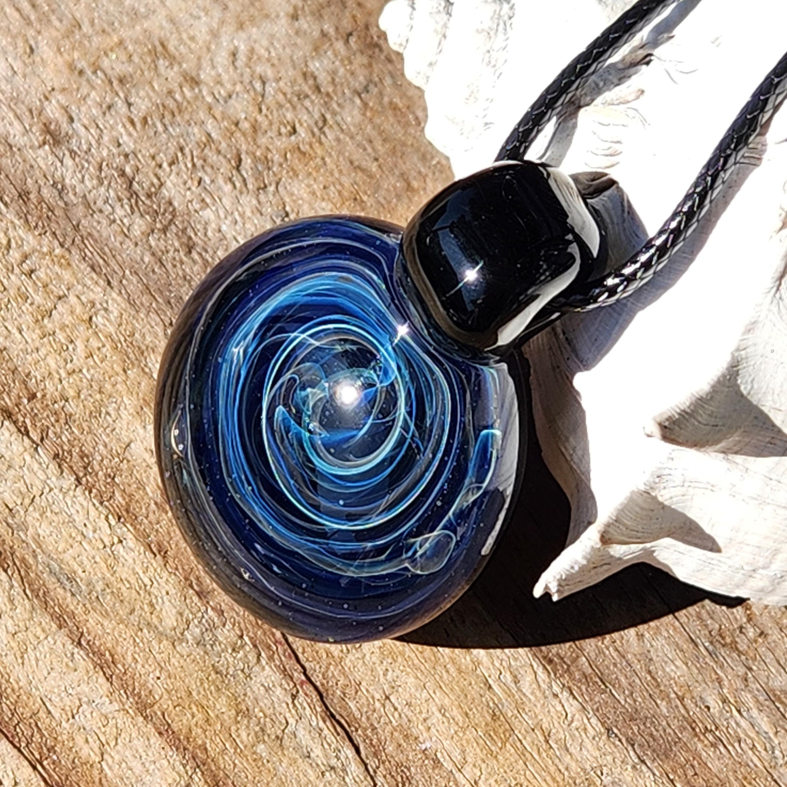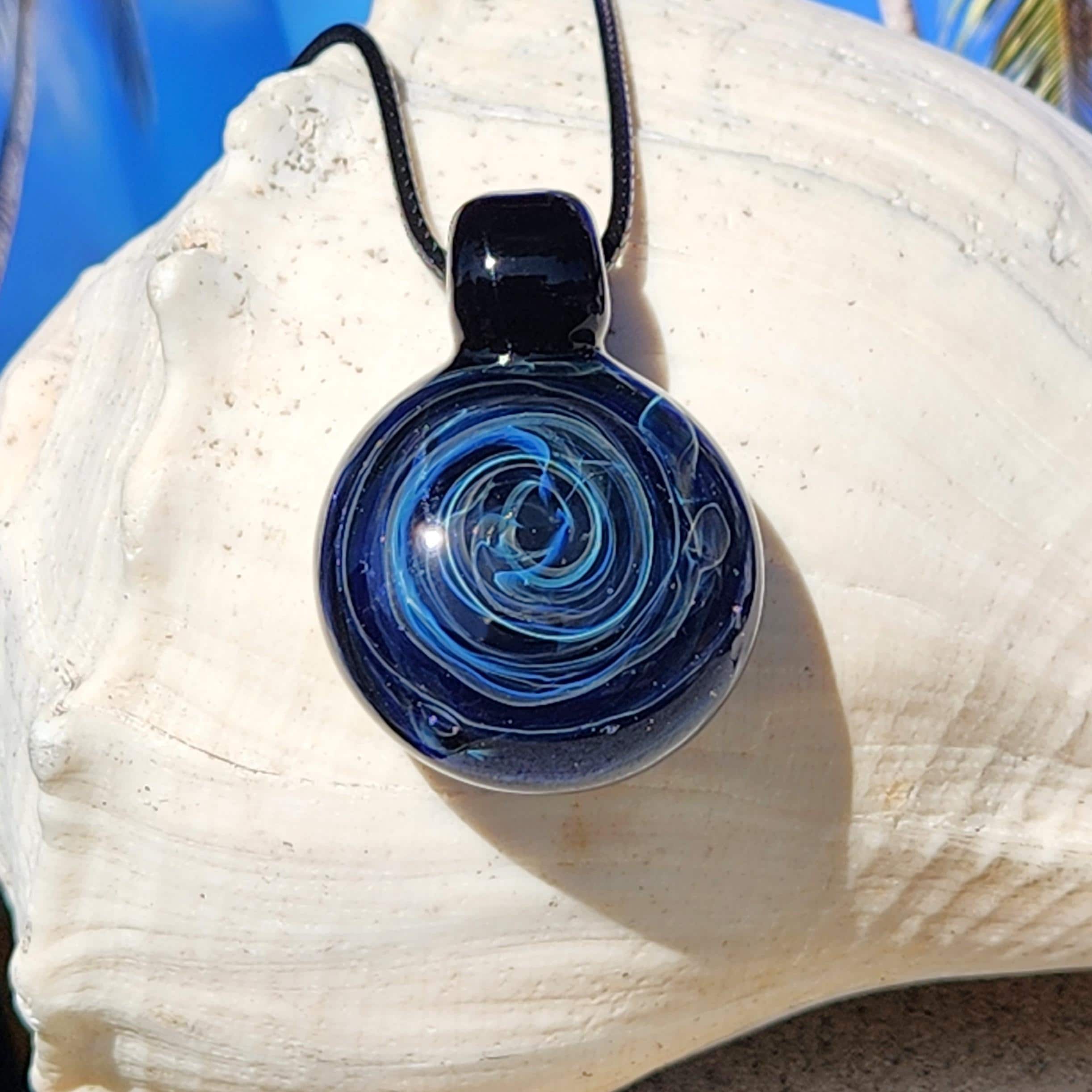 This handmade glass pendant features vibrant swirls of different shades of blue, created through the alchemy of pure silver fuming. Against a dark background, the colors shift in the light, giving this pendant a mesmerizing cosmic energy.