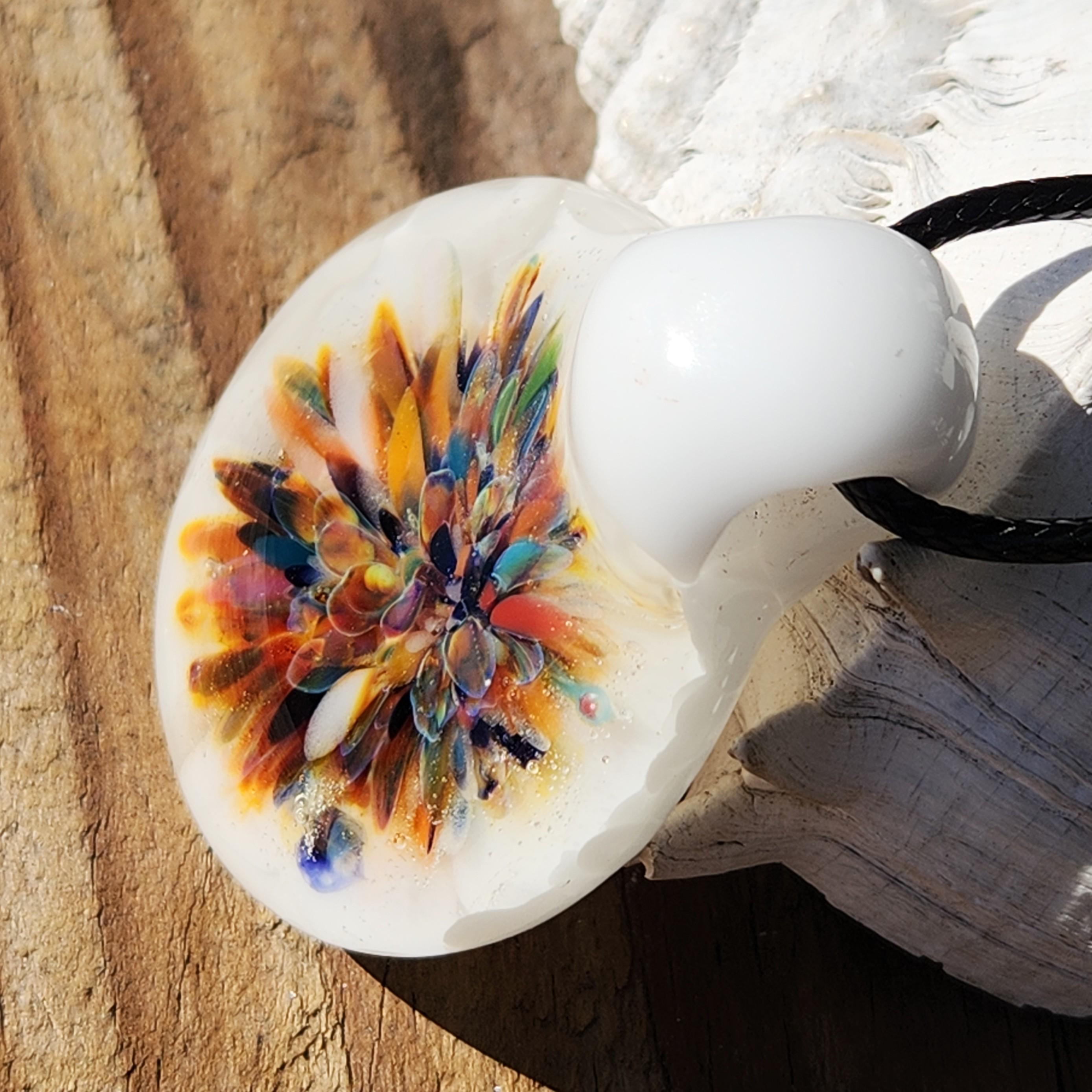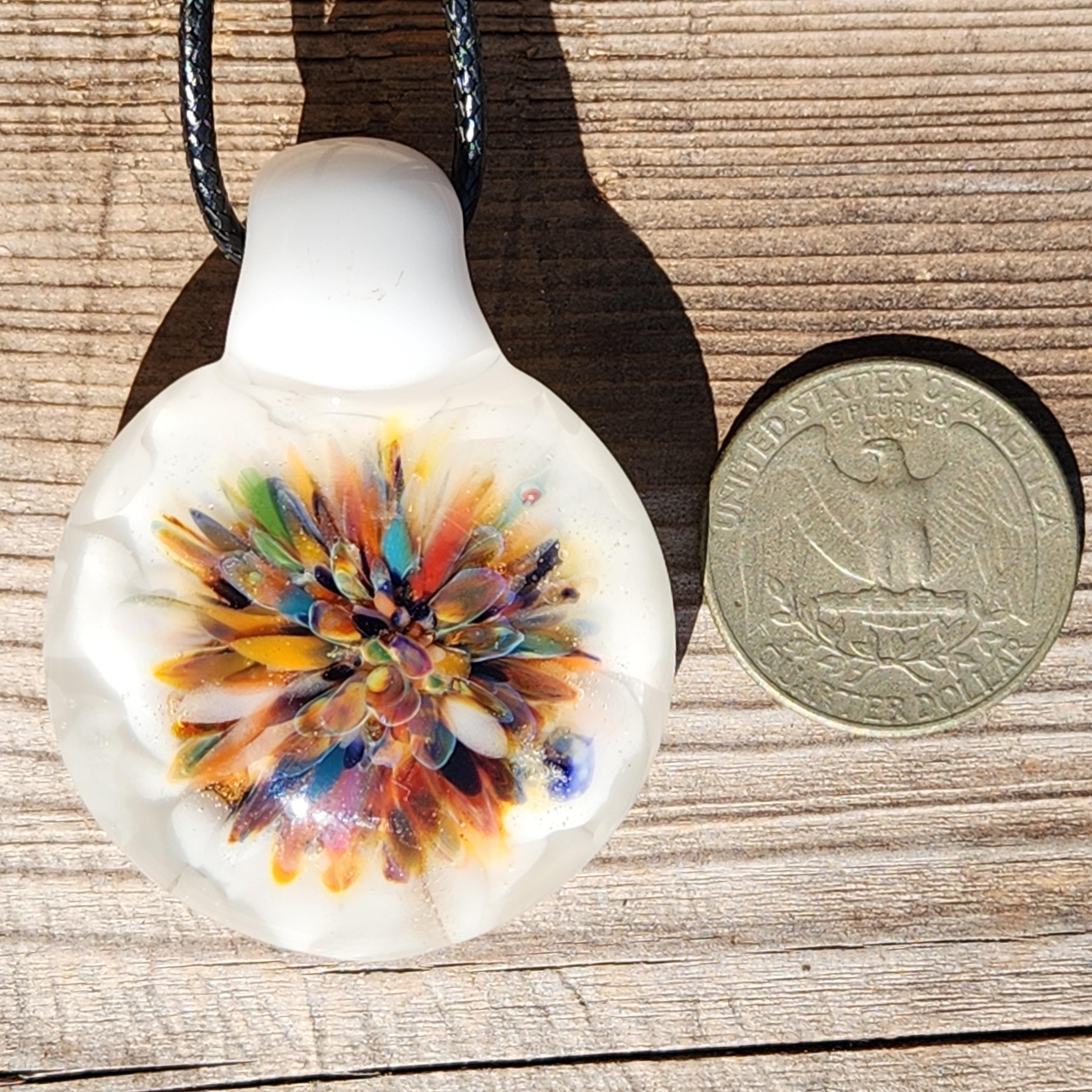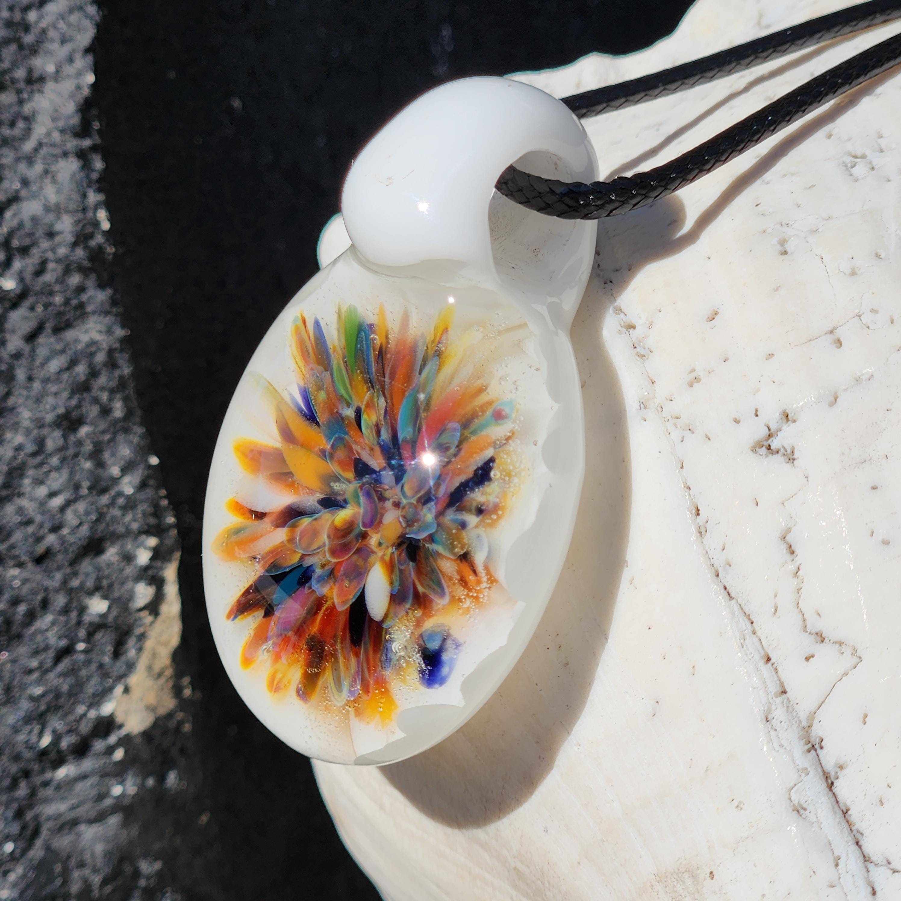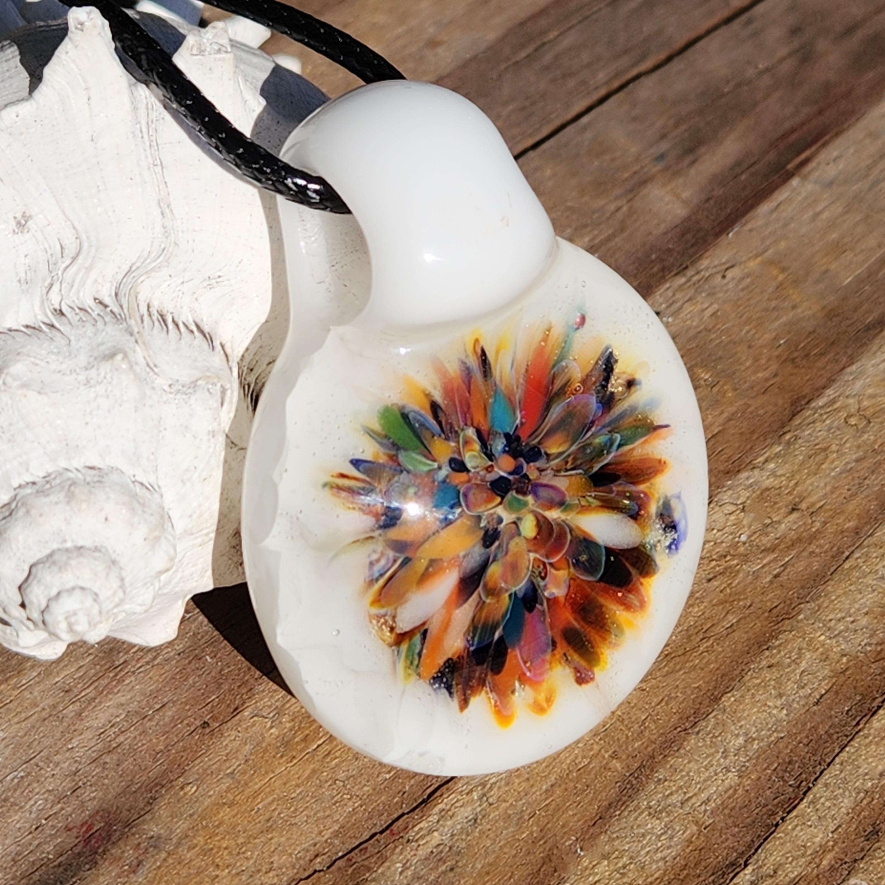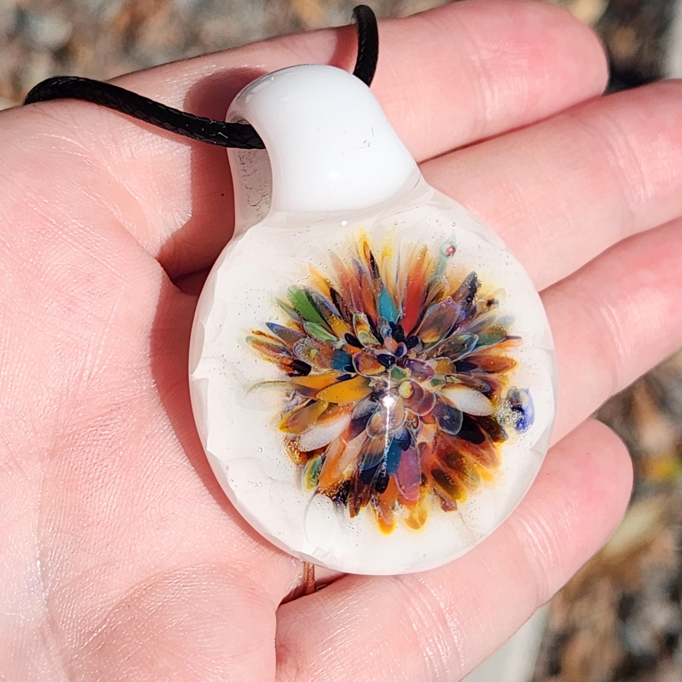 This handmade glass pendant necklace features a vibrant burst of color blooming at the center, surrounded by a soft background of white crushed glass that makes every hue glow beautifully. Each petal-like detail is flame-worked by hand, creating a one-of-a-kind wearable artwork full of depth, warmth, and movement.