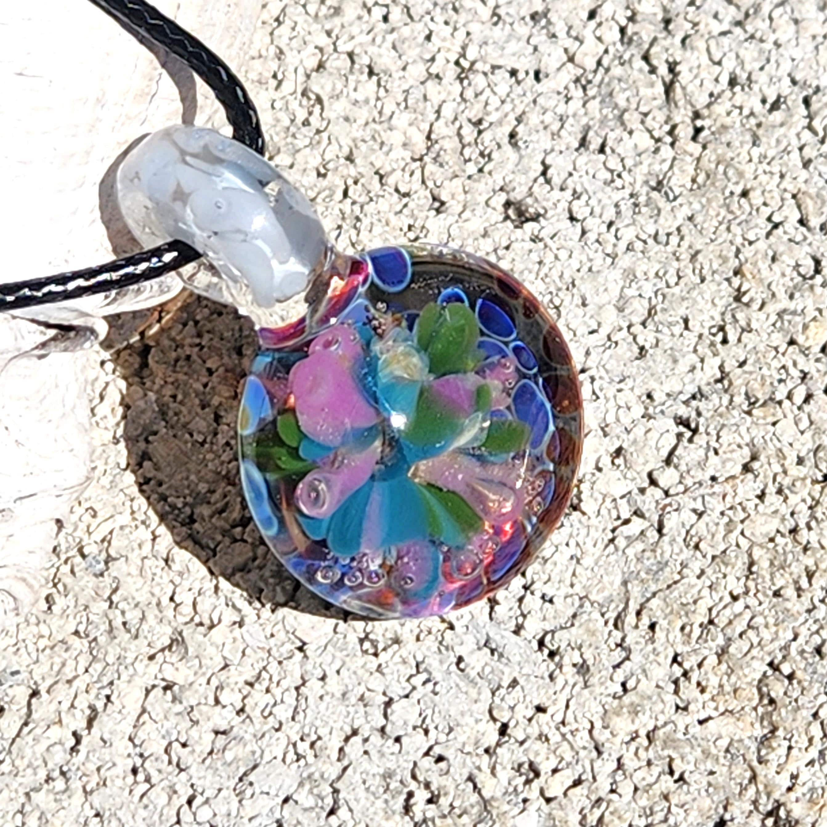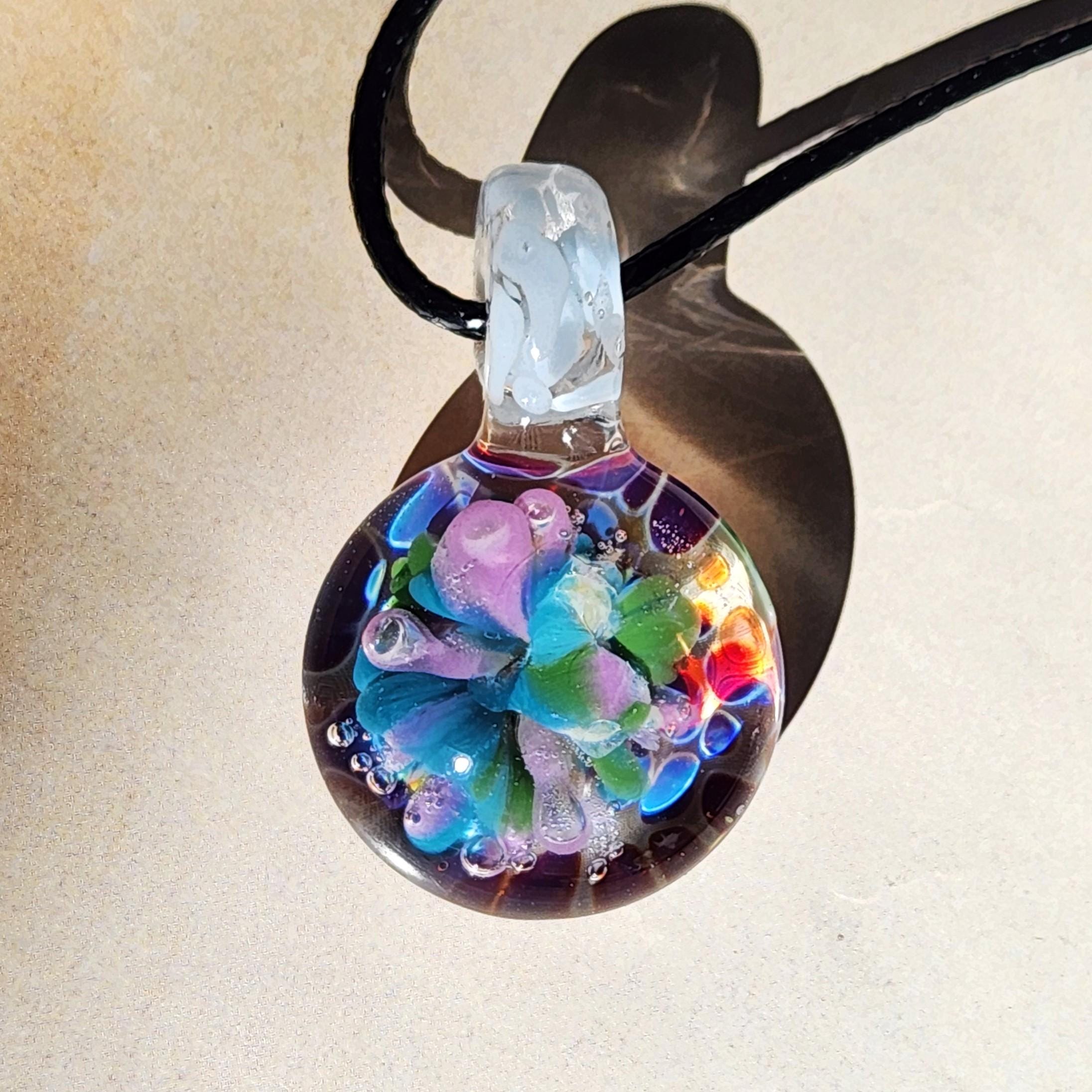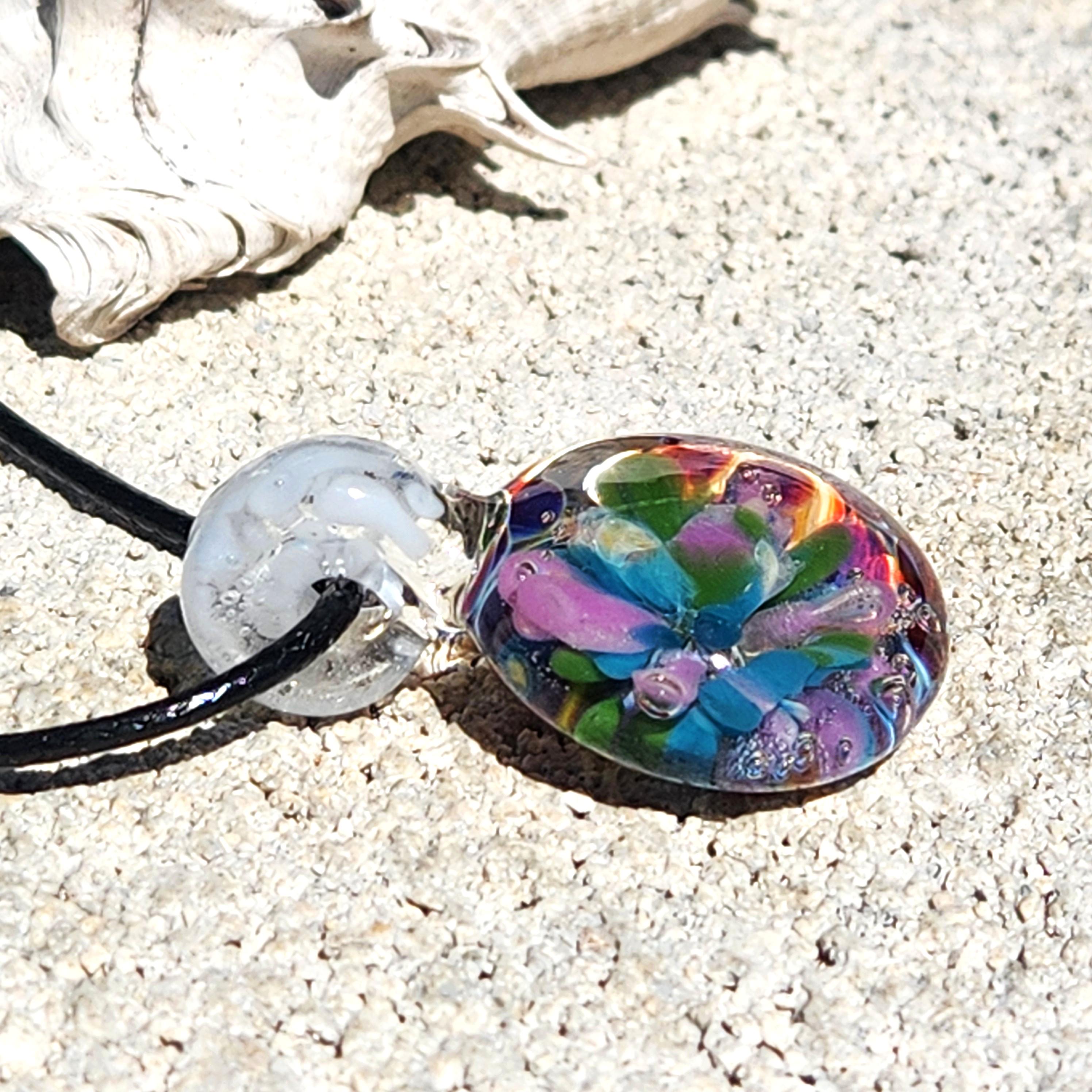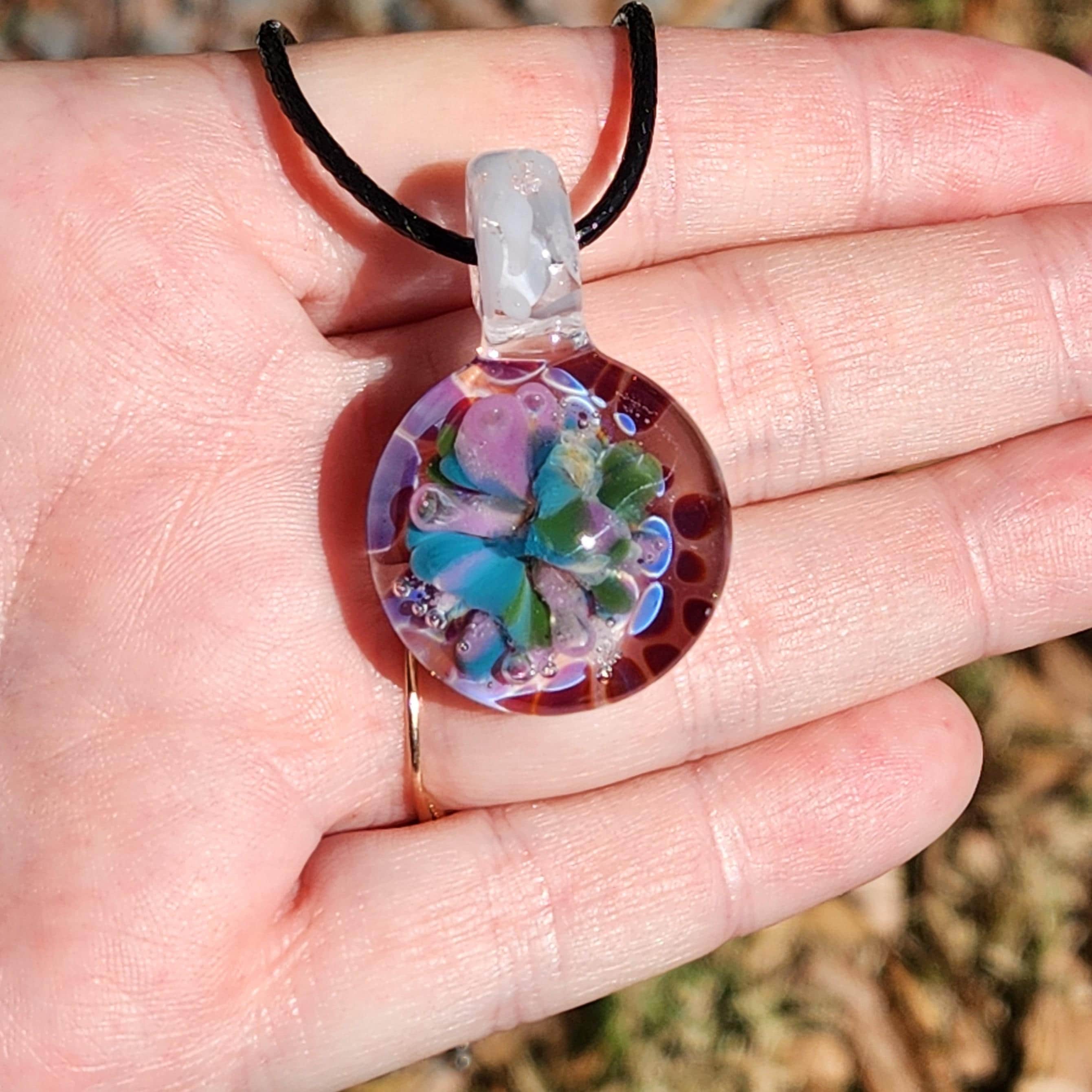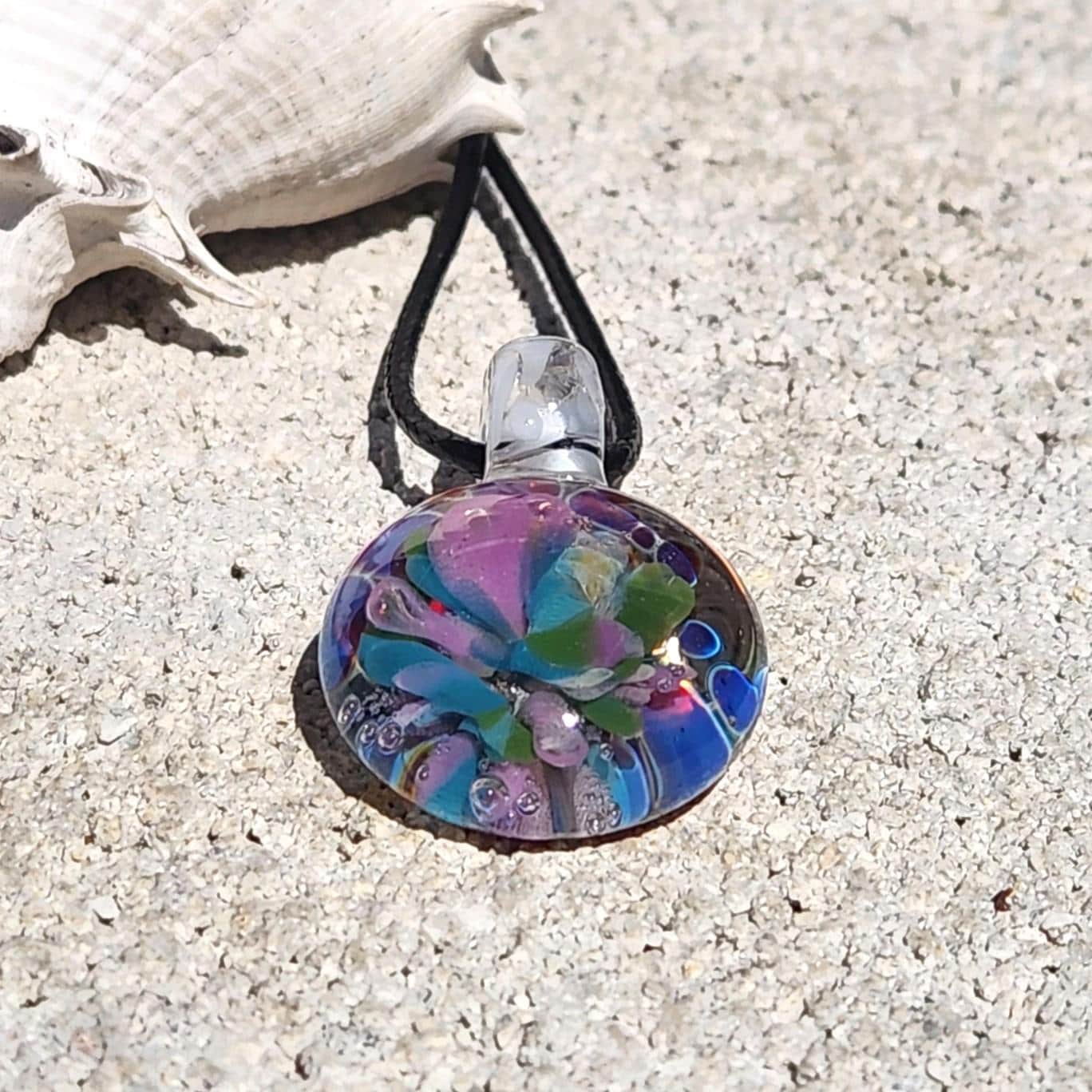This small colorful glass pendant necklace is handmade in the USA from borosilicate glass. Its soft lavender tones shimmer beneath a crystal-clear dome, delicate enough for everyday wear, yet unique enough to catch the eye.