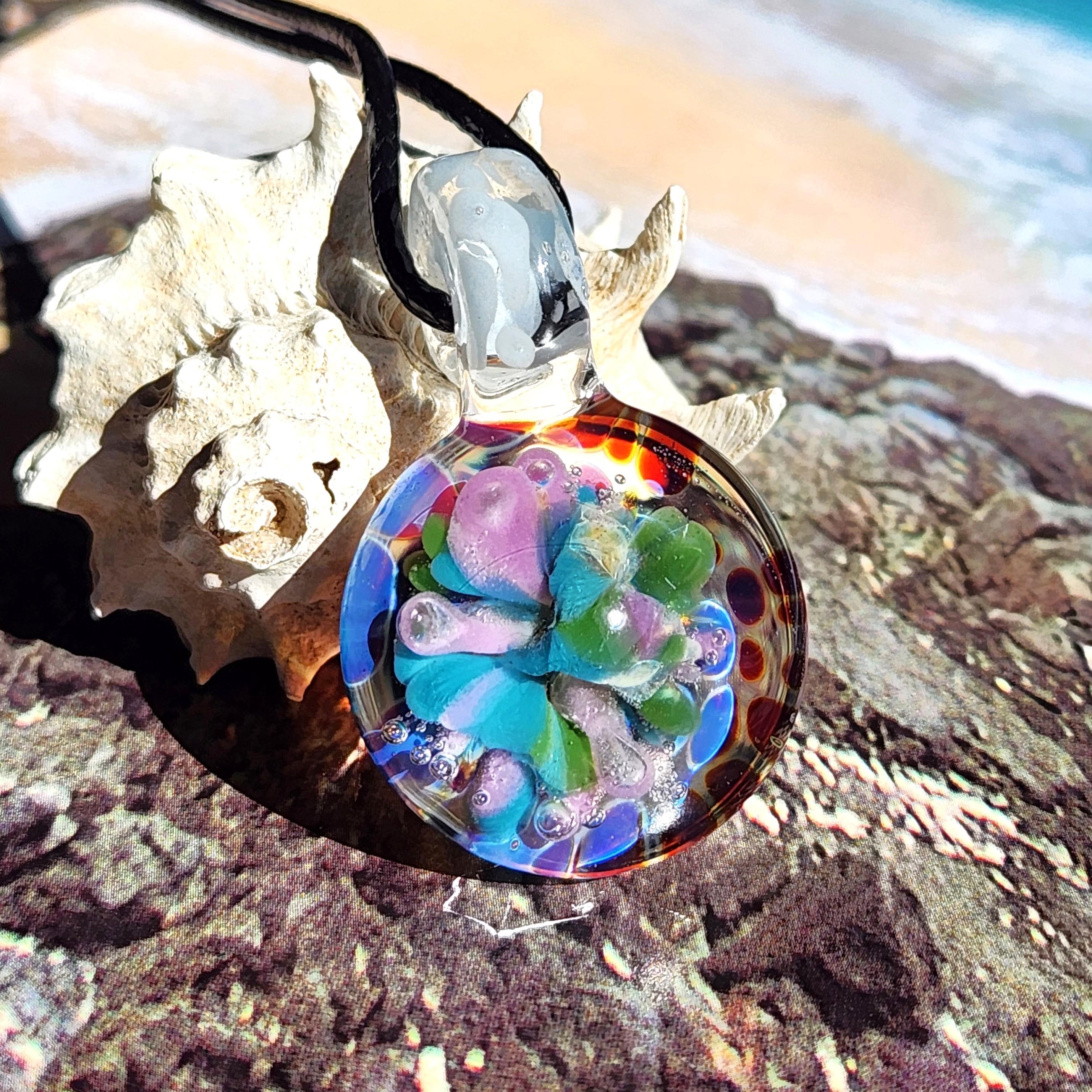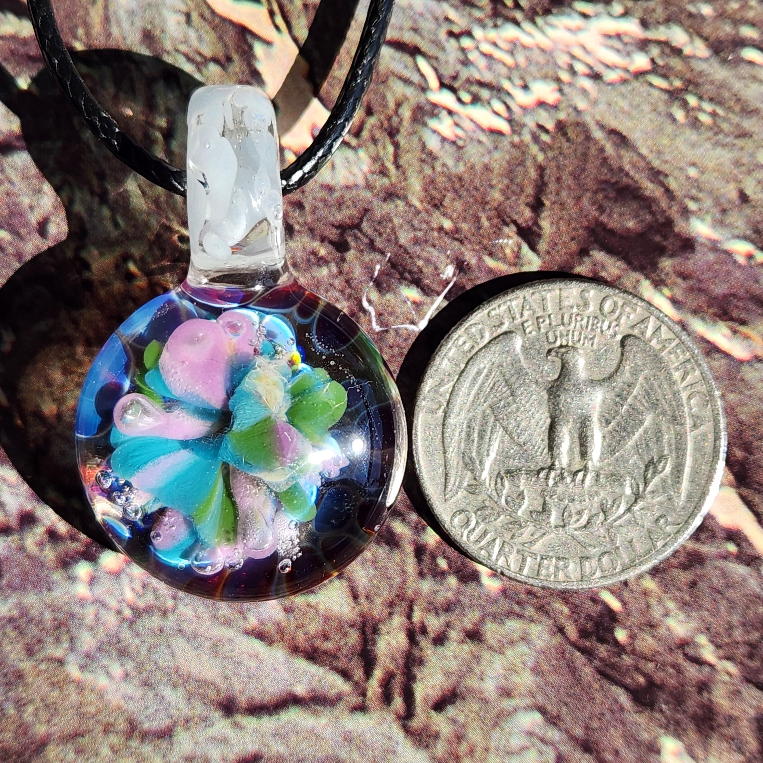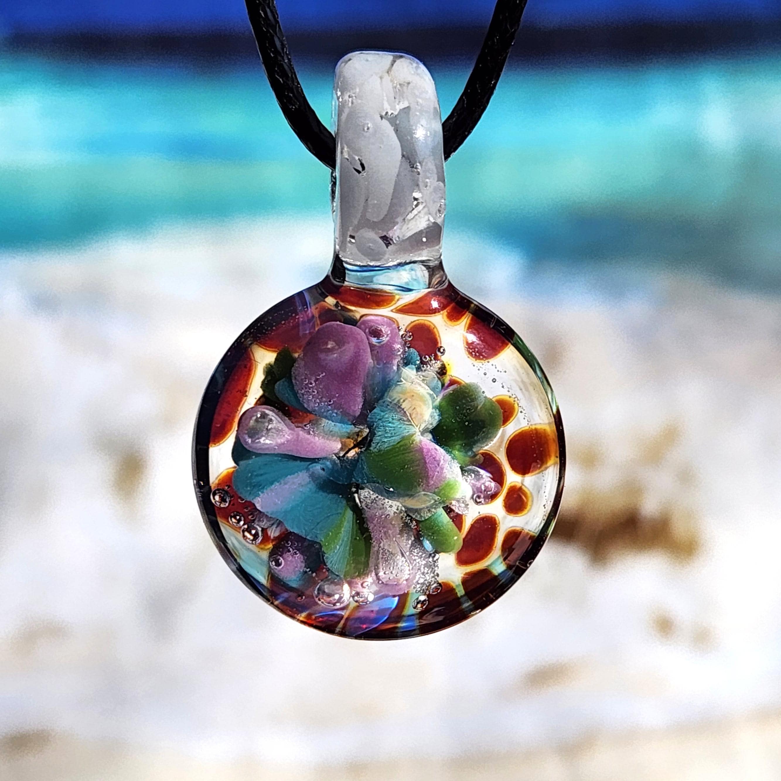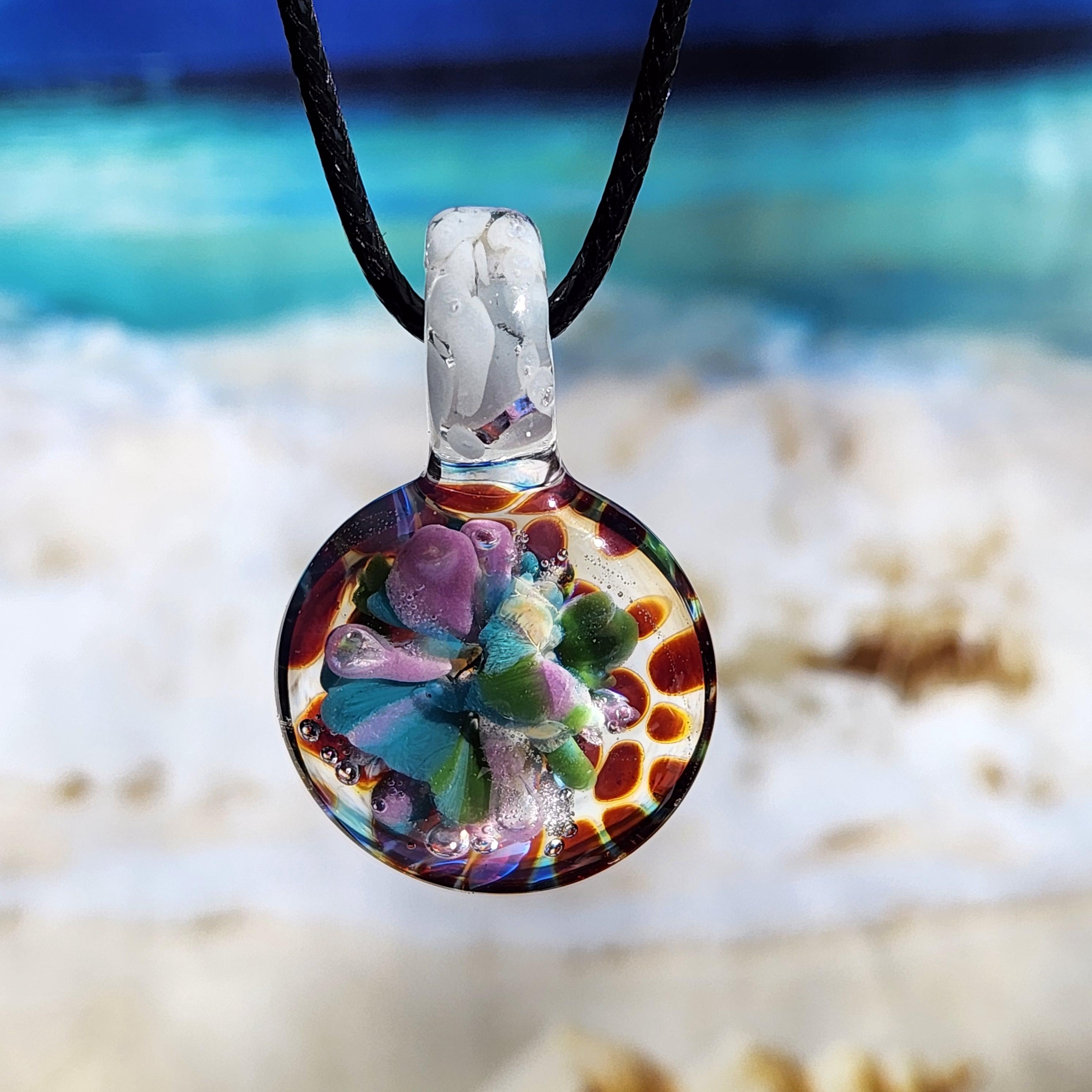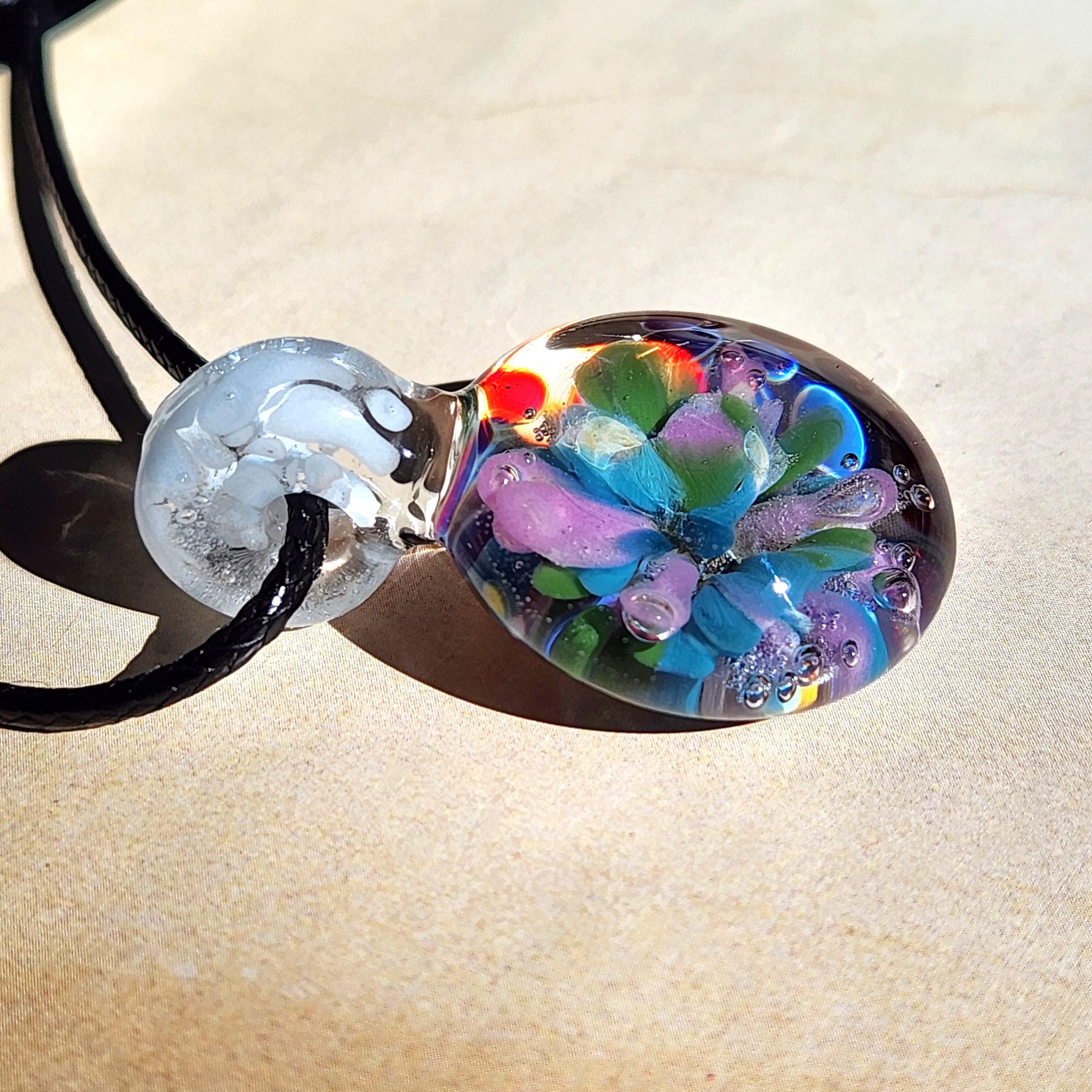 This small colorful glass pendant necklace is handmade in the USA from borosilicate glass. Its soft lavender tones shimmer beneath a crystal-clear dome, delicate enough for everyday wear, yet unique enough to catch the eye.