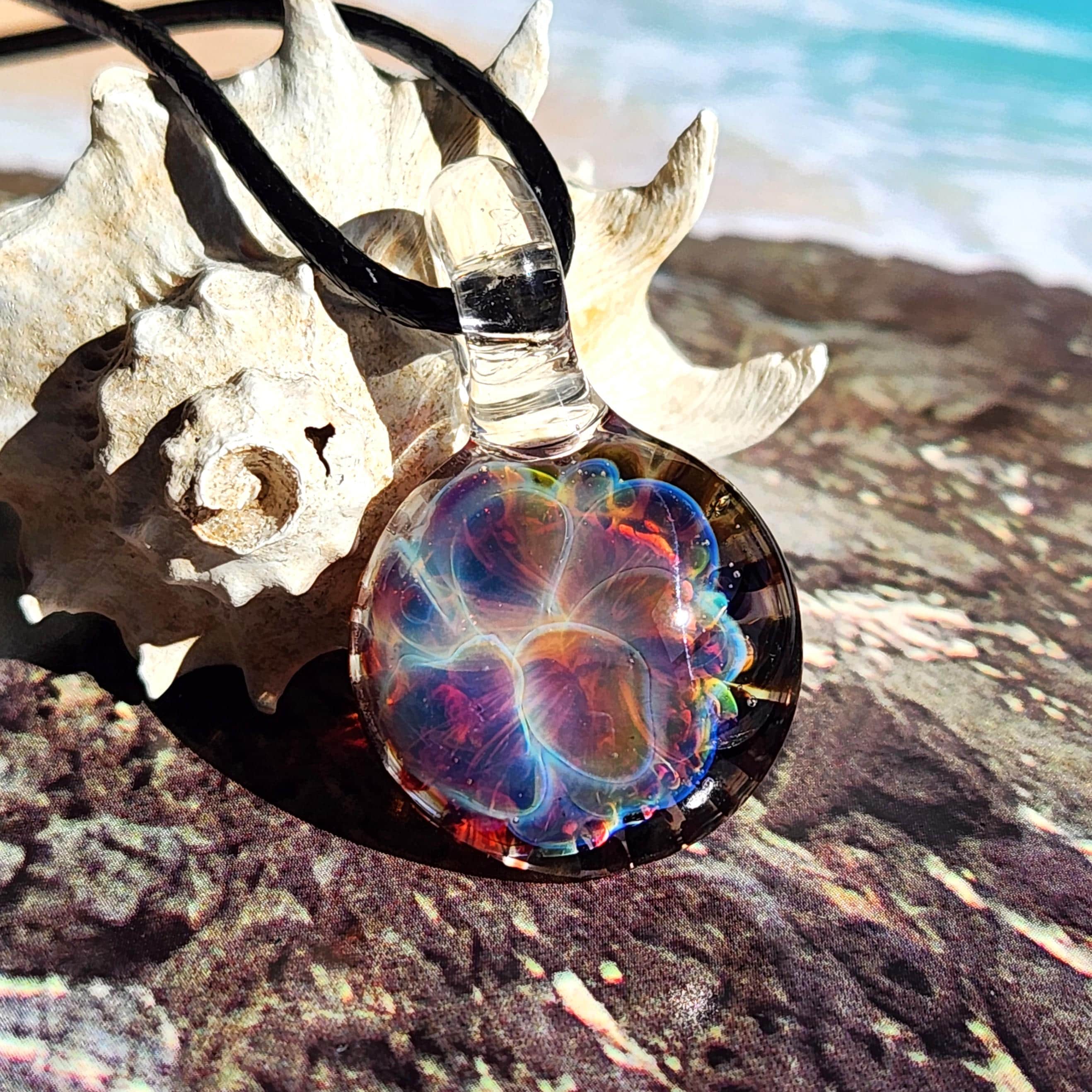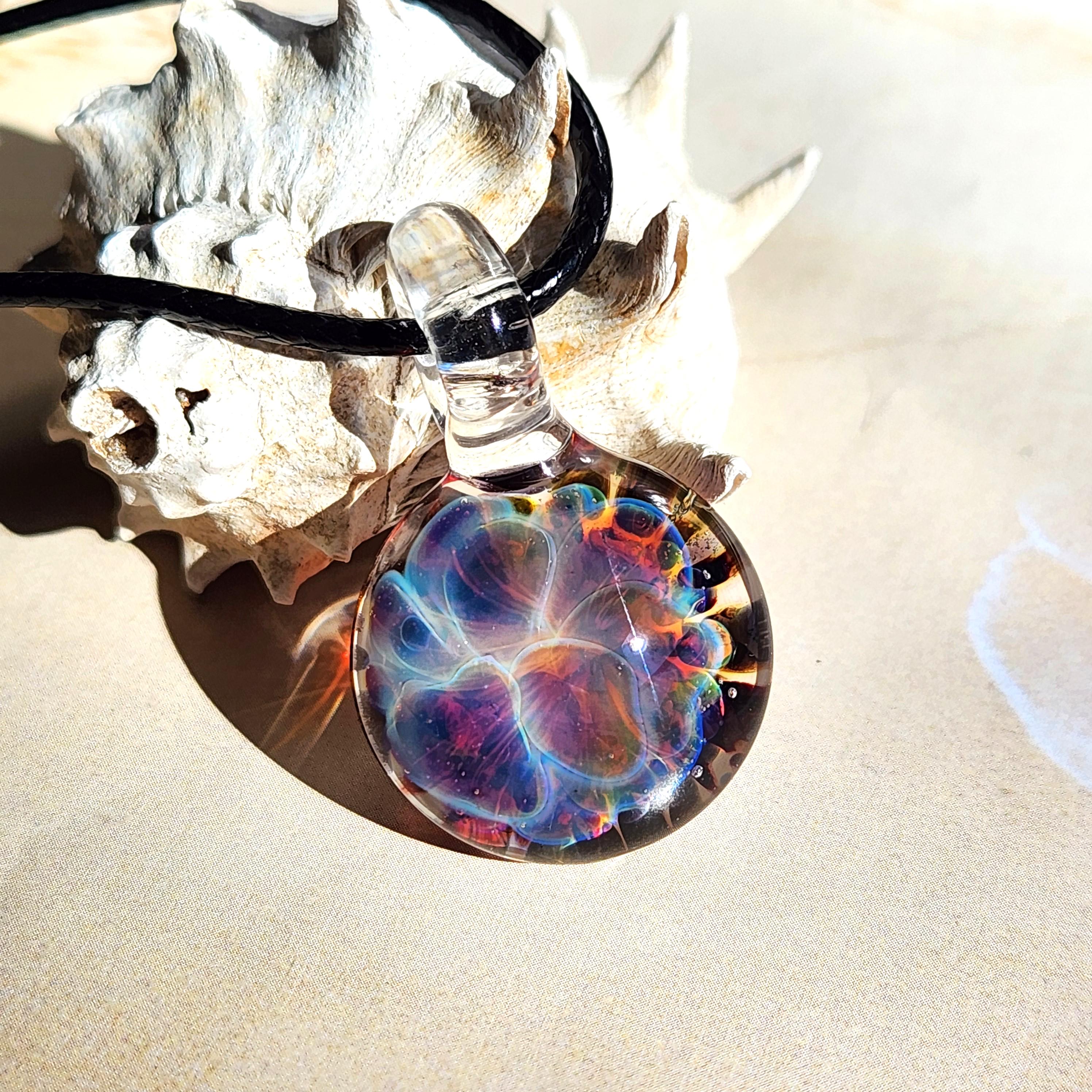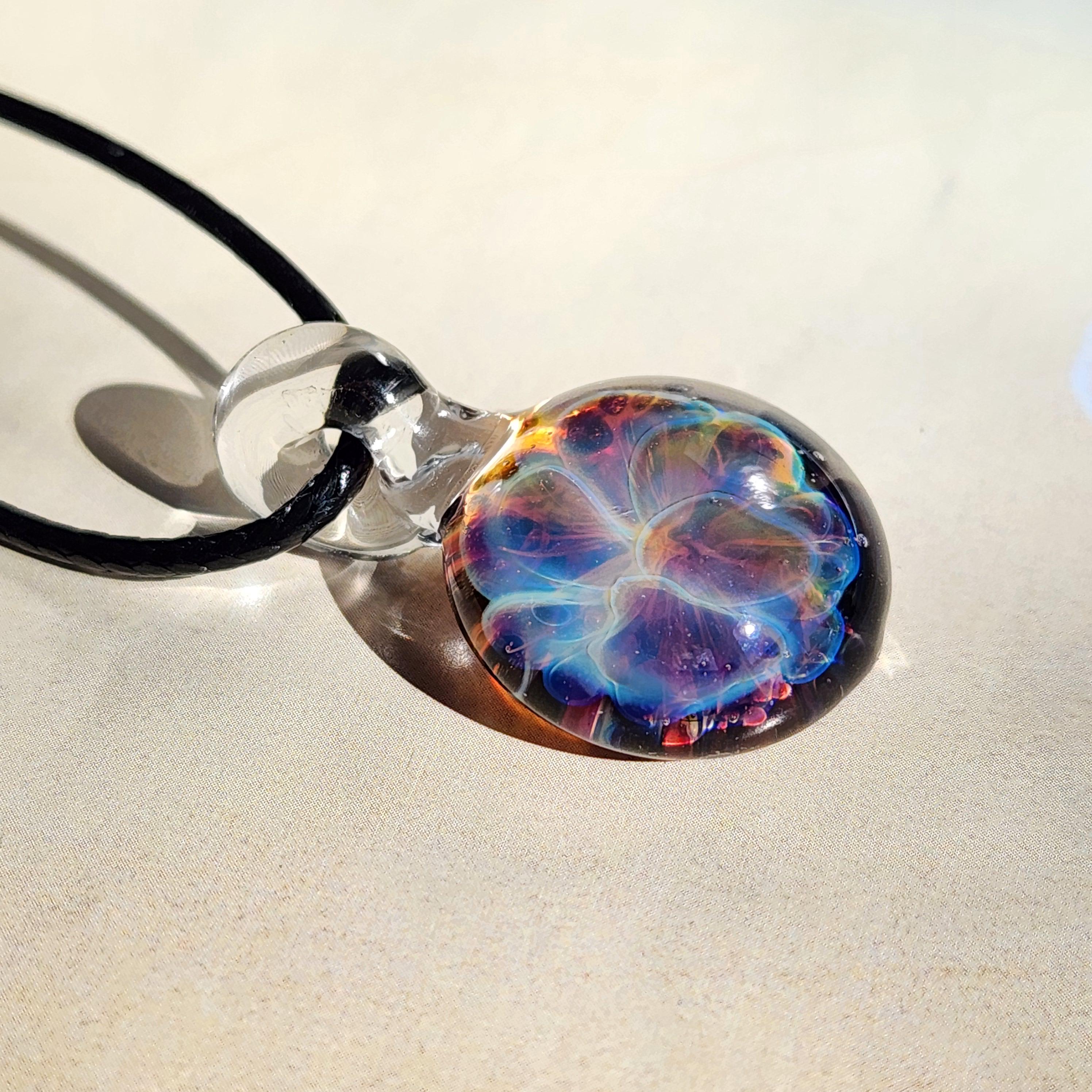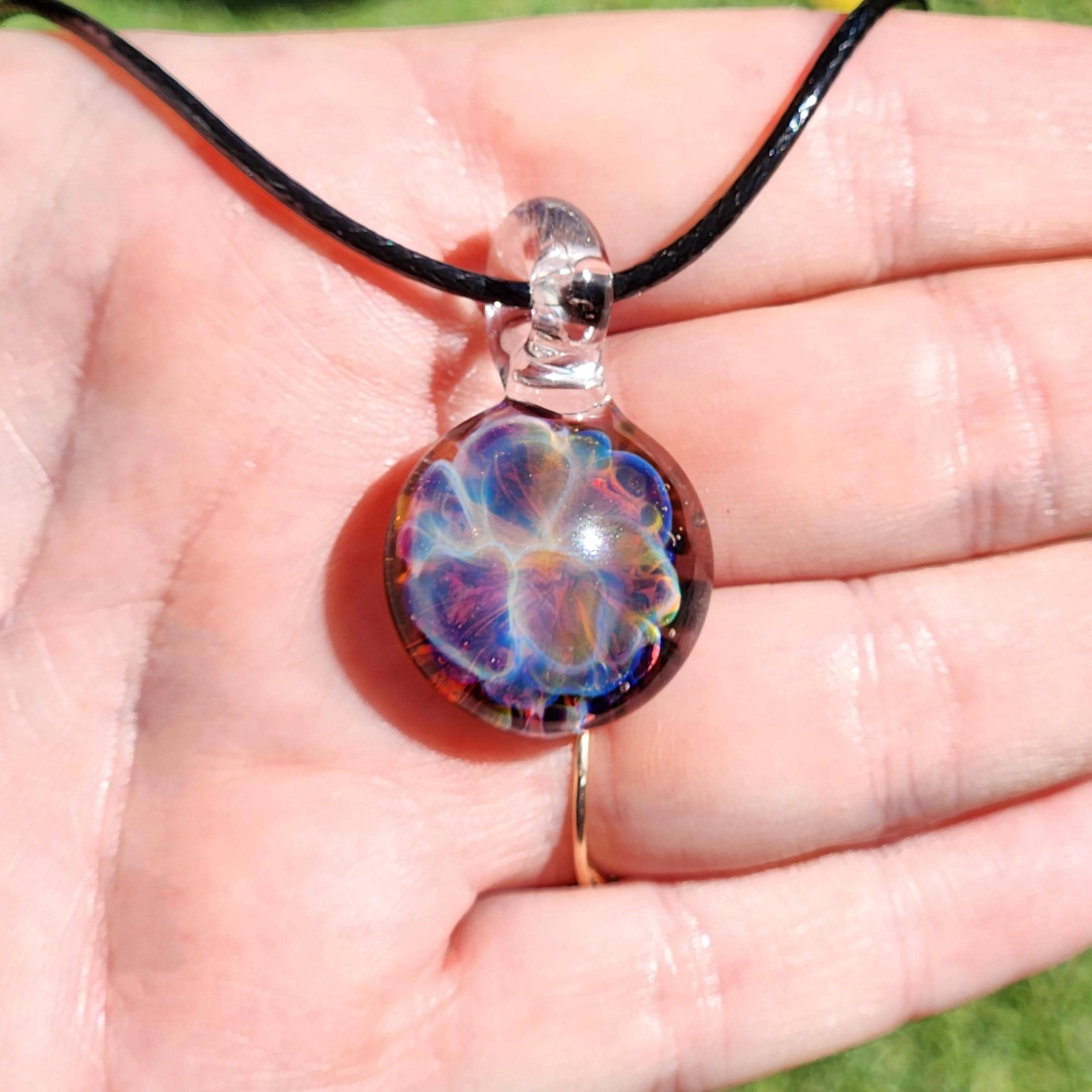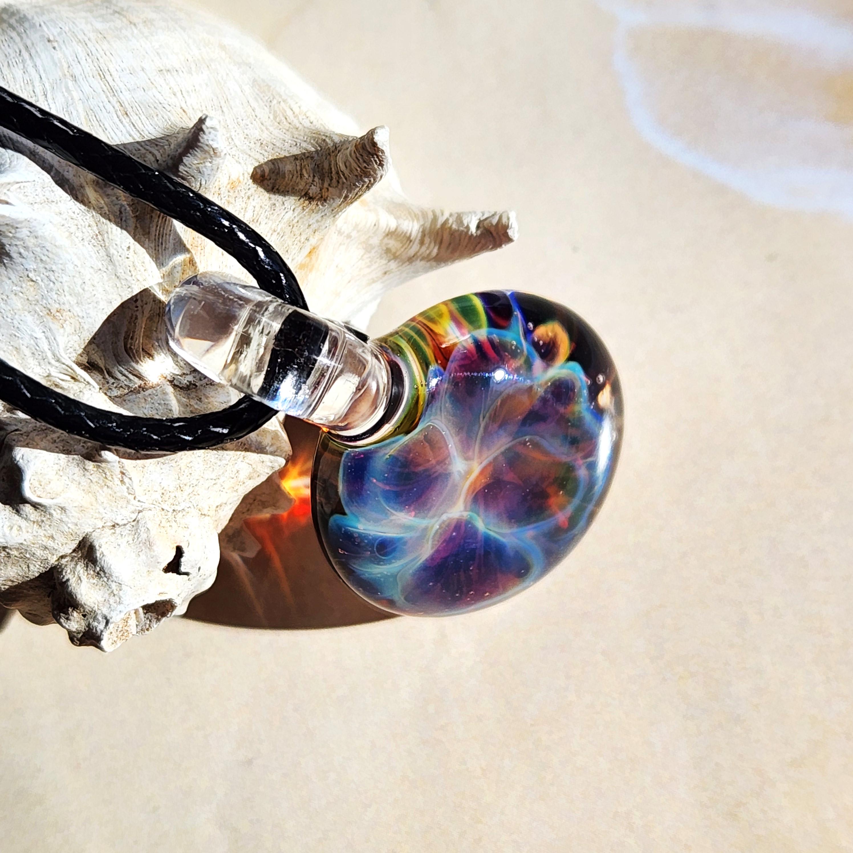 Made from high-quality borosilicate glass and kiln-annealed for durability, this pendant is both lightweight and comfortable to wear. Whether you're drawn to its trippy glass aesthetic, heady glass vibes, or artistic craftsmanship, this USA-made glass pendant necklace is a perfect addition to any jewelry collection.