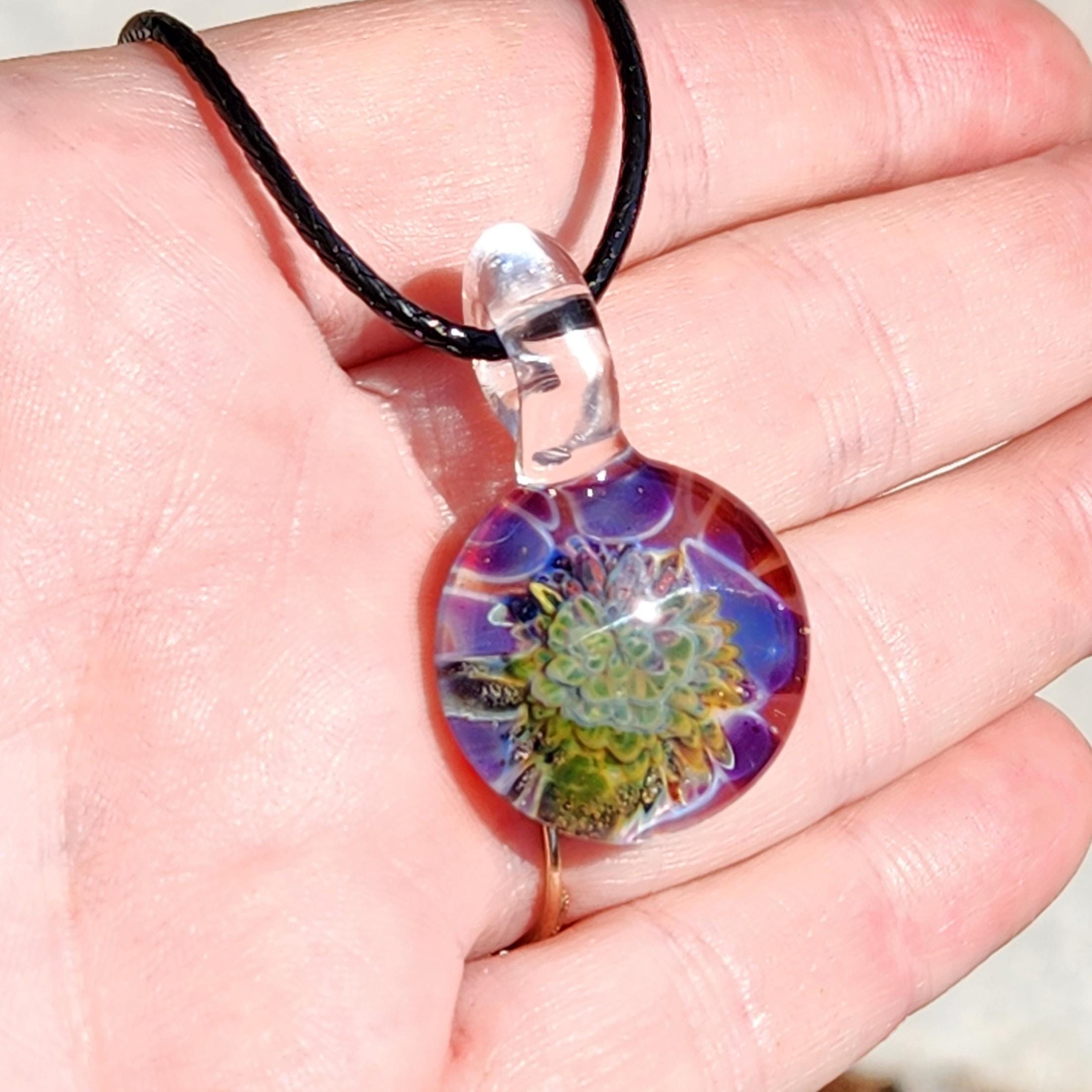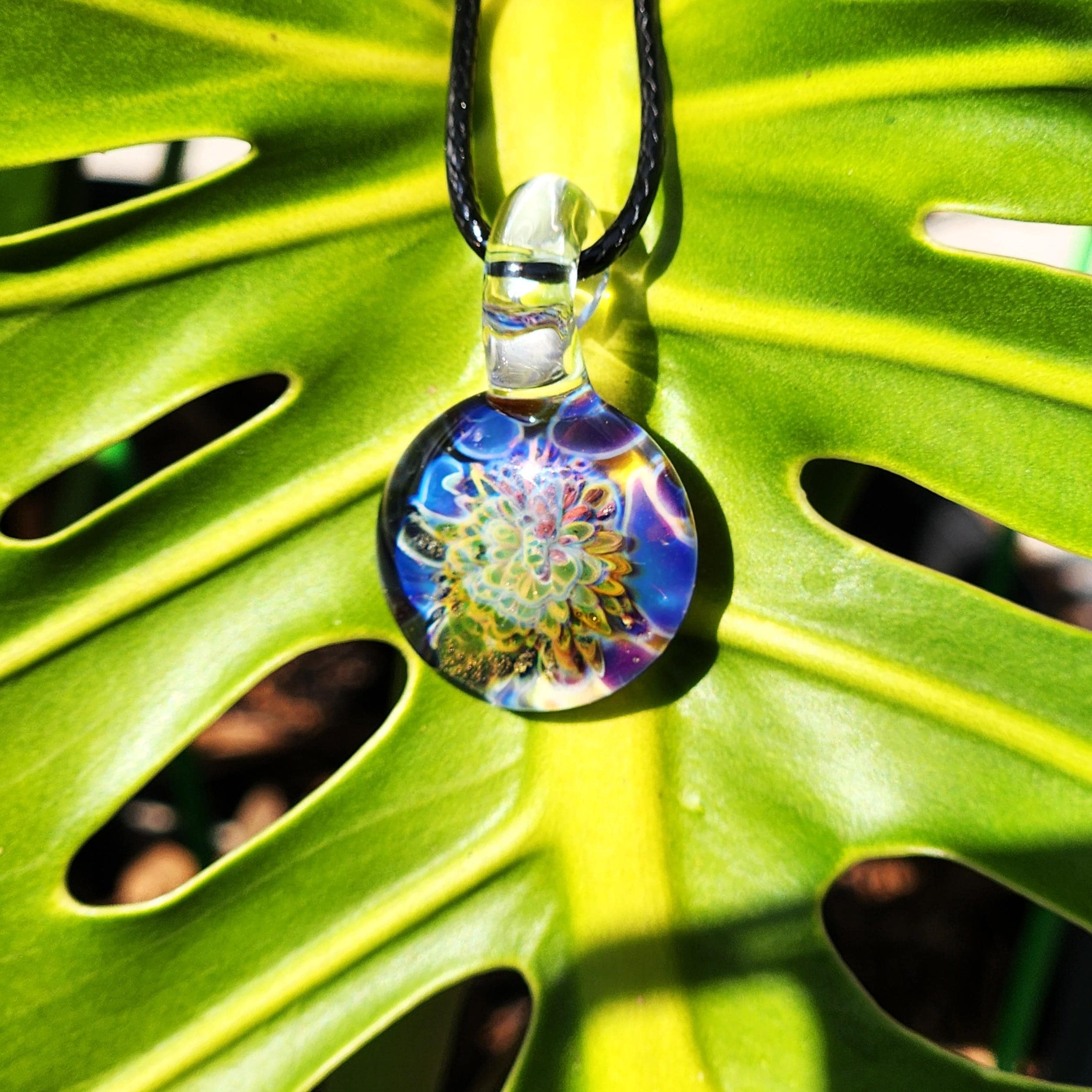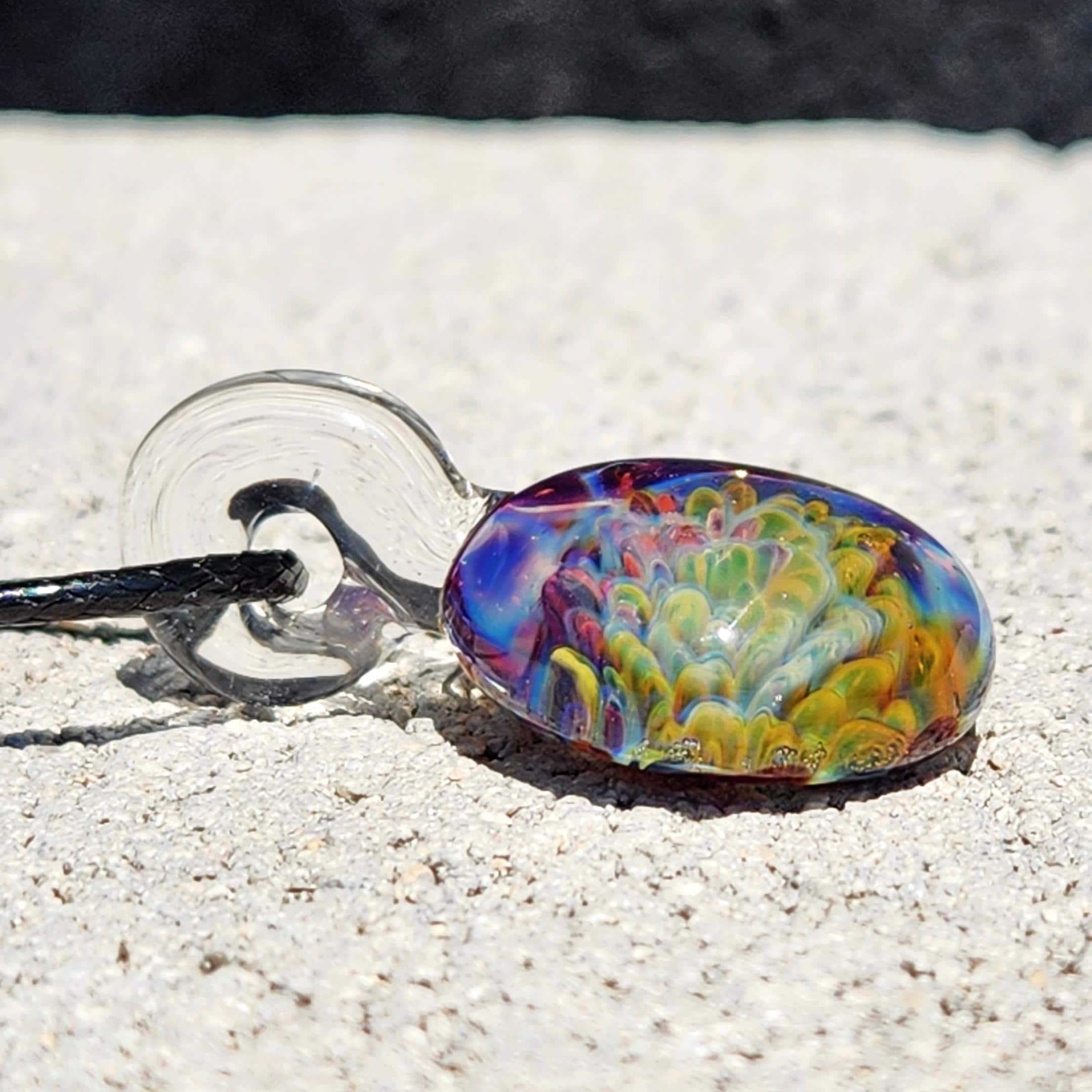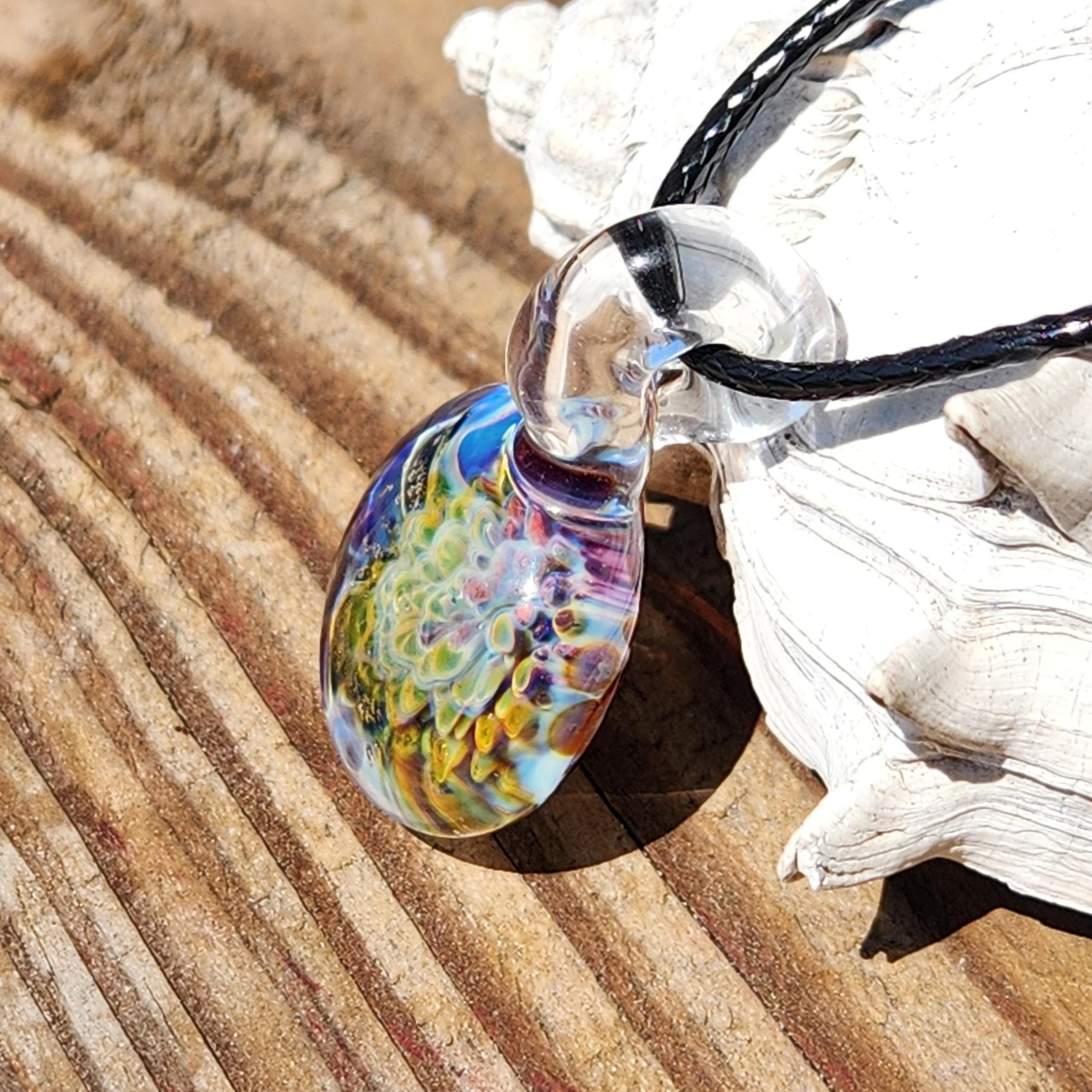 ✨ New Drop ✨ This bold green/yellow glass pendant is handmade from borosilicate glass and features a multicolor background in rich blues, purples and reds. It’s a small but powerful statement piece fiery, vibrant, and totally one of a kind.