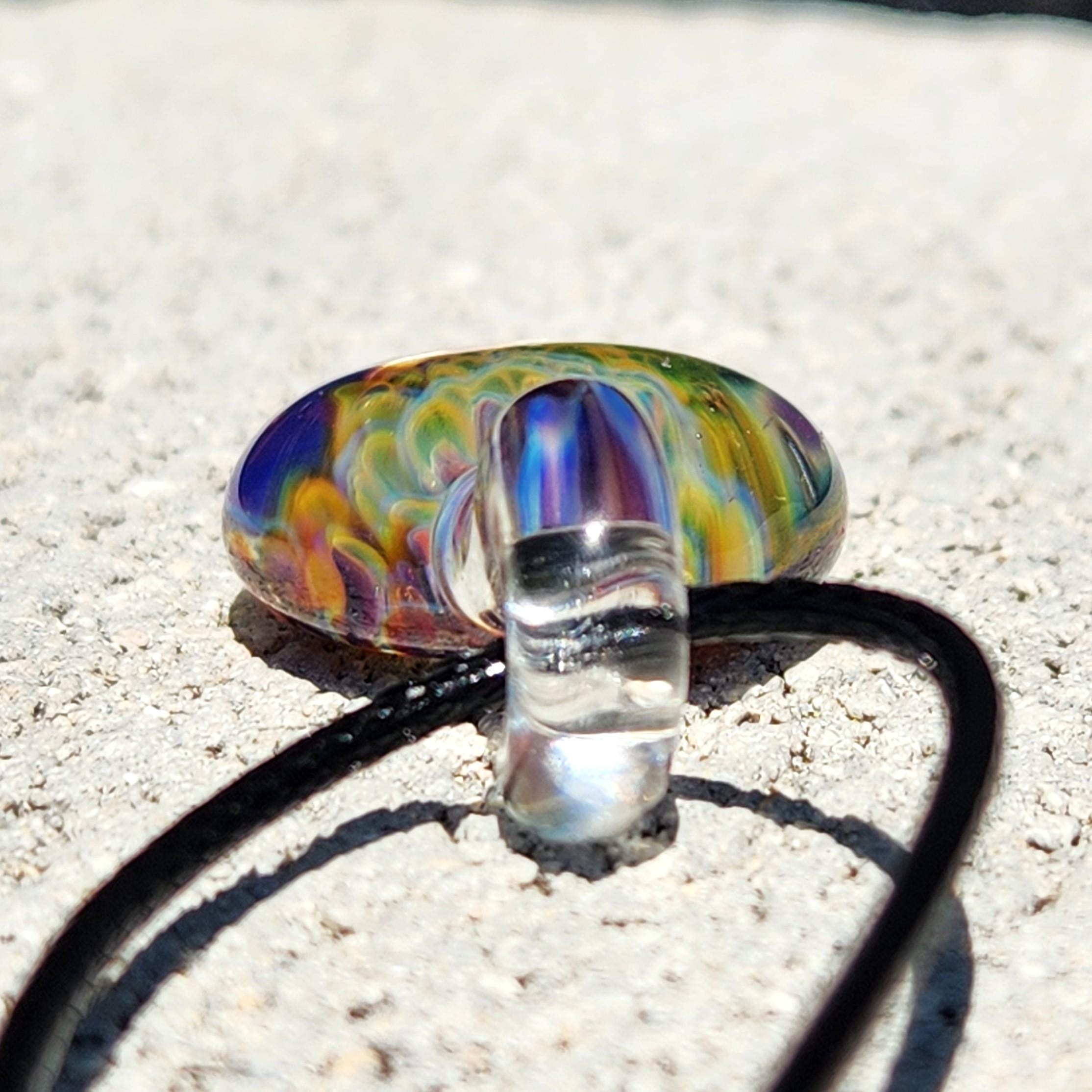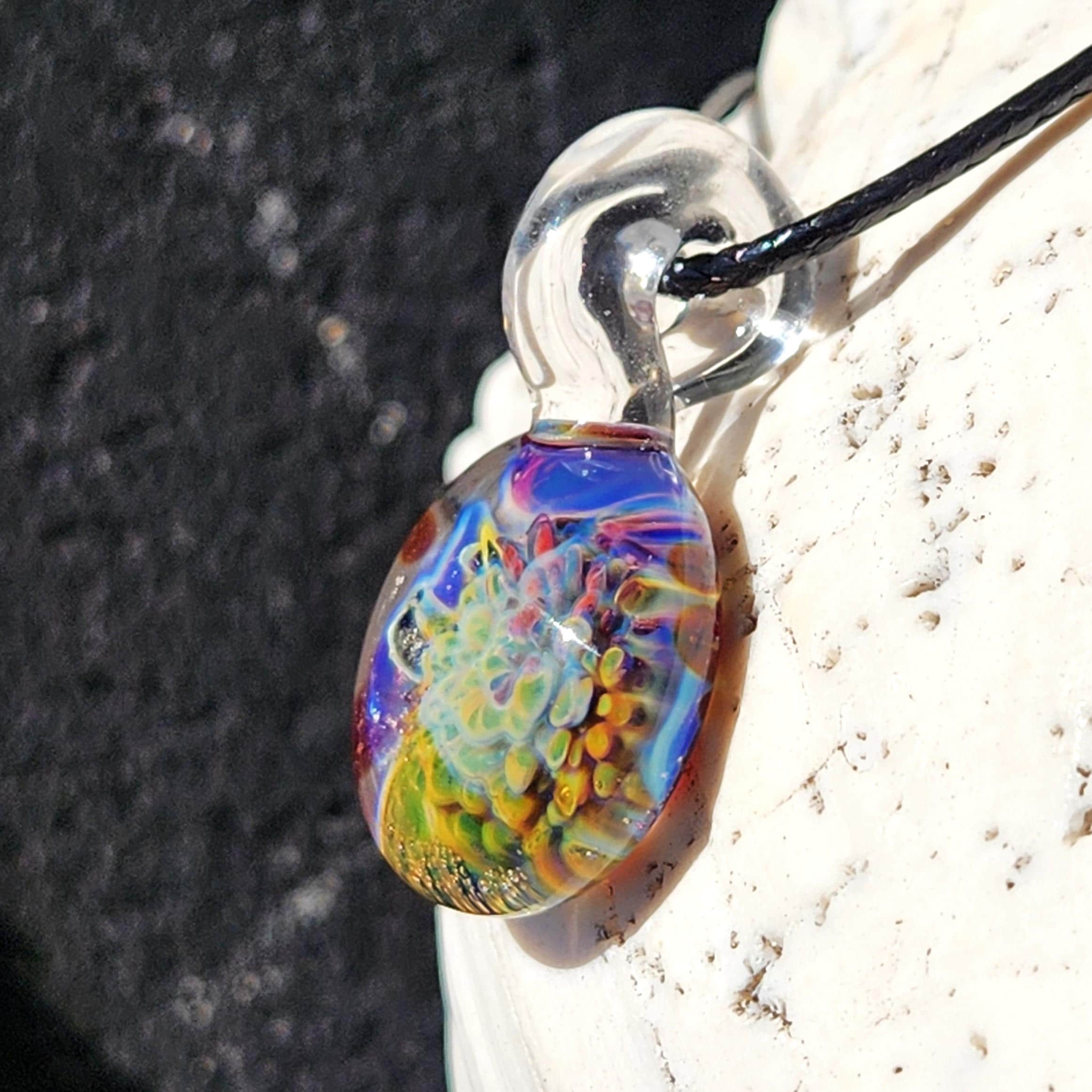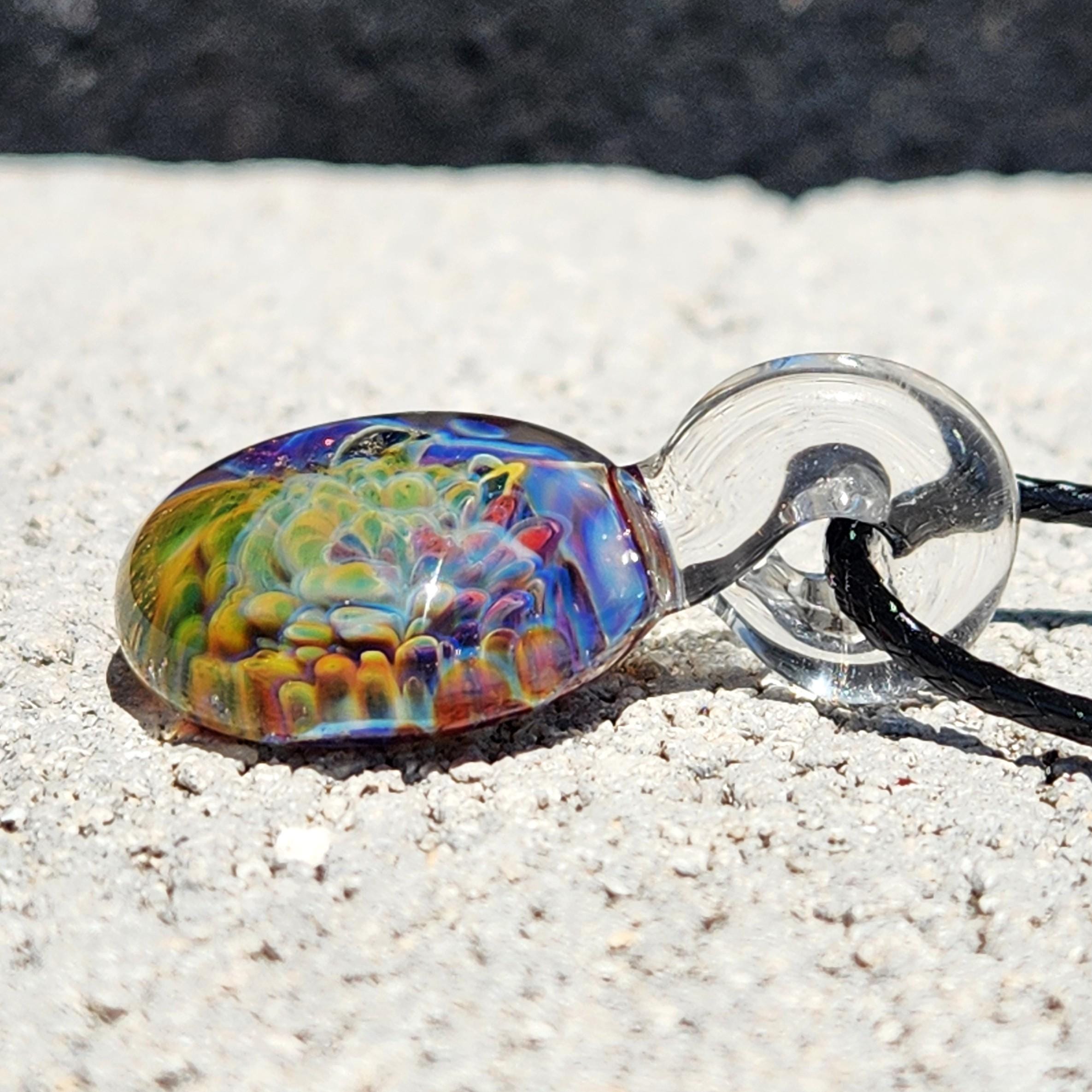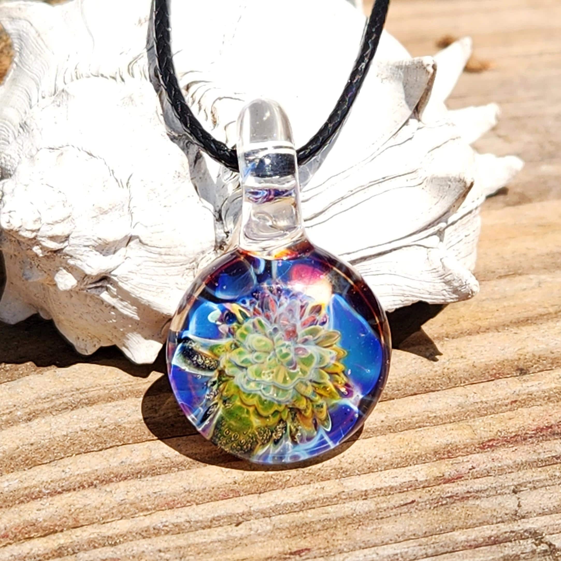 ✨ New Drop ✨ This bold green/yellow glass pendant is handmade from borosilicate glass and features a multicolor background in rich blues, purples and reds. It’s a small but powerful statement piece fiery, vibrant, and totally one of a kind.
