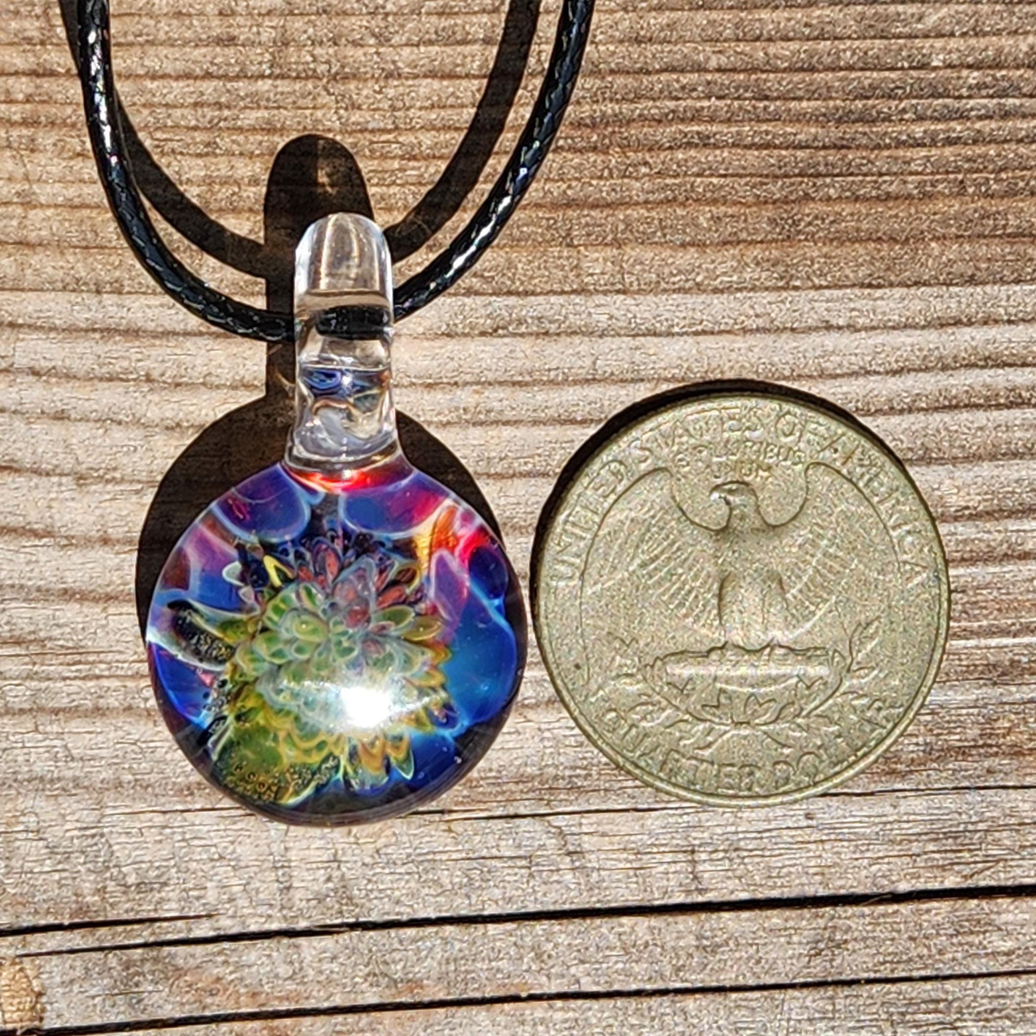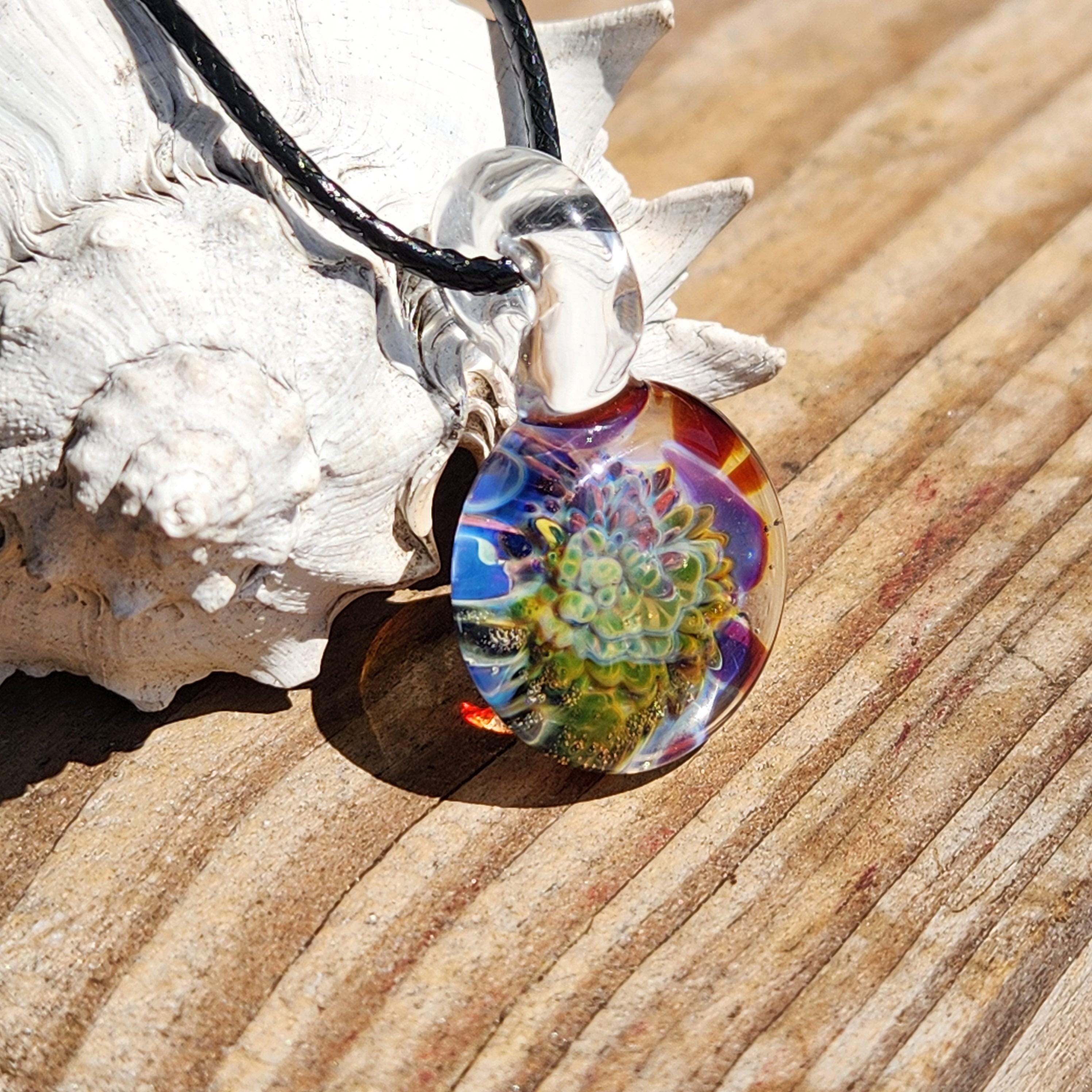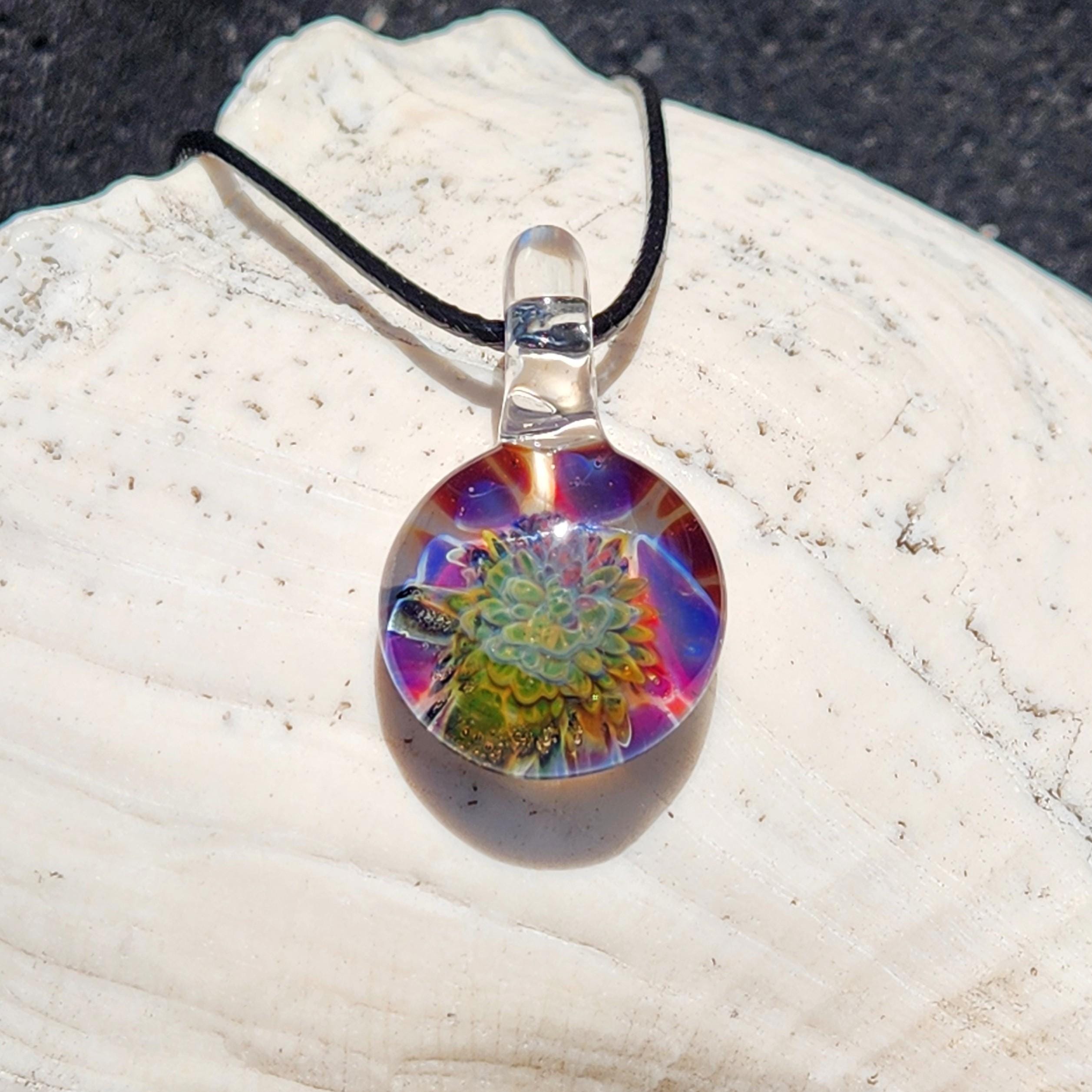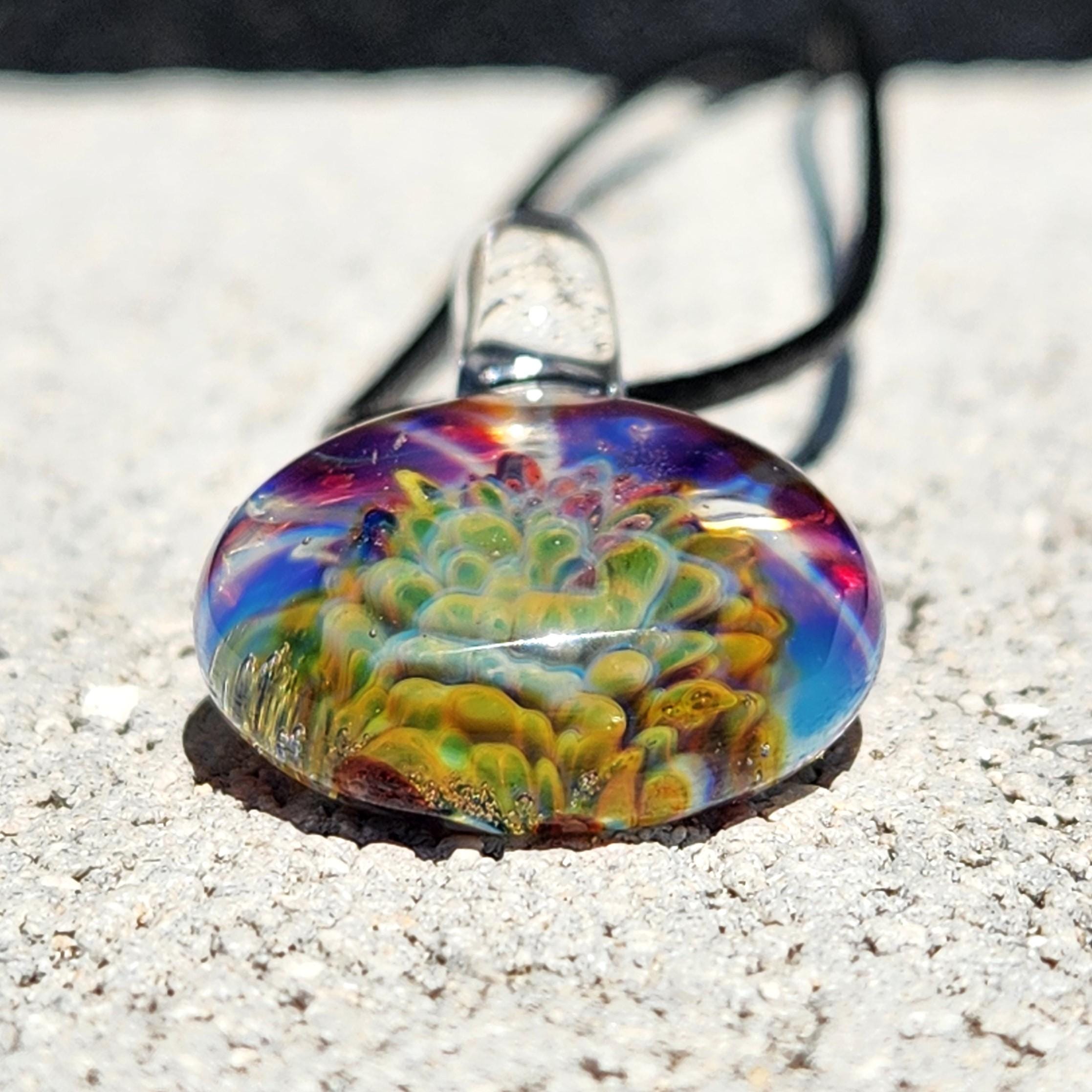 ✨ New Drop ✨ This bold green/yellow glass pendant is handmade from borosilicate glass and features a multicolor background in rich blues, purples and reds. It’s a small but powerful statement piece fiery, vibrant, and totally one of a kind.