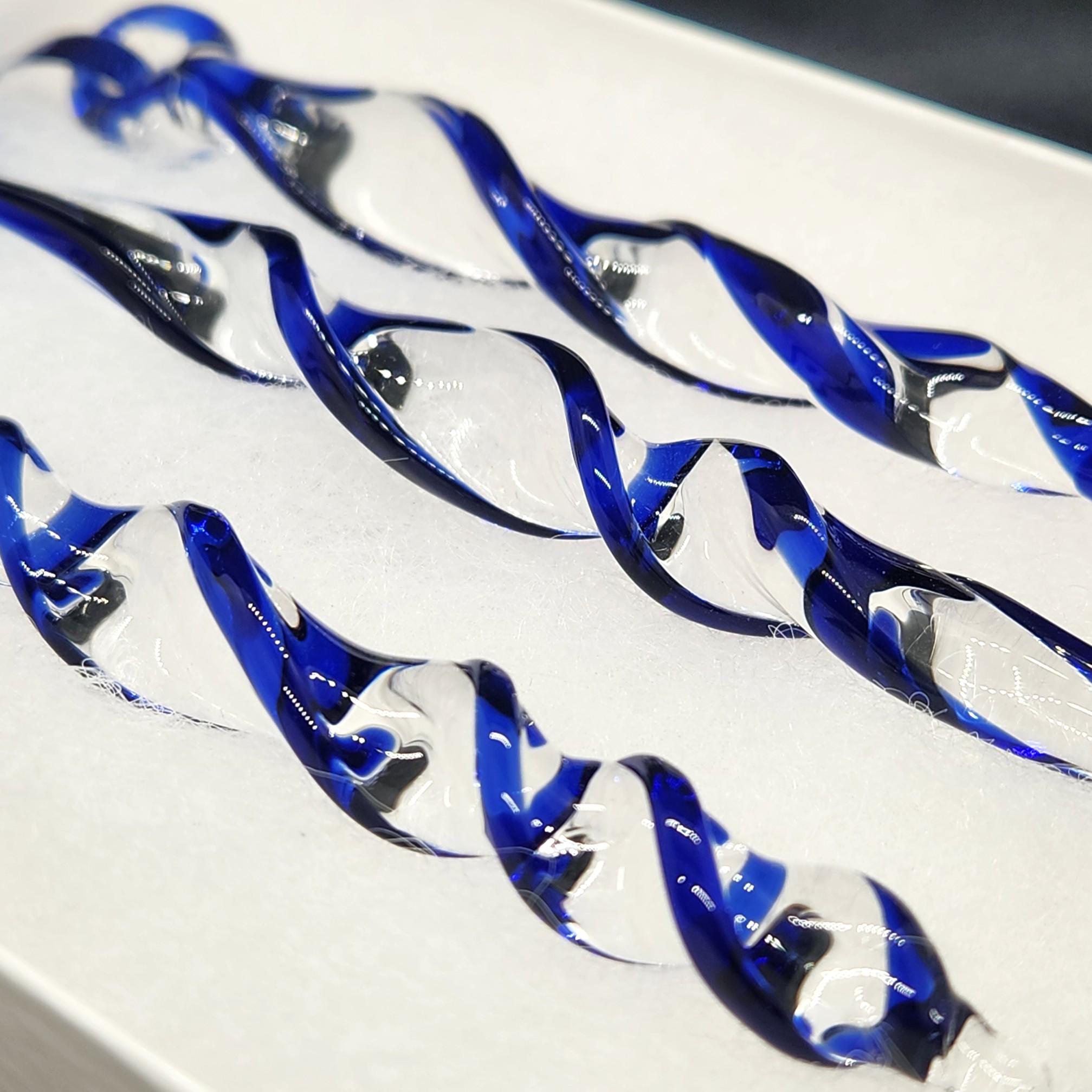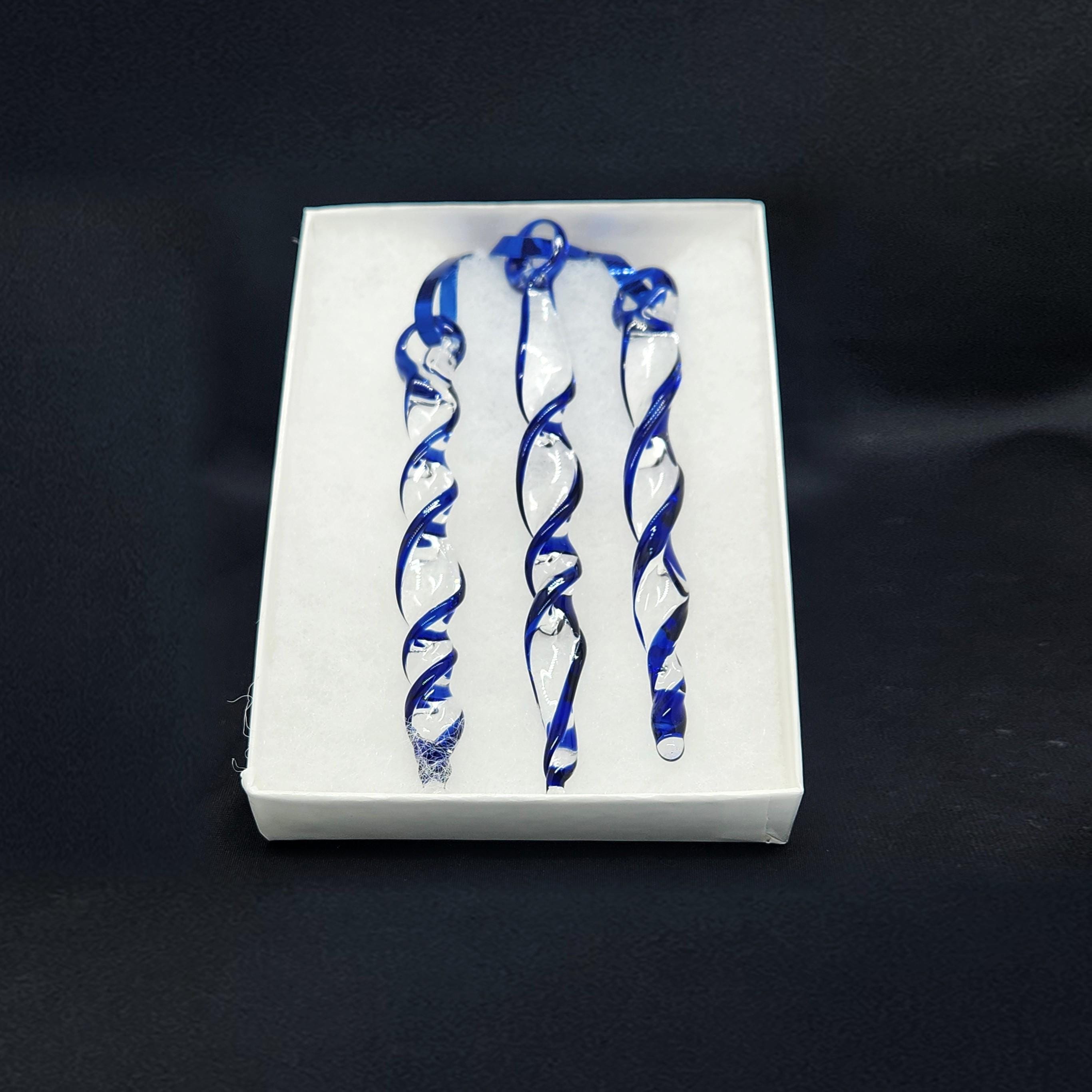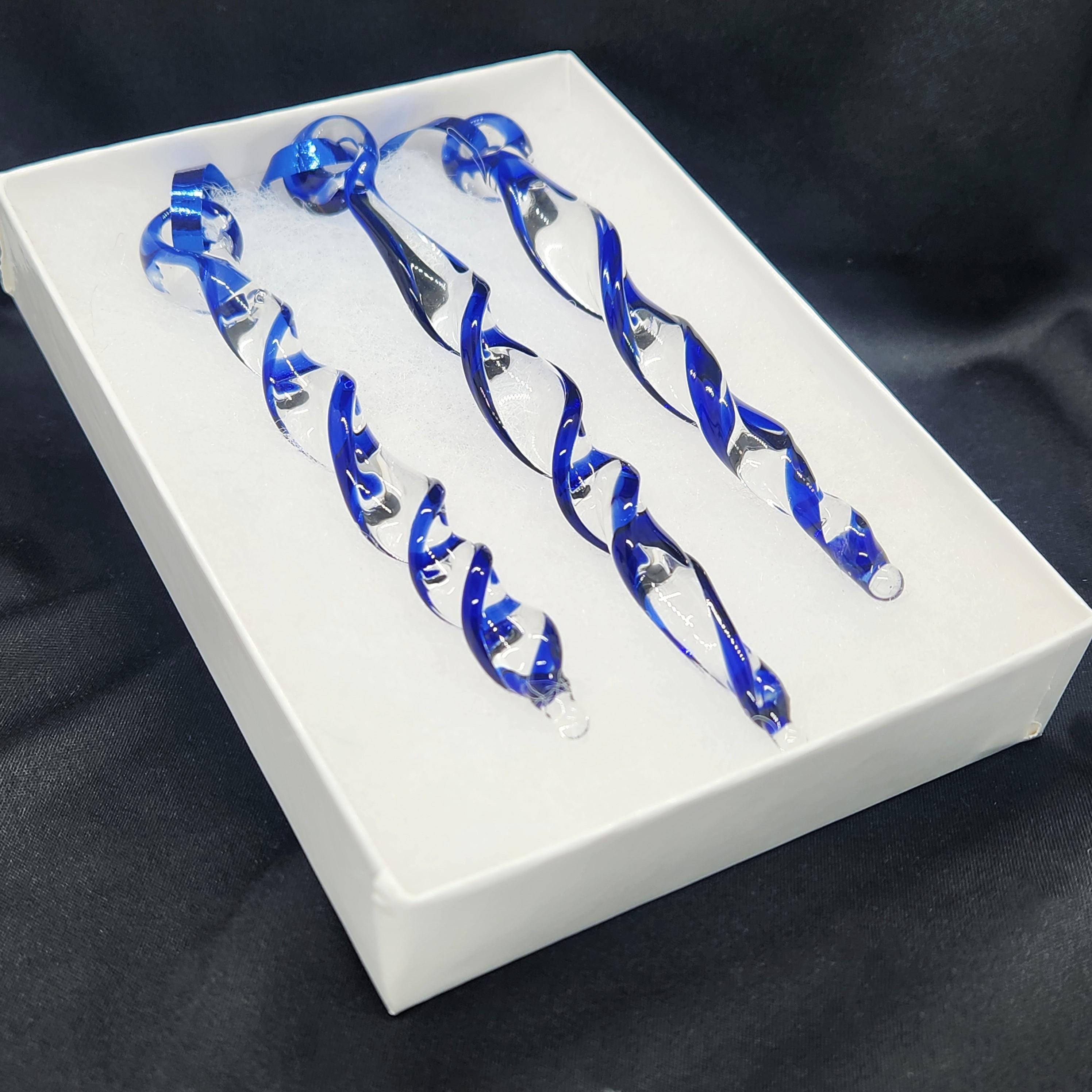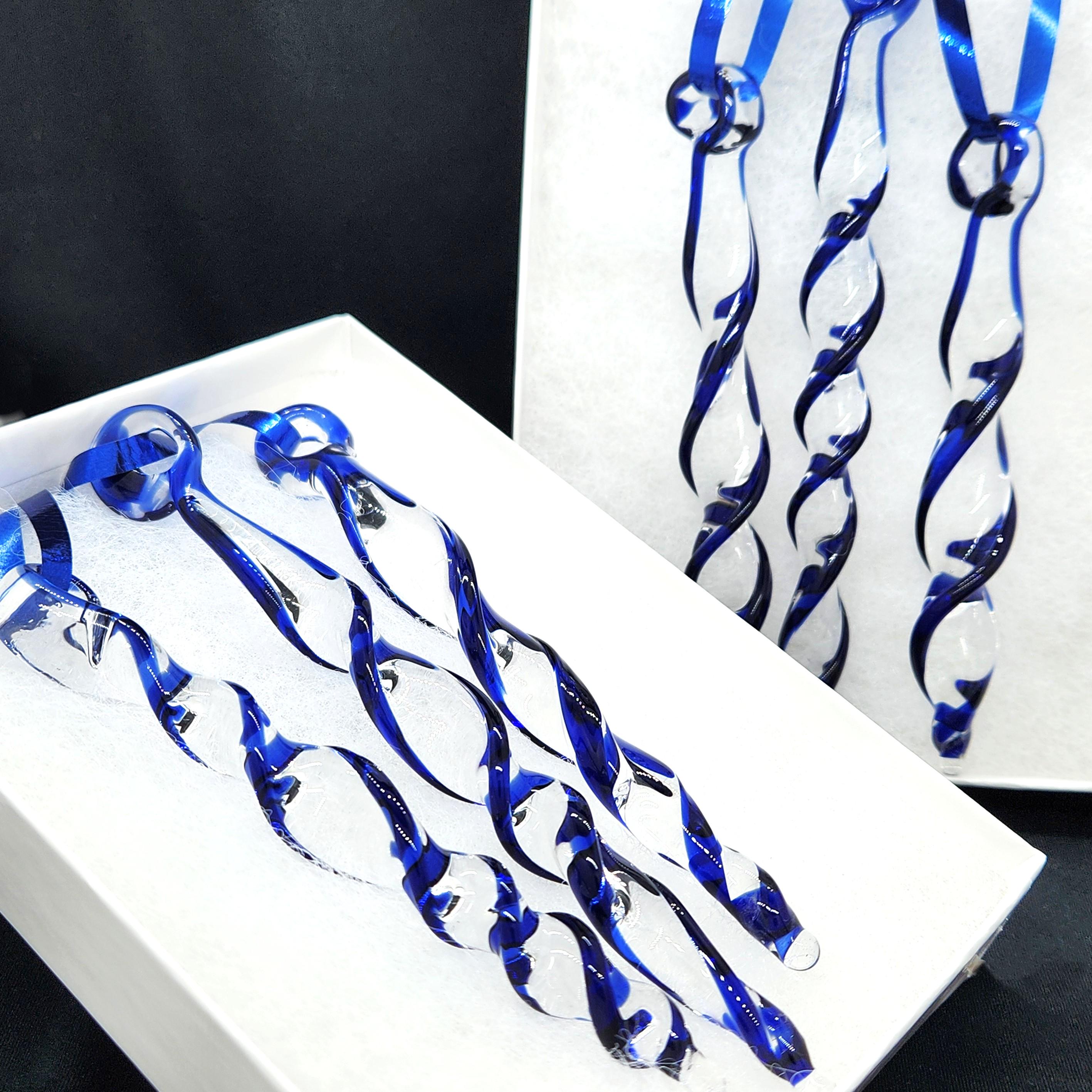 Add a sparkling twist to your holiday and home decor with this set of three handmade blue glass icicles! Each ornament is crafted from durable borosilicate glass (Pyrex) and individually hand-twisted with deep cobalt blue spirals that shimmer in the light. Send us a note for custom colors