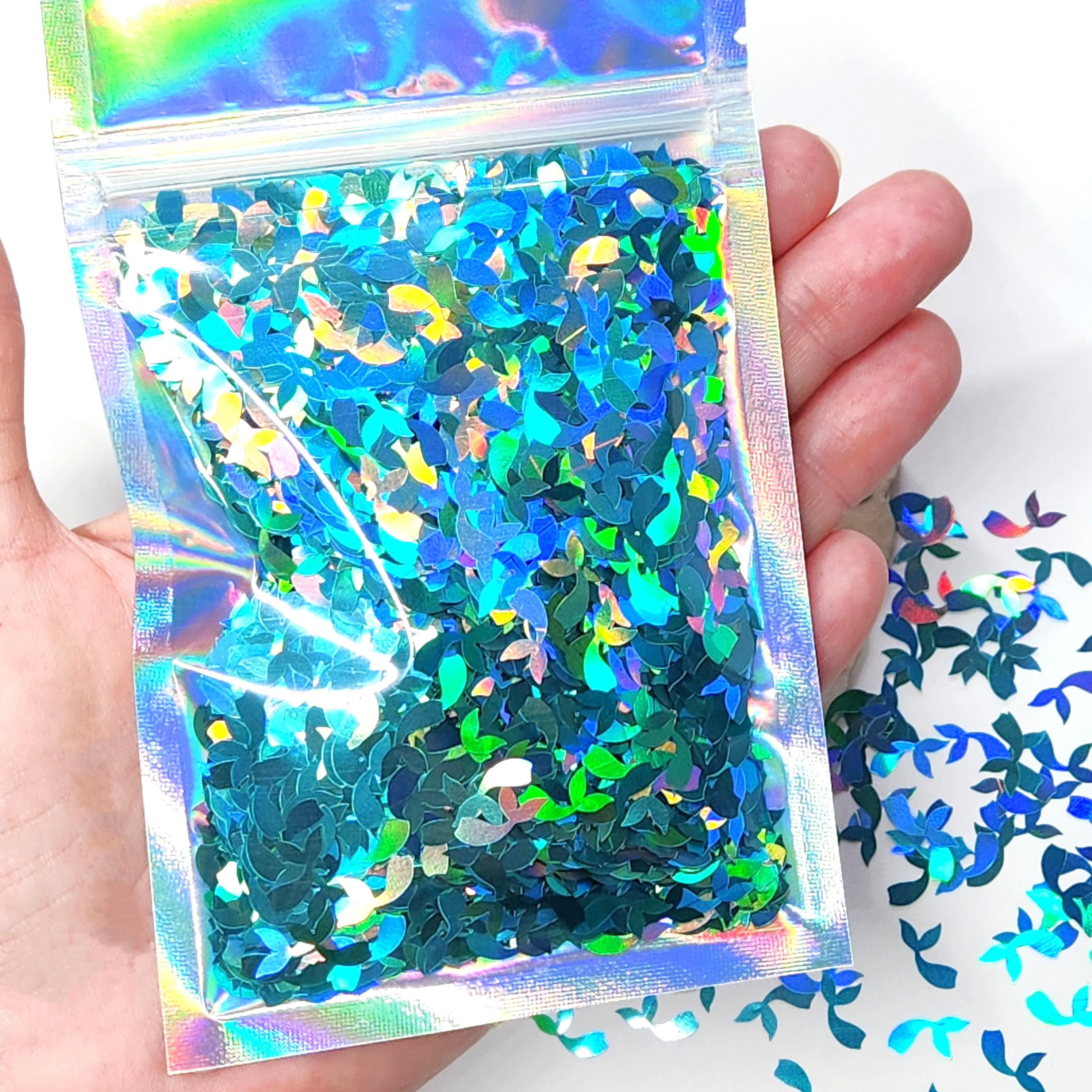 Are Mermaids real? Aqua holographic mermaids tail glitter in a size 8mm. Comes in a20 gram bag. Great for arts, crafts, nail art, diy projects, shakers, charms, etc.