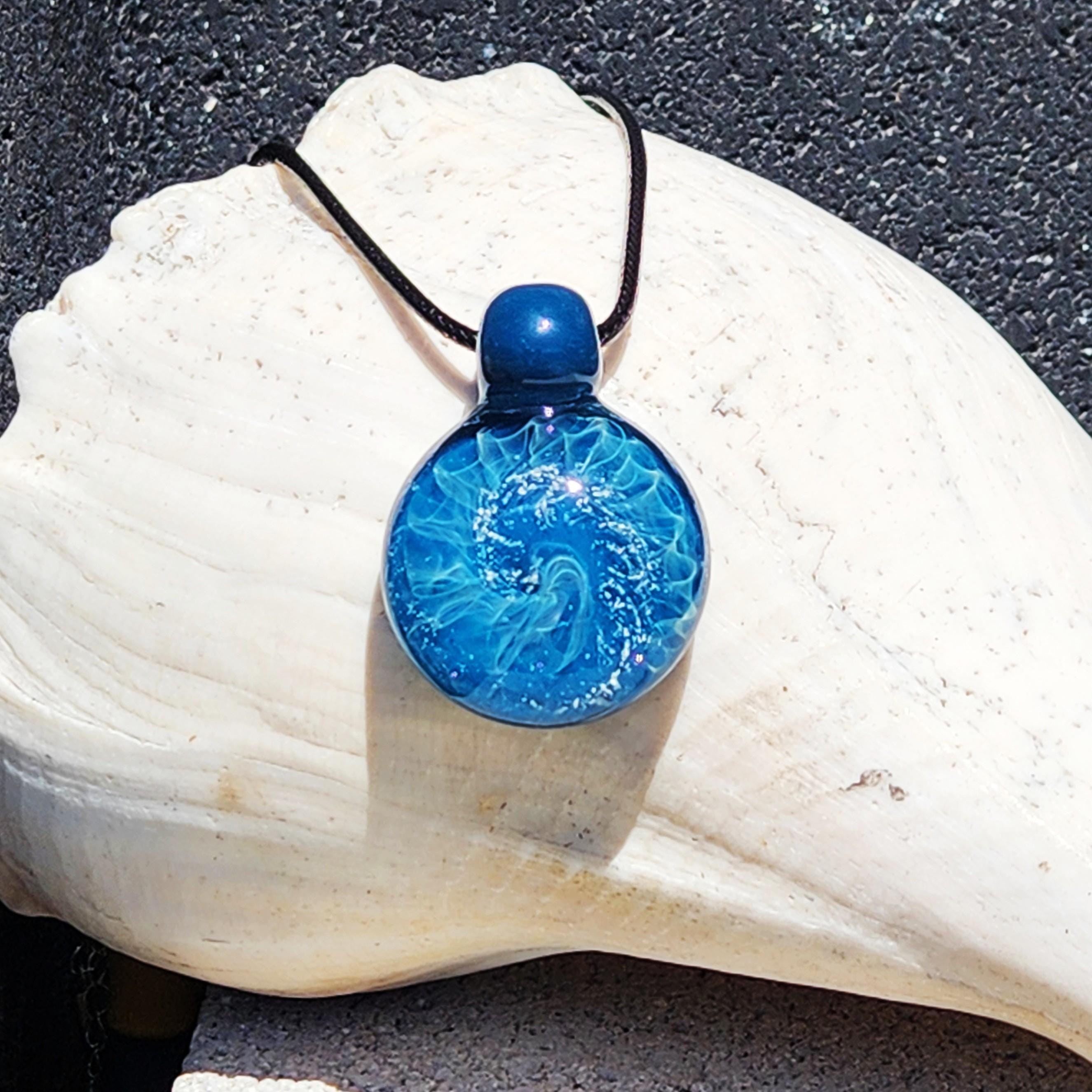 Carry the beauty of the ocean wherever you go with this one-of-a-kind glass pendant. Handmade from borosilicate glass, it features swirling wave-like patterns in deep ocean blue, accented with sparkling silver dichroic glass and the shimmer of pure silver fuming.