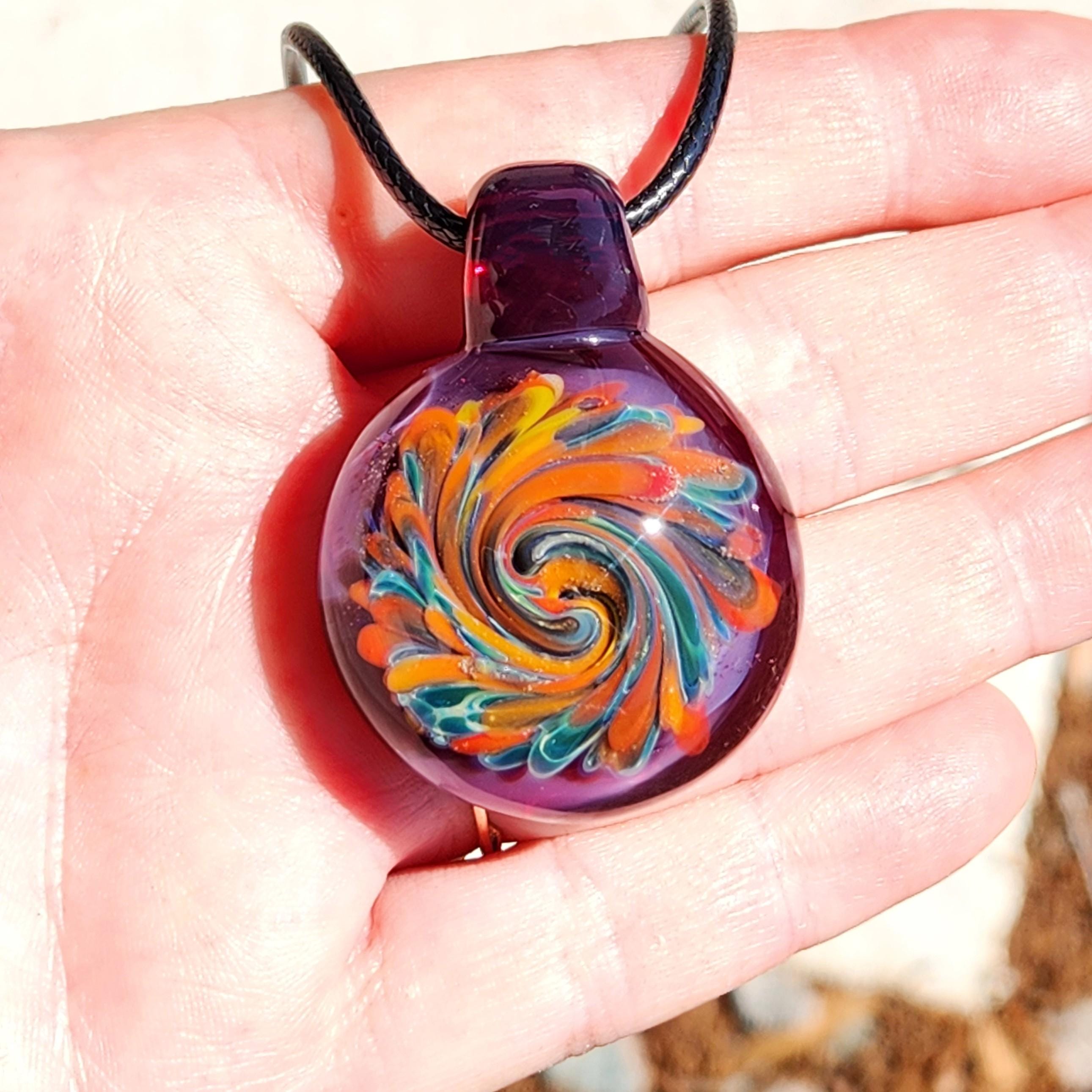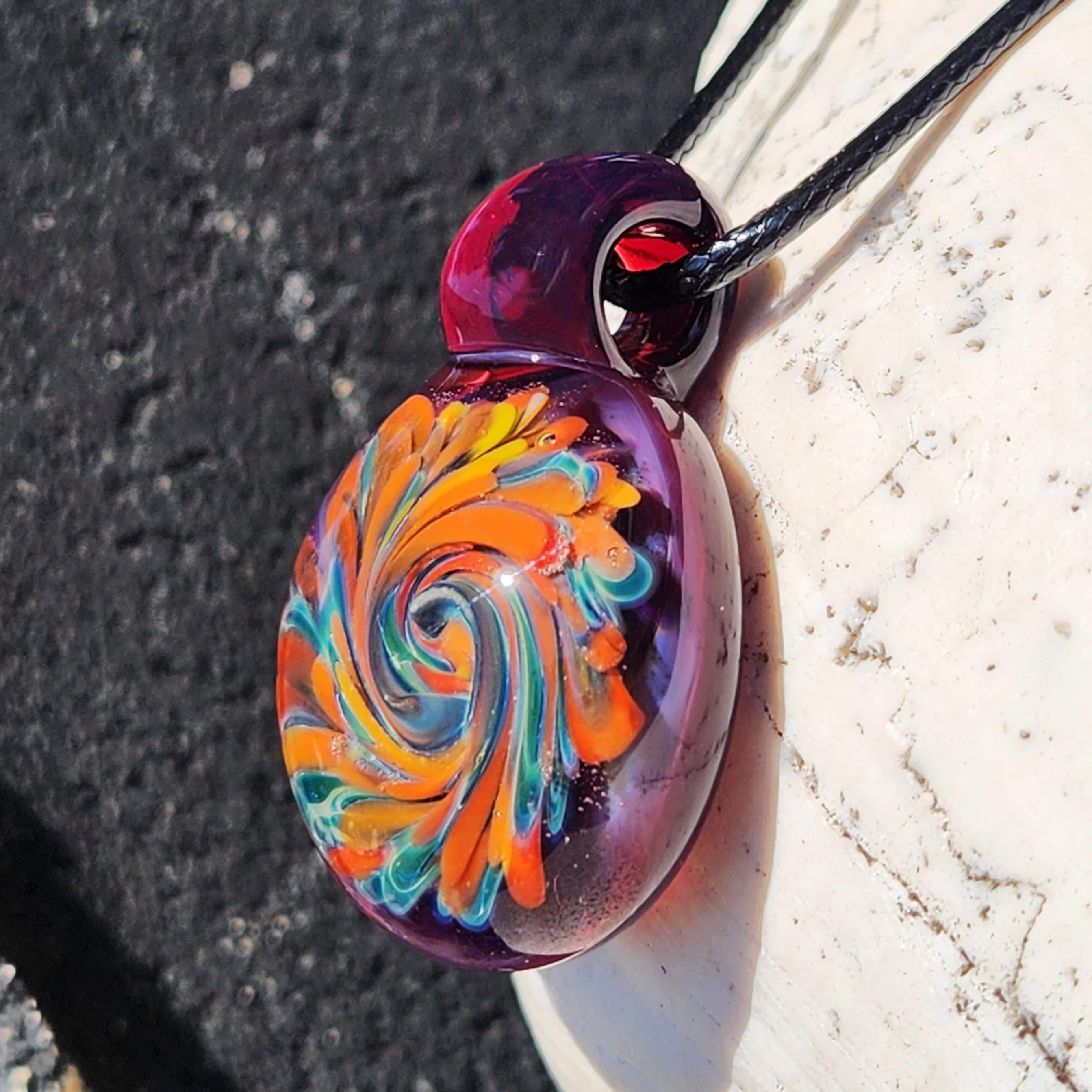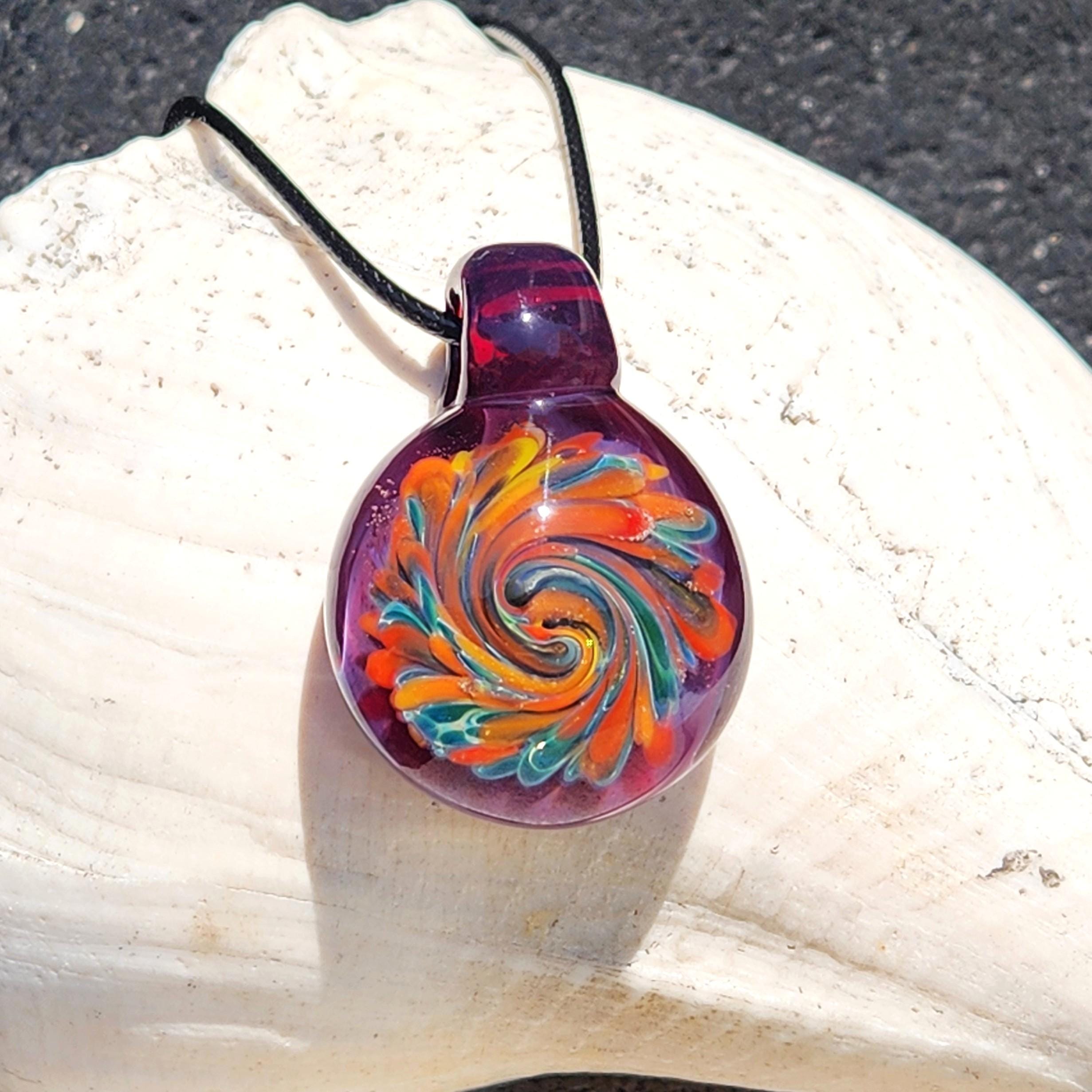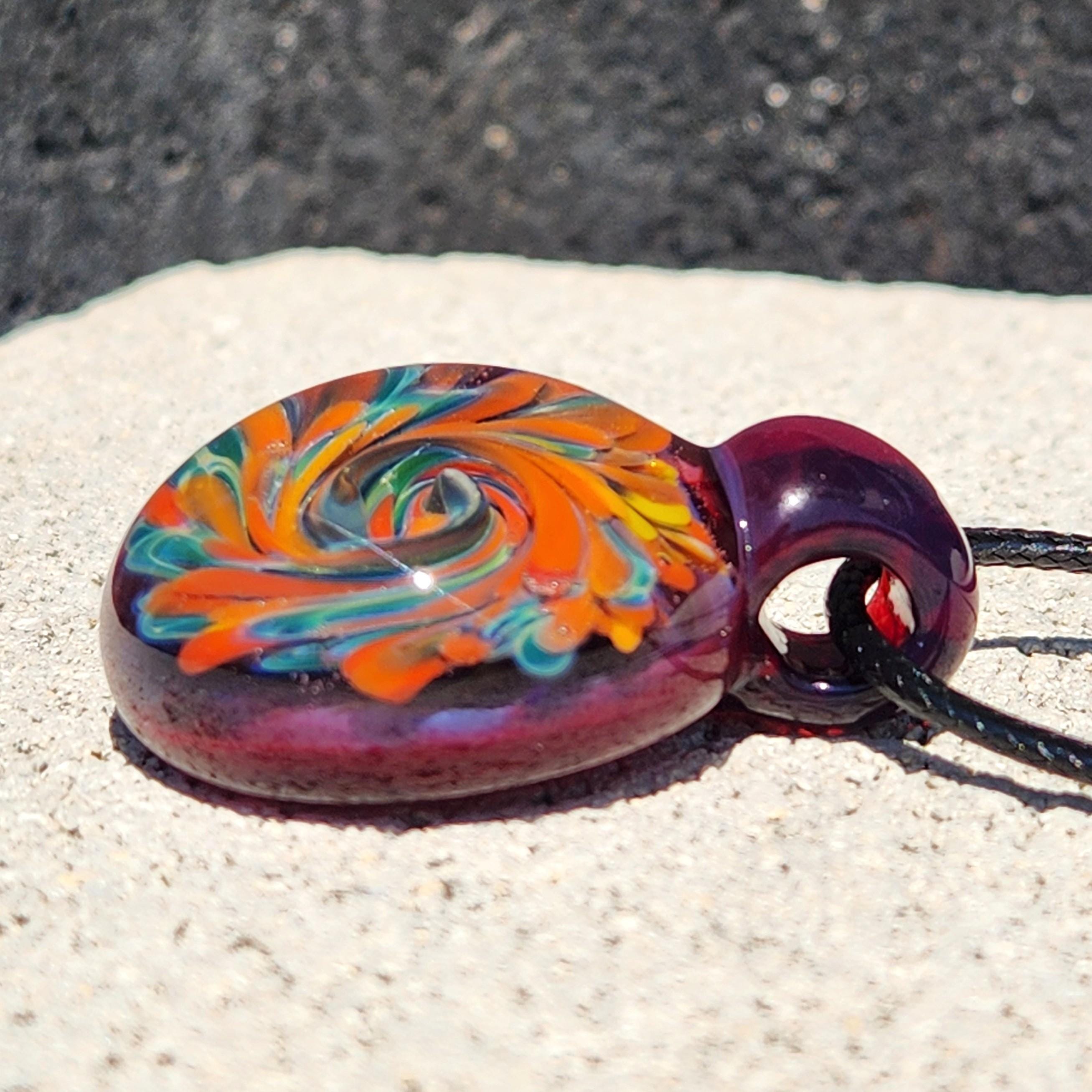 Borosilicate glass pendant necklace featuring a colorful swirl design on a deep purple and burgundy background. This handmade glass pendant blends vibrant orange, teal, and yellow tones into a dynamic spiral, creating a bold and unique piece of wearable art.