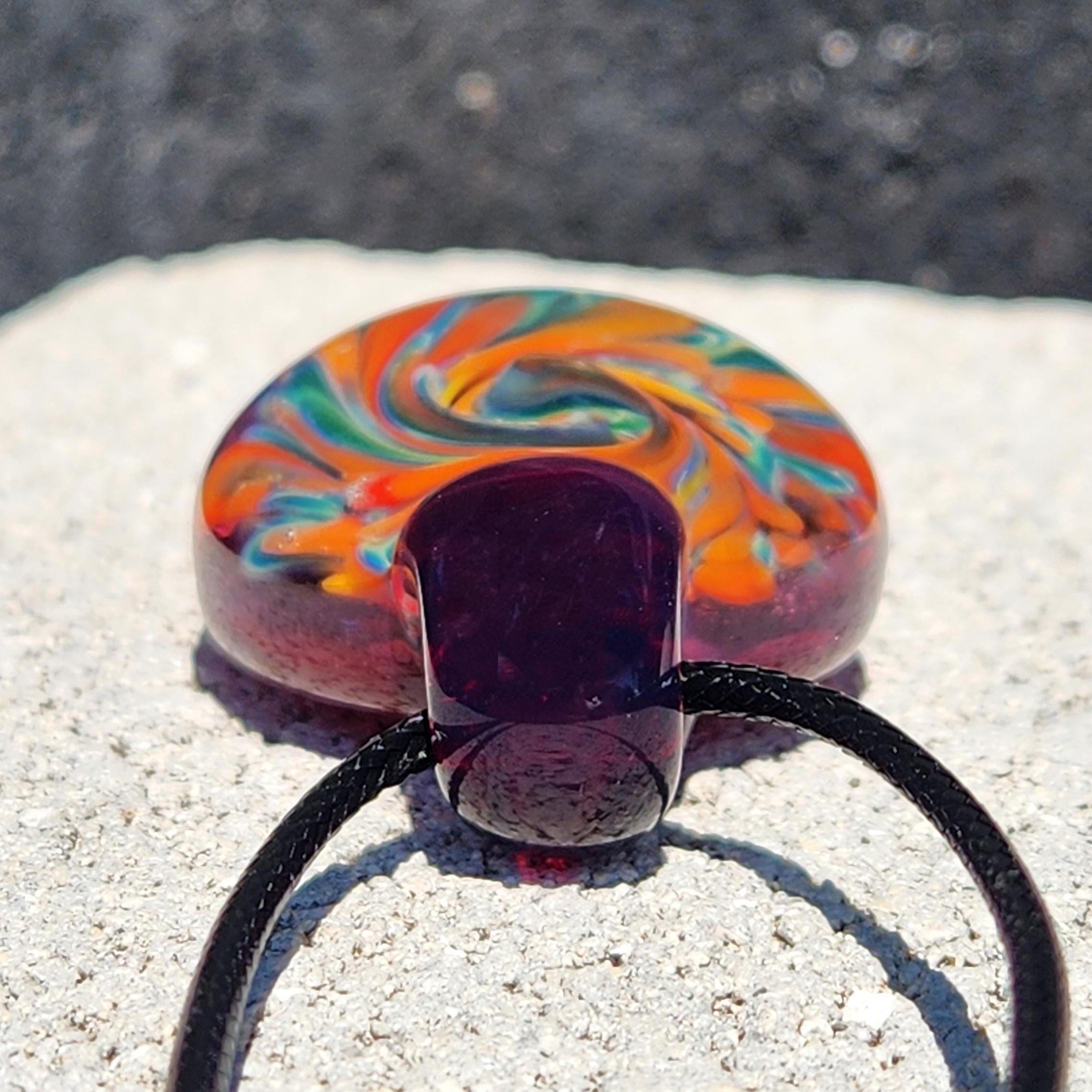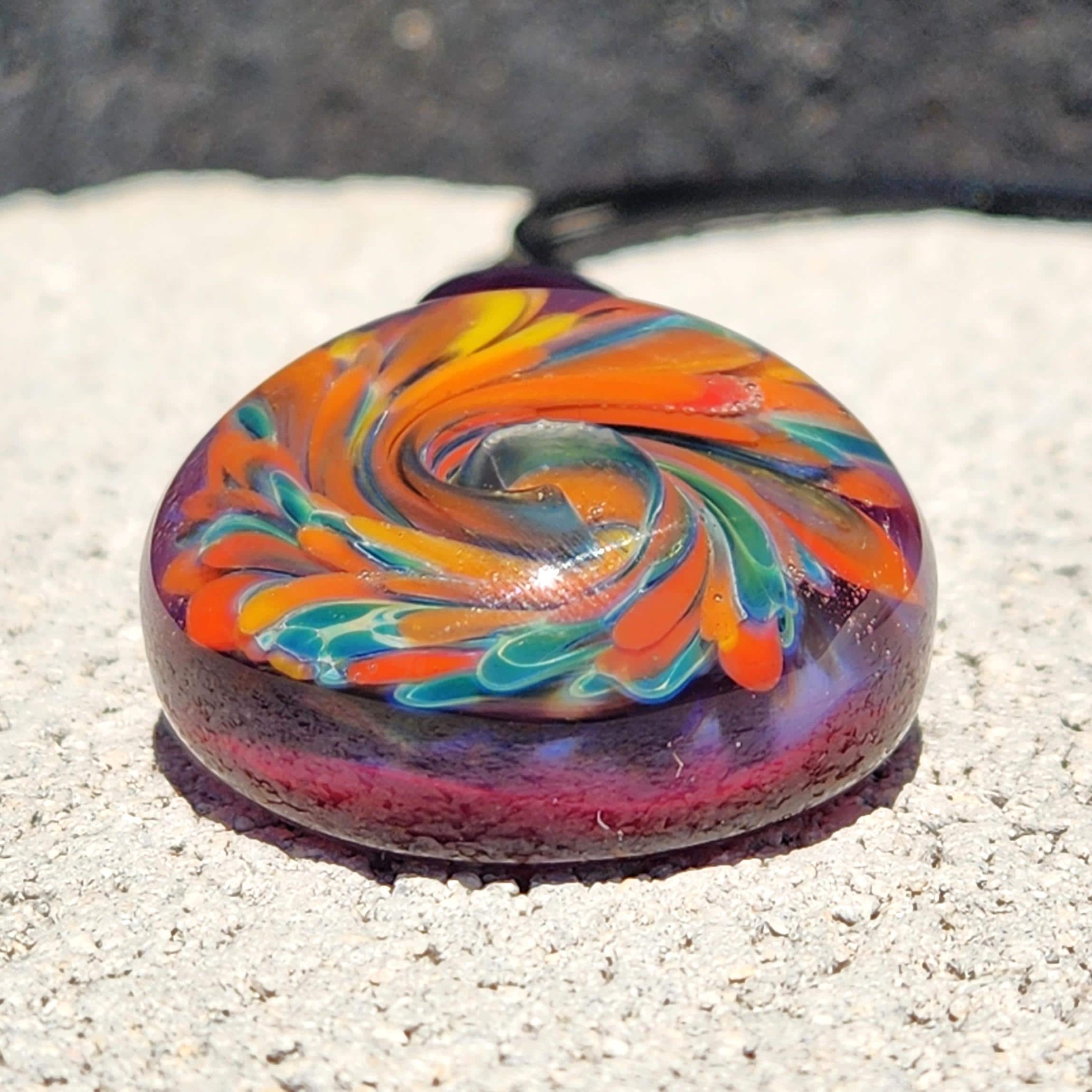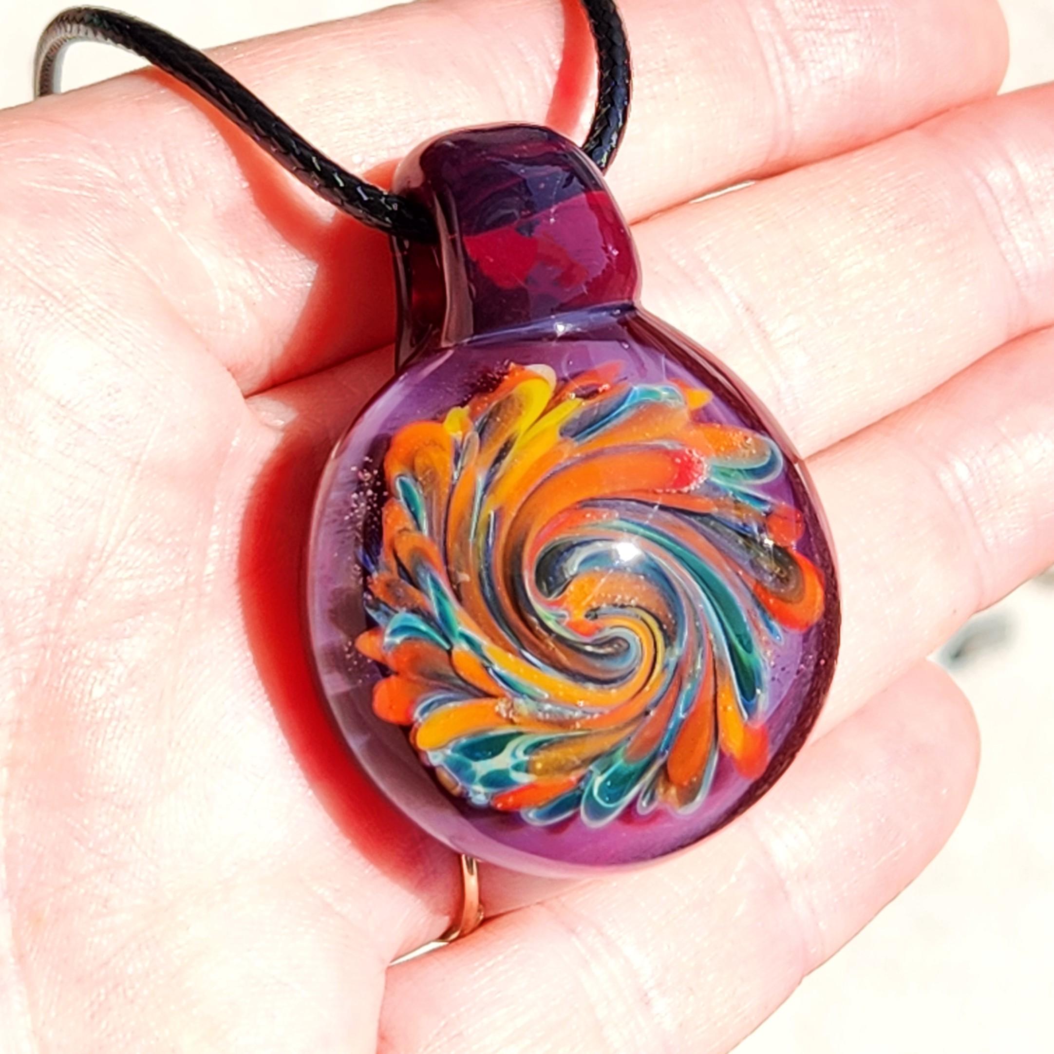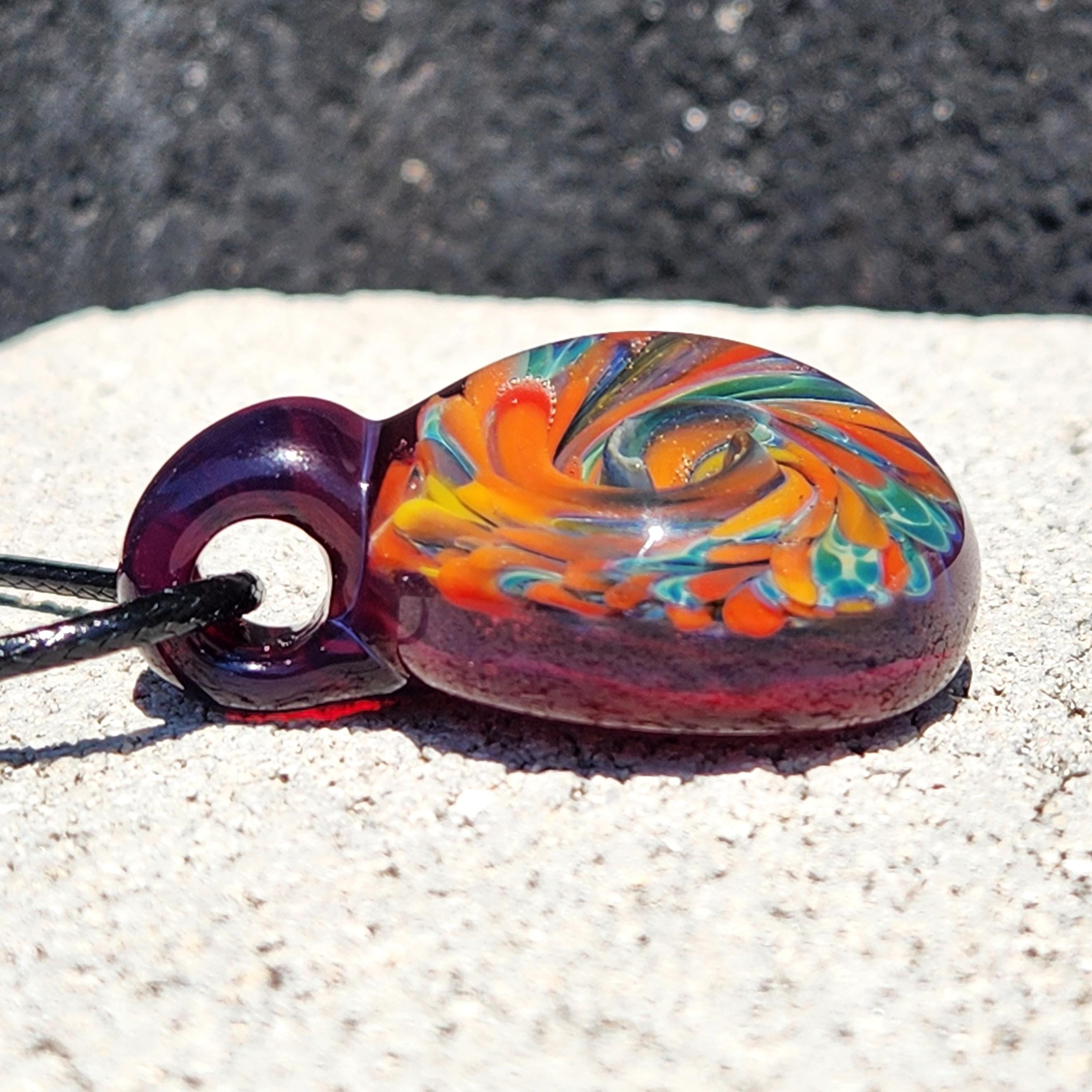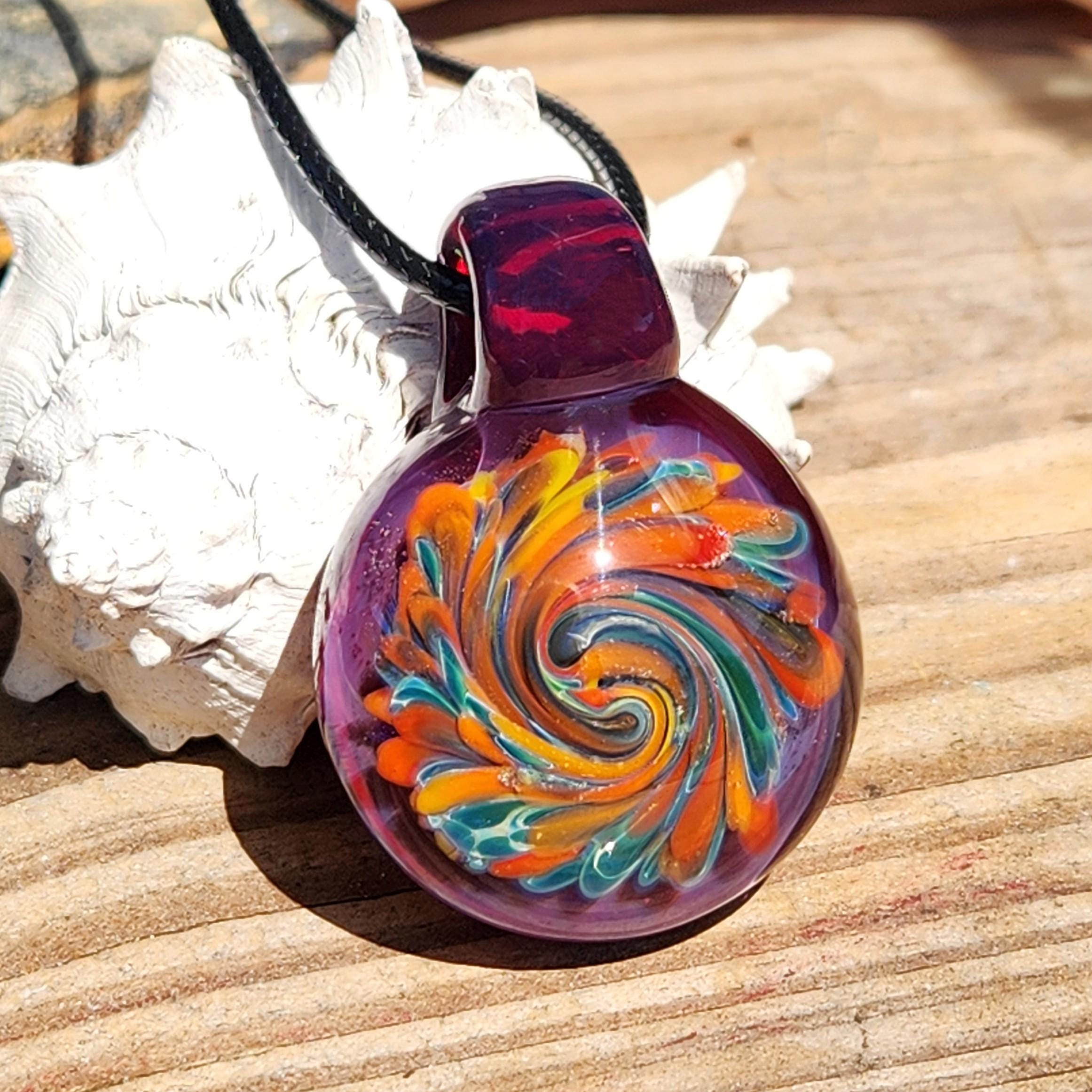 Borosilicate glass pendant necklace featuring a colorful swirl design on a deep purple and burgundy background. This handmade glass pendant blends vibrant orange, teal, and yellow tones into a dynamic spiral, creating a bold and unique piece of wearable art.