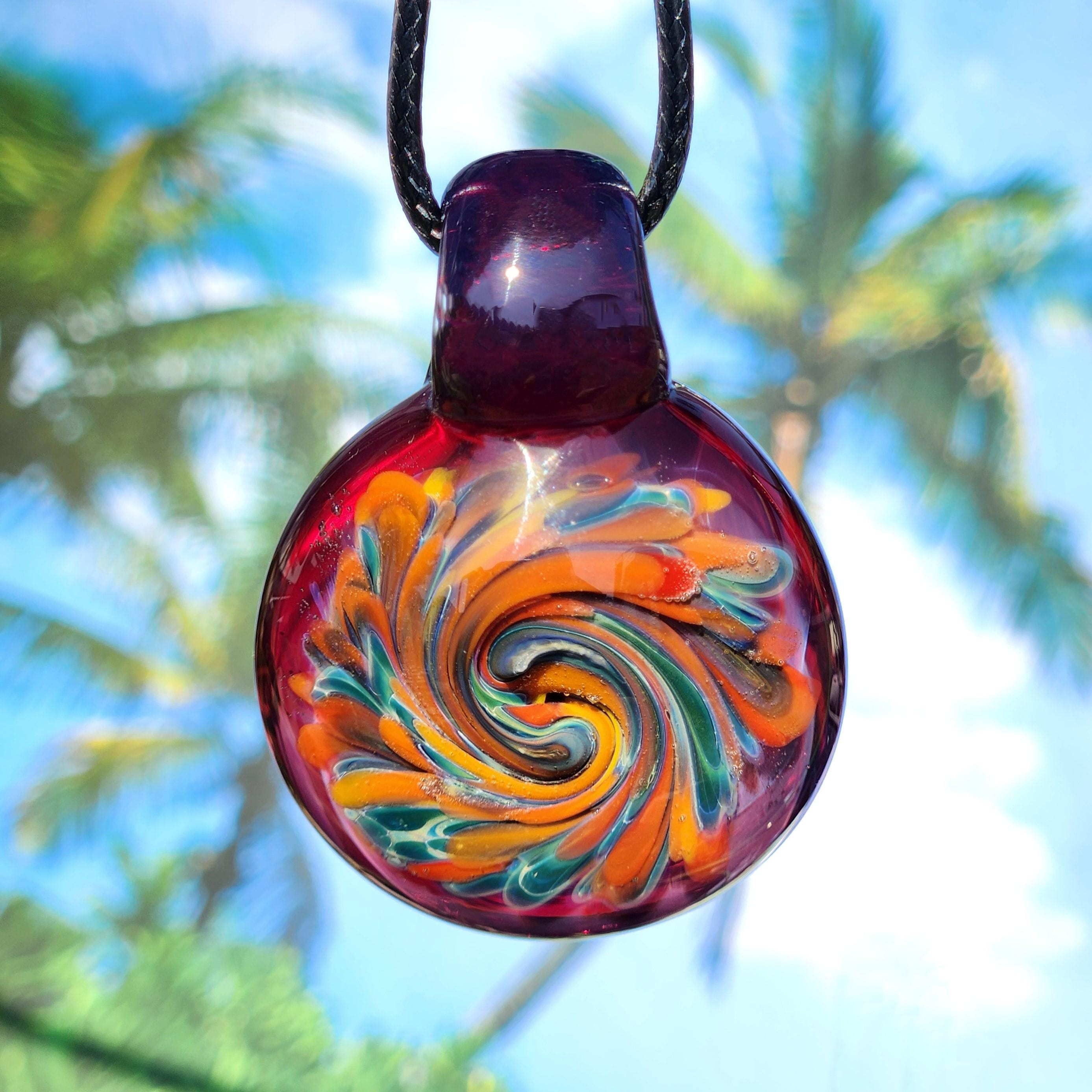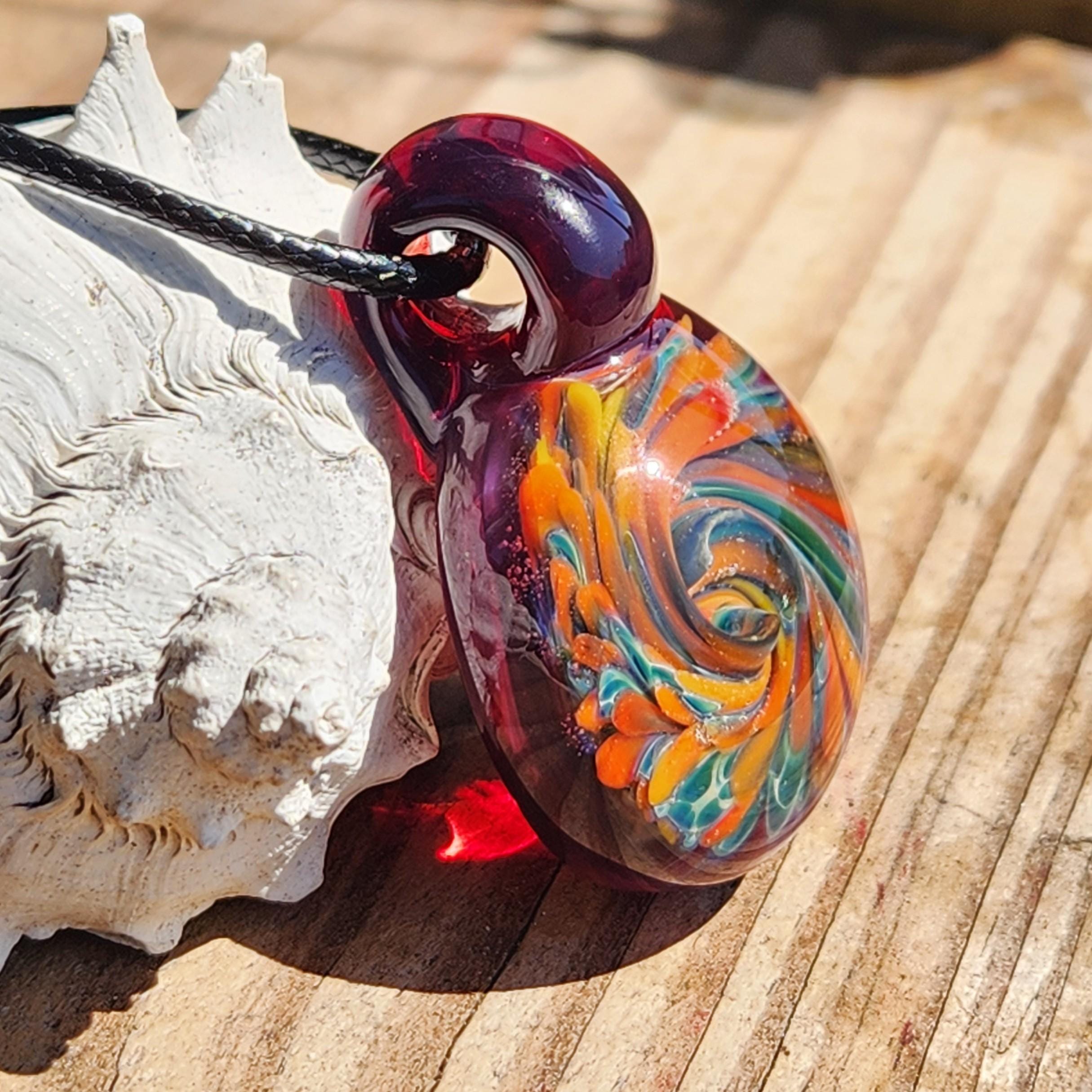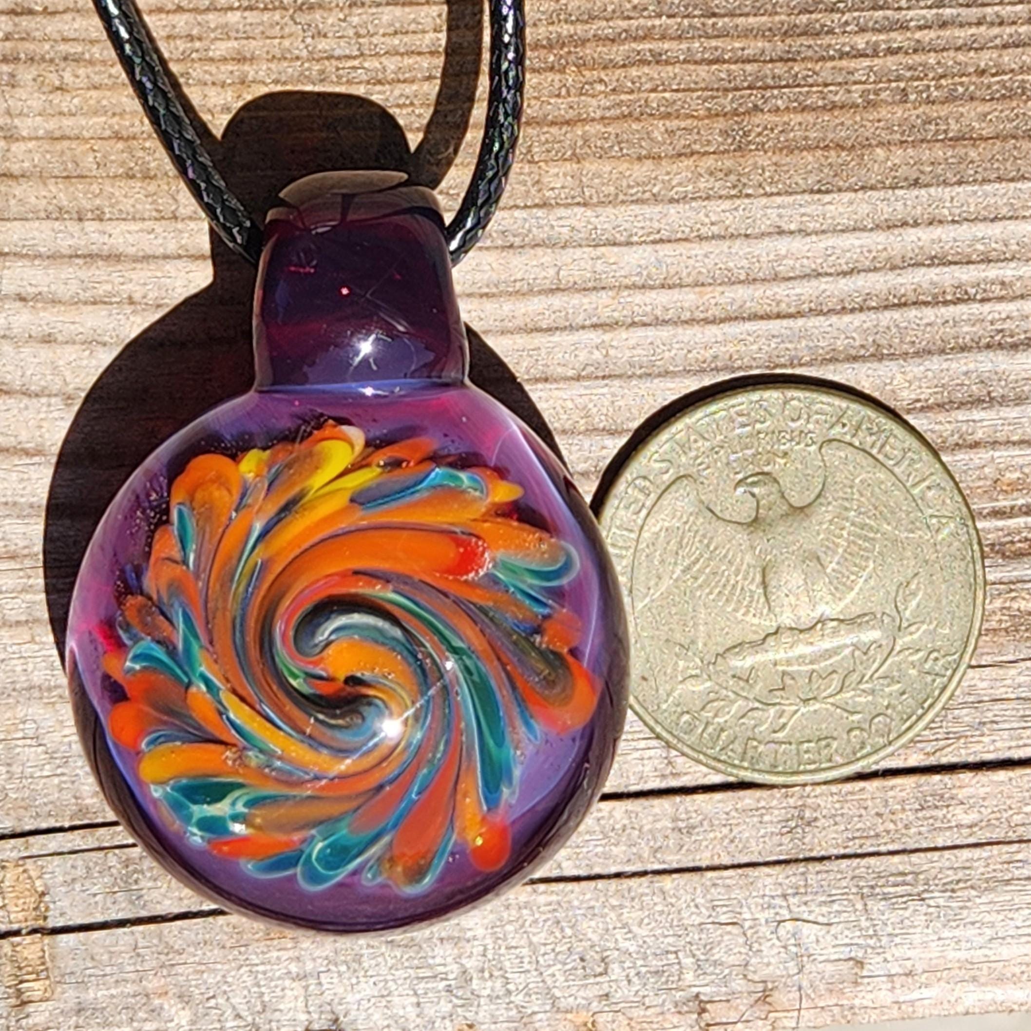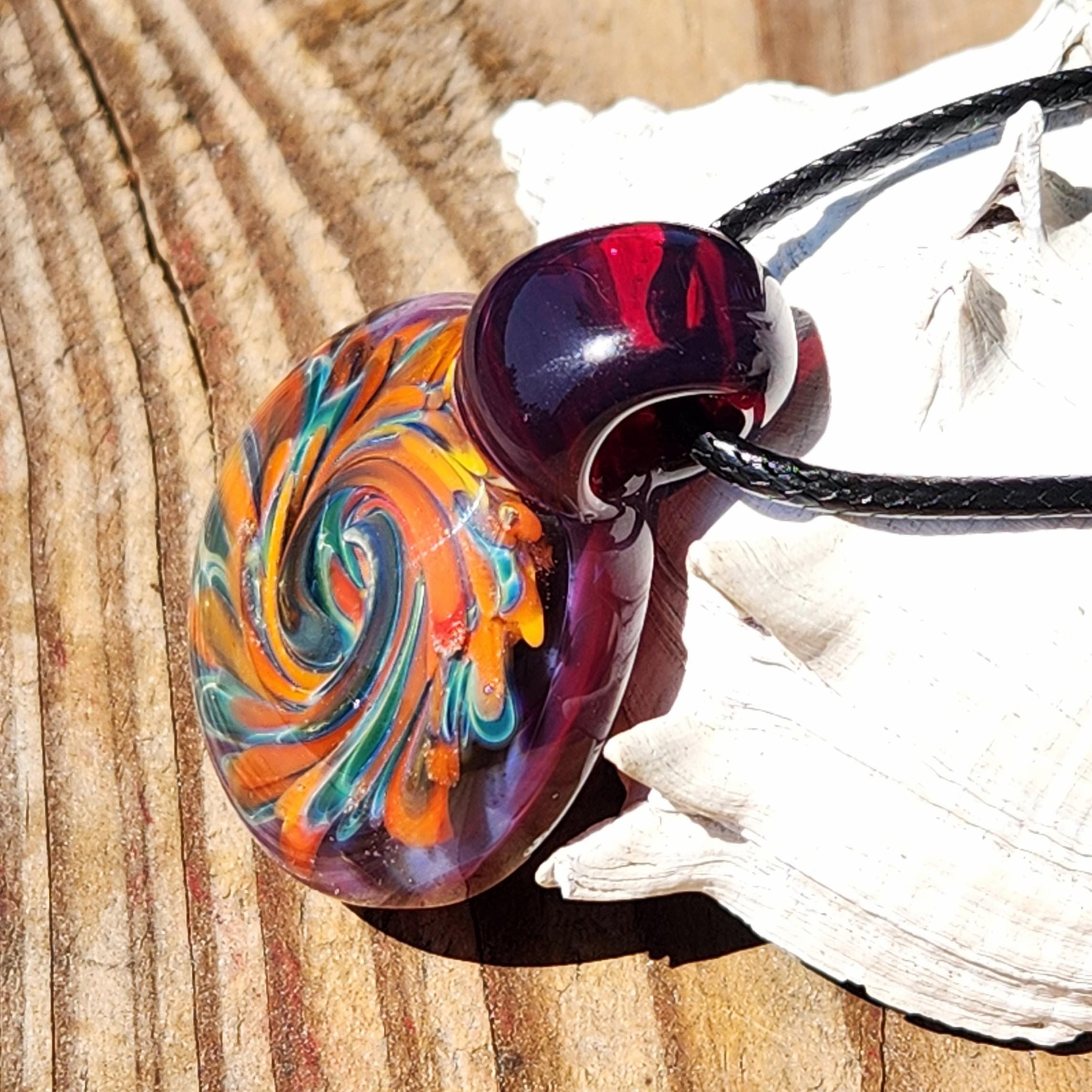Borosilicate glass pendant necklace featuring a colorful swirl design on a deep purple and burgundy background. This handmade glass pendant blends vibrant orange, teal, and yellow tones into a dynamic spiral, creating a bold and unique piece of wearable art.
