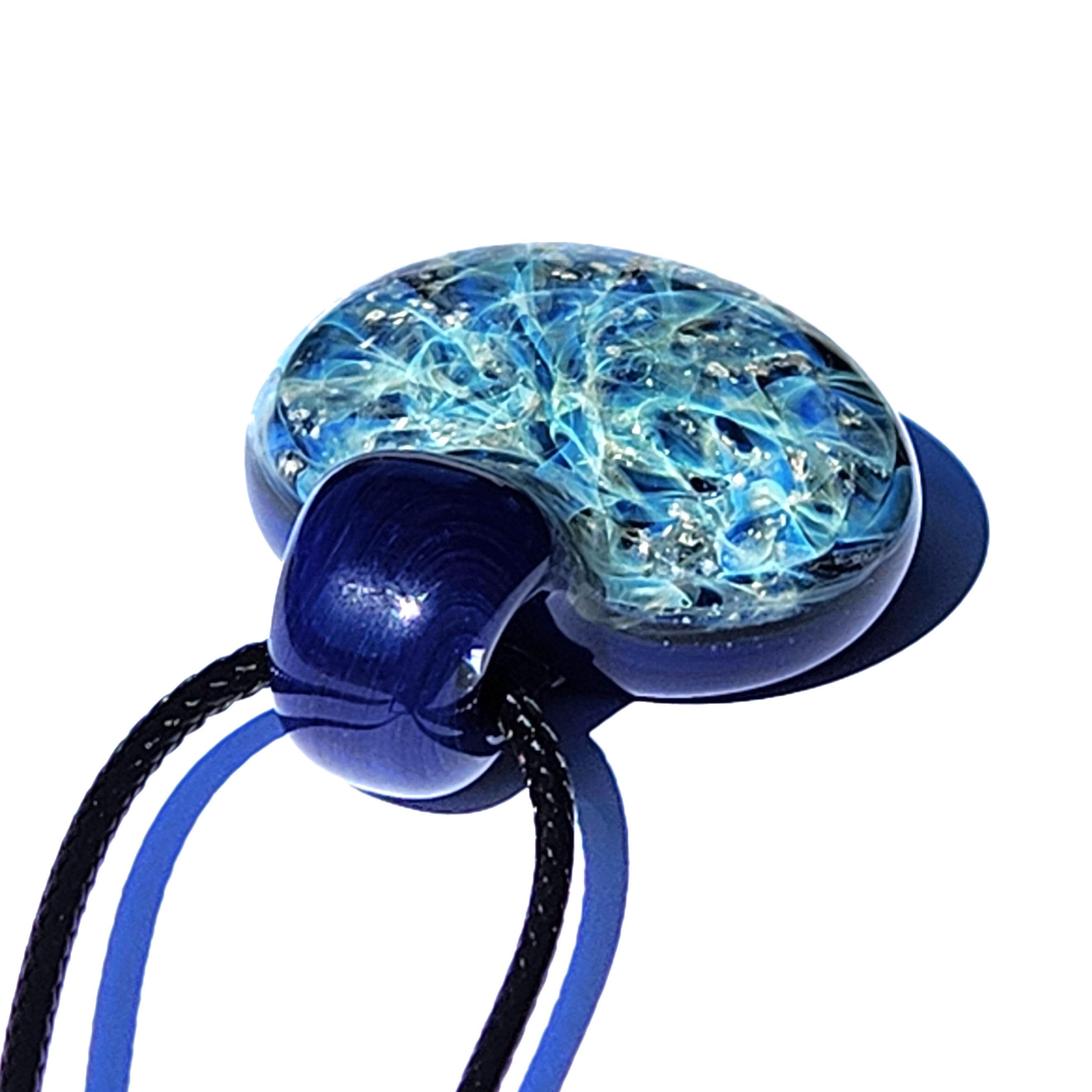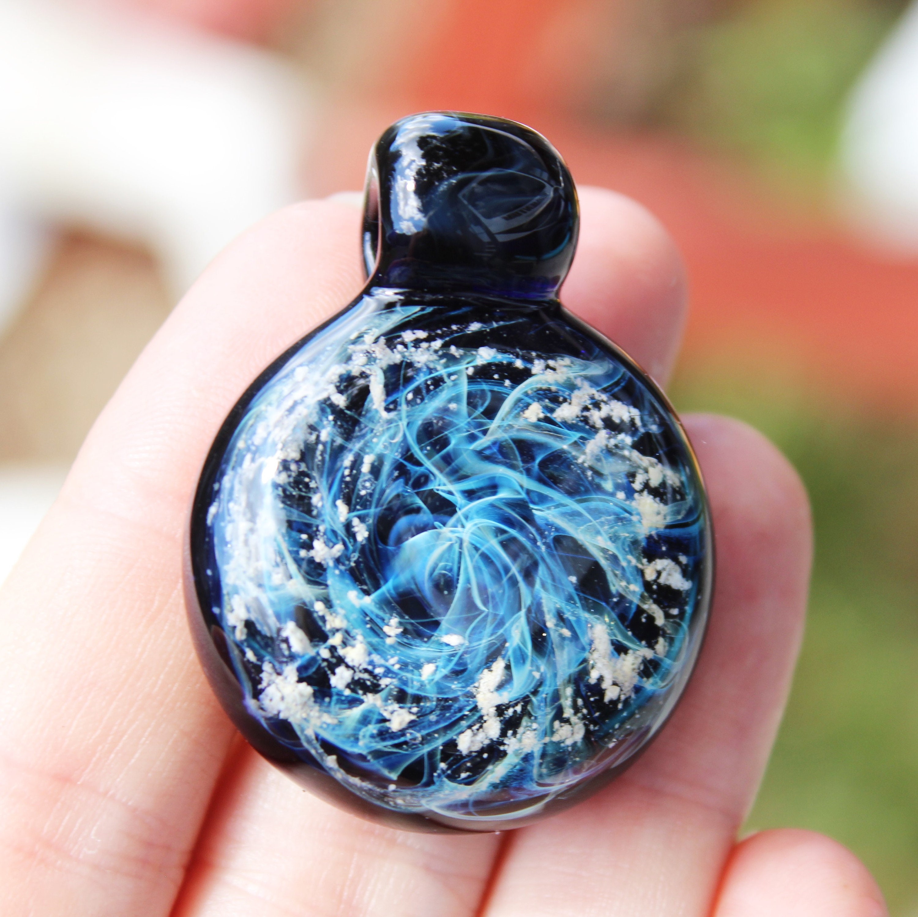 In this handmade urn necklace, the ashes of your beloved pet are mixed with molten glass and pure silver fuming, to form this swirling beauty of a glass galaxy that you can wear close to your heart. Each memorial pendant is specially hand made for you, making it a very unique and truly one-of-a-kind Cremation Pendant.