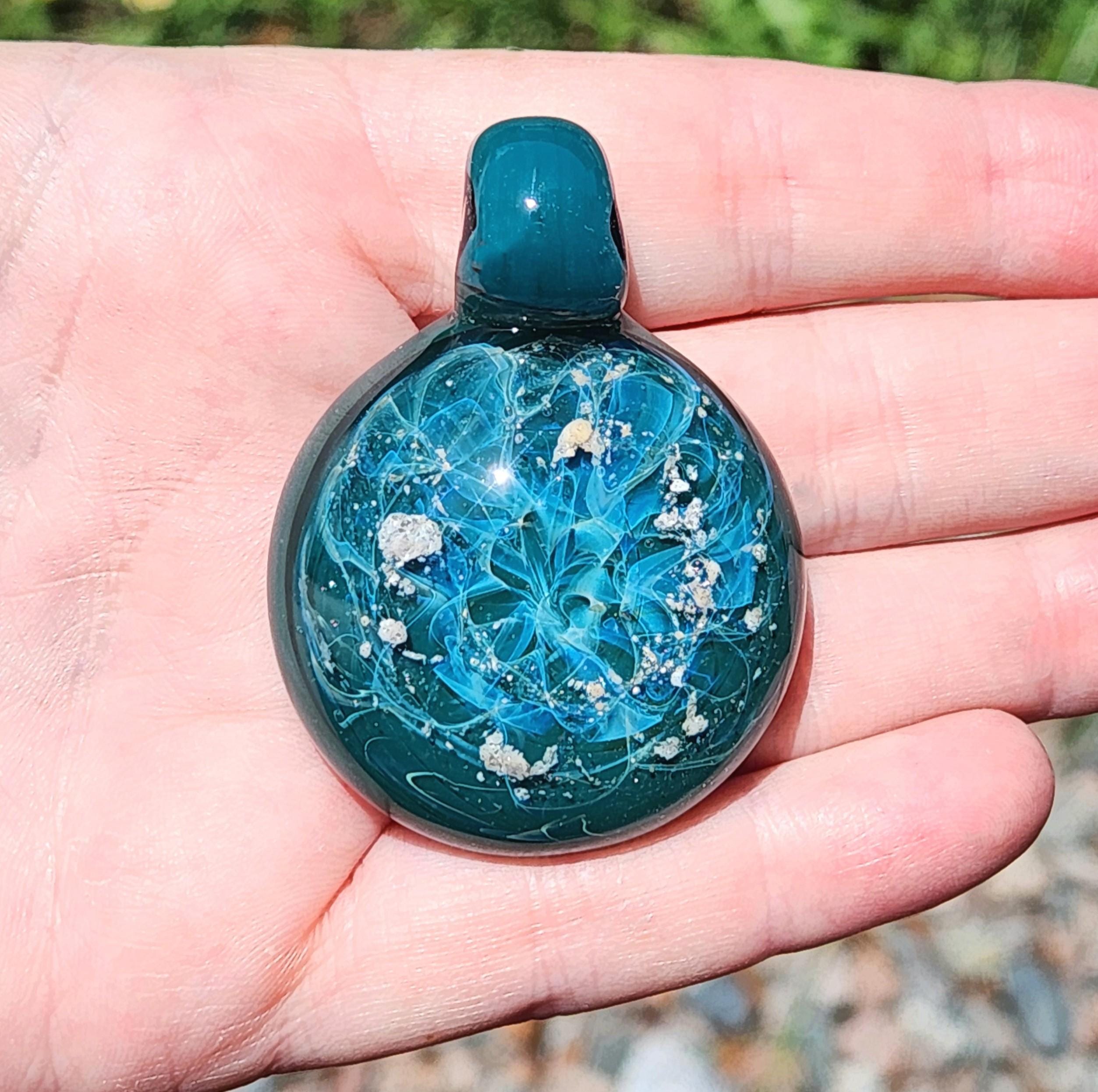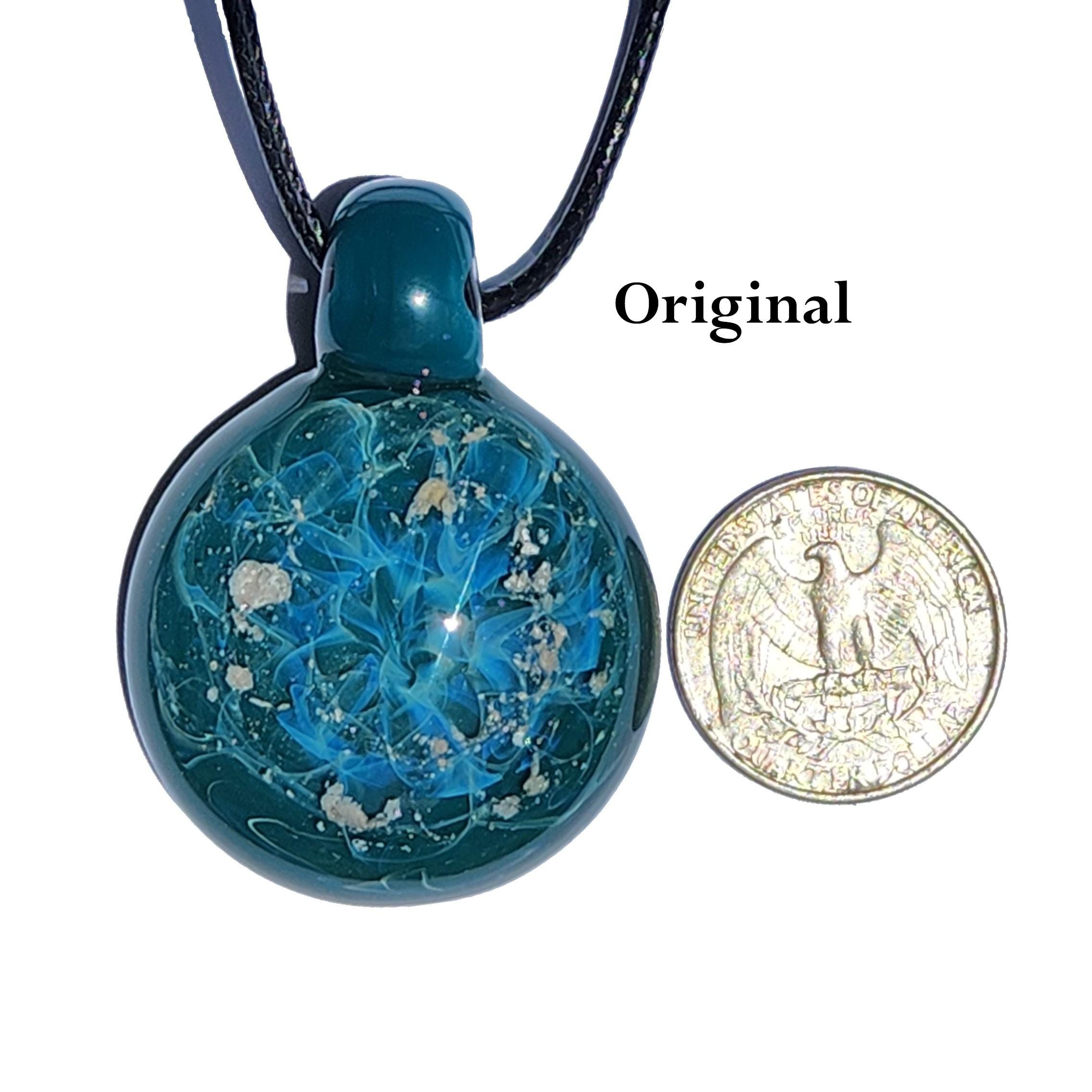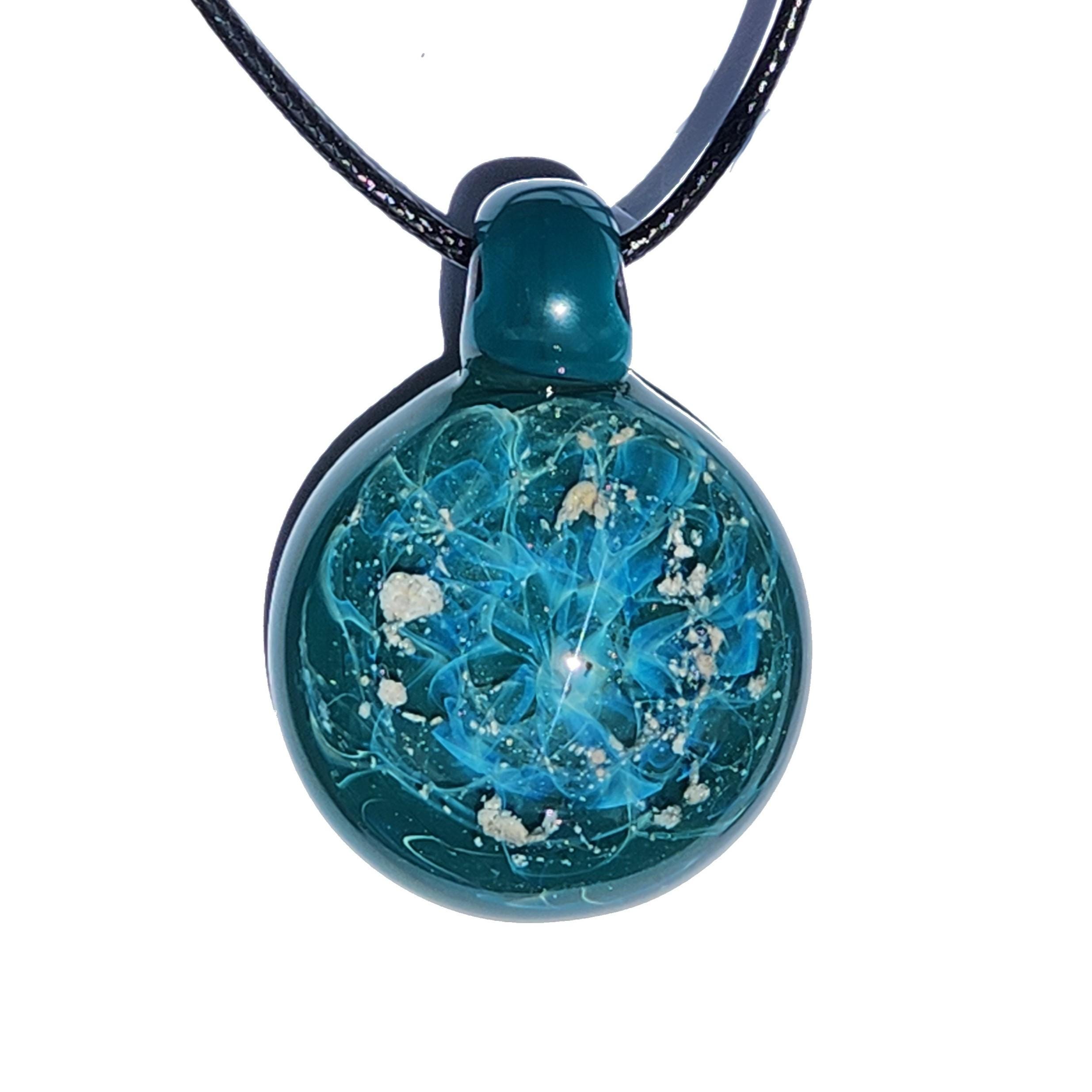 The Galaxy Cremation Necklace is made to order. The ashes of your beloved pet are mixed with molten glass and pure silver fuming, to form this swirling beauty of a glass galaxy that you can wear close to your heart. Each pendant is encased in Turquoise colored glass and specially hand crafted for you, making it a very unique and truly one-of-a-kind memorial Cremation Pendant.