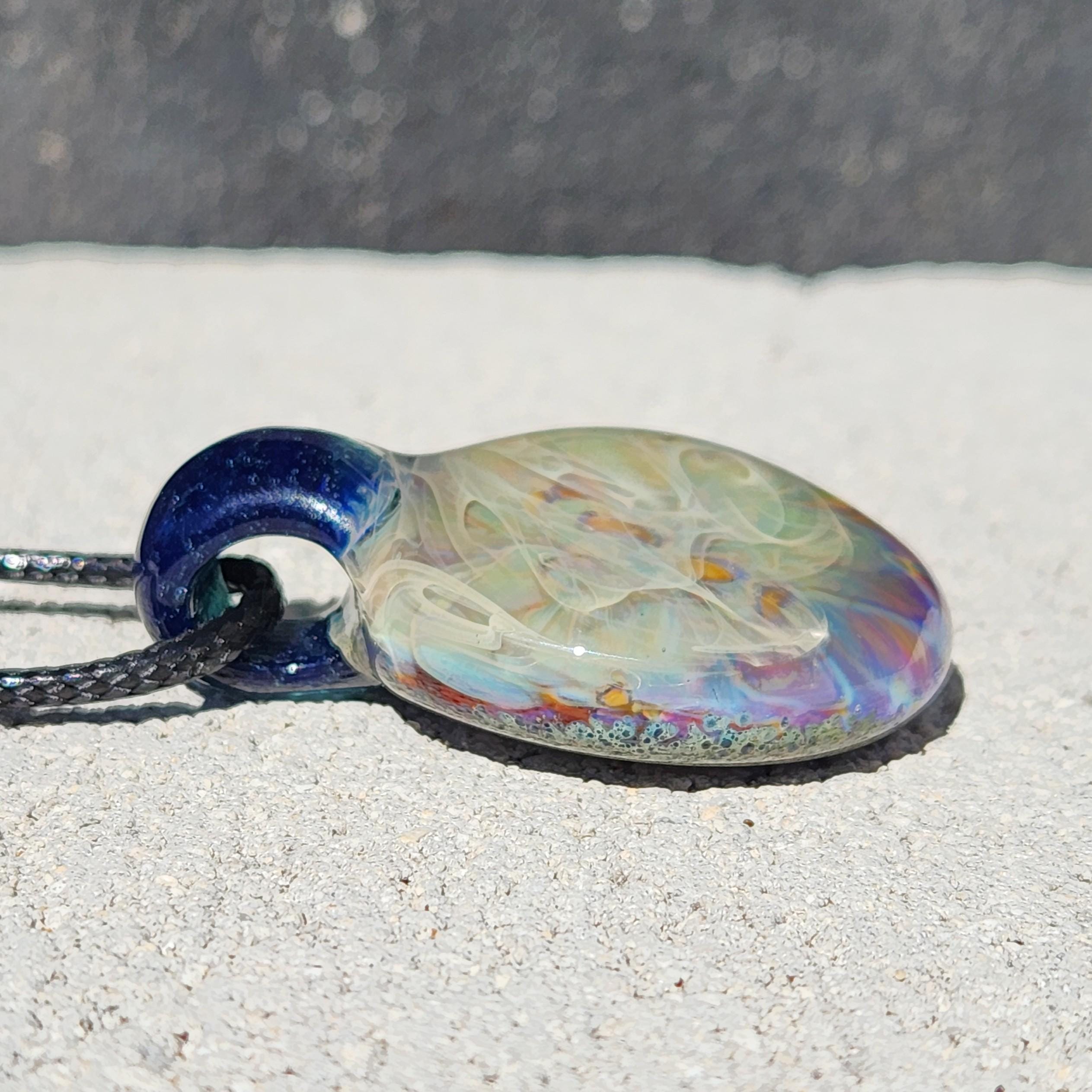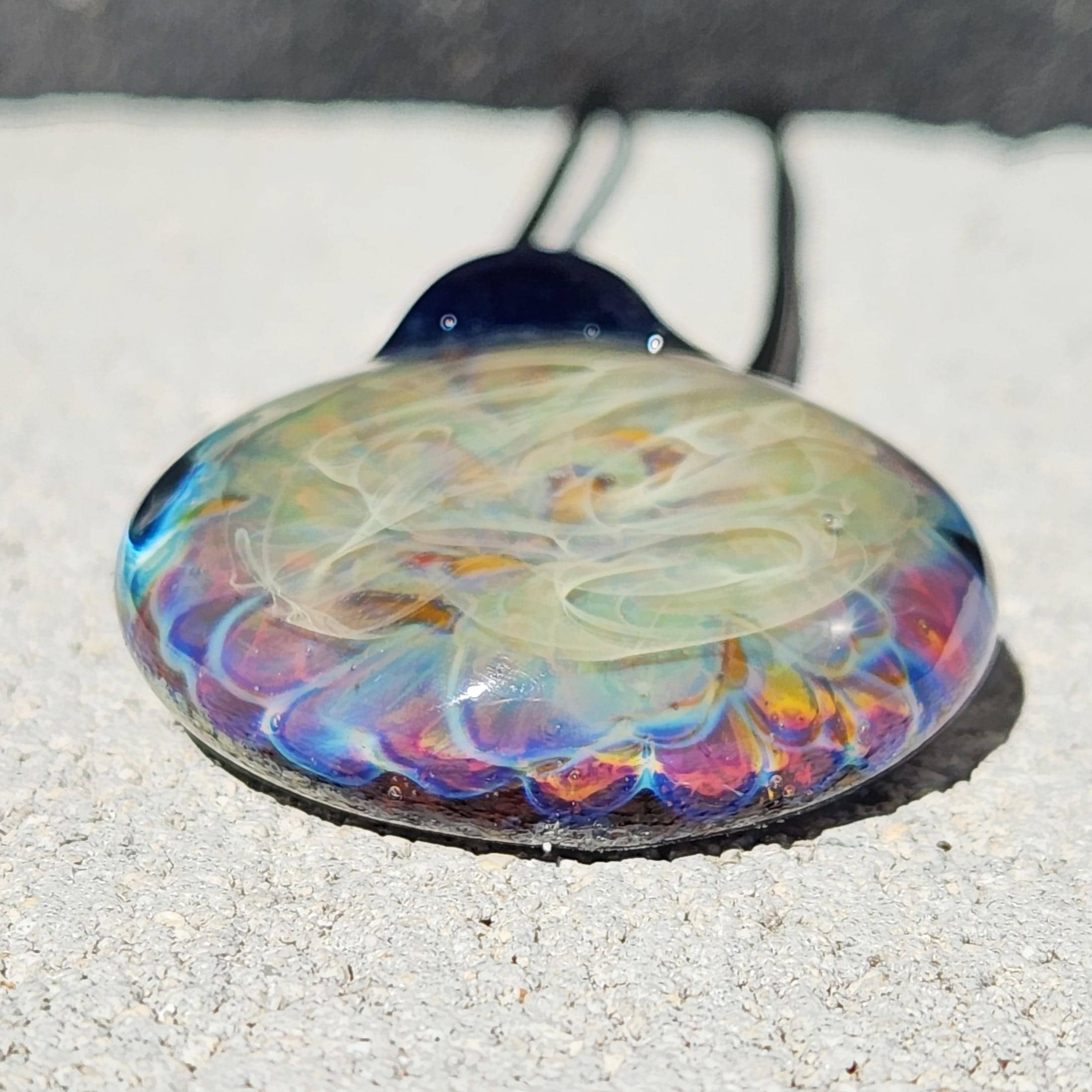 This handmade glass pendant features a dreamy, hazy swirl of silver fuming floating above a vibrant base of rainbow-colored borosilicate glass. As the light hits, hidden flashes of blue, gold, purple, and soft pastel tones glow from beneath the surface, giving this pendant an ethereal, almost celestial feel.