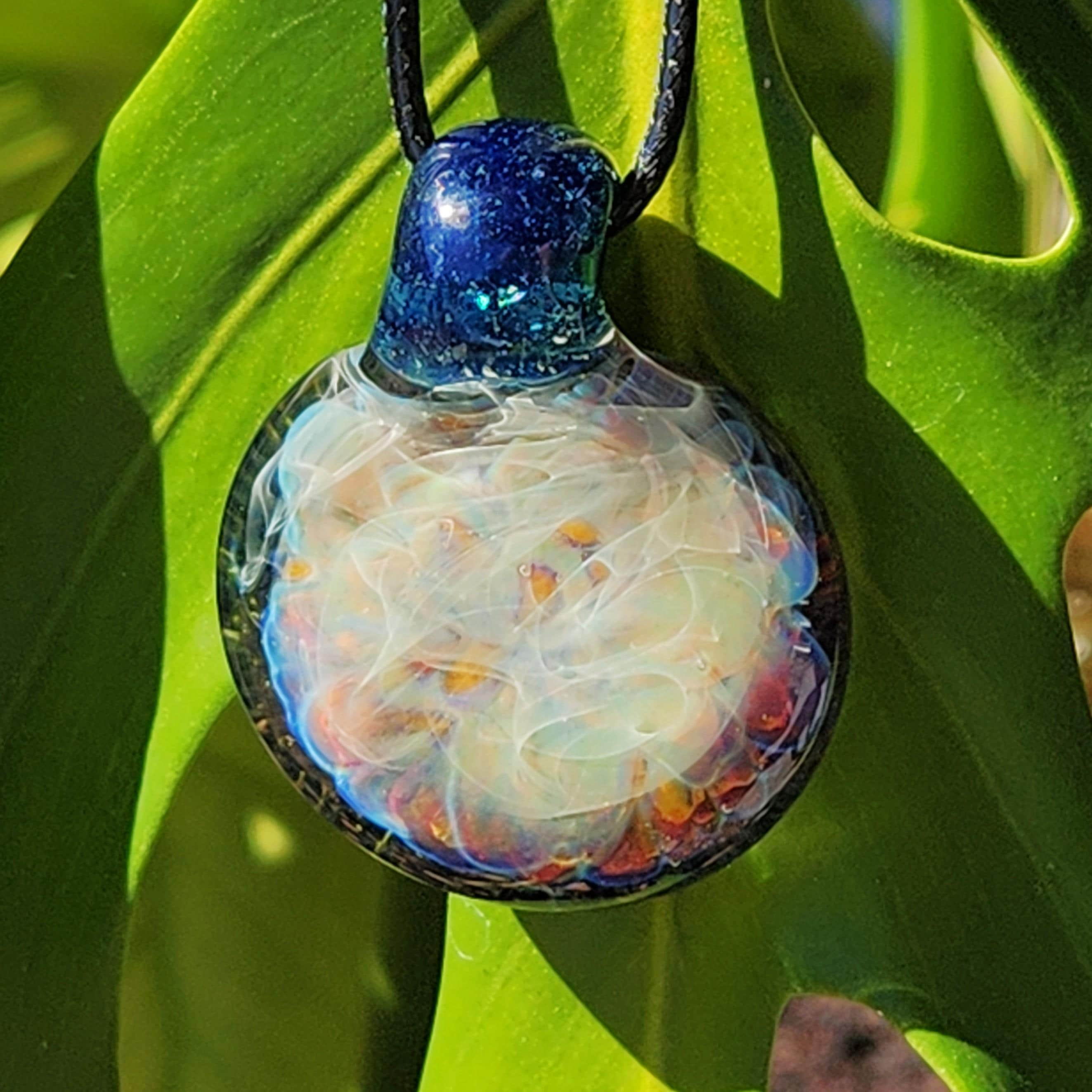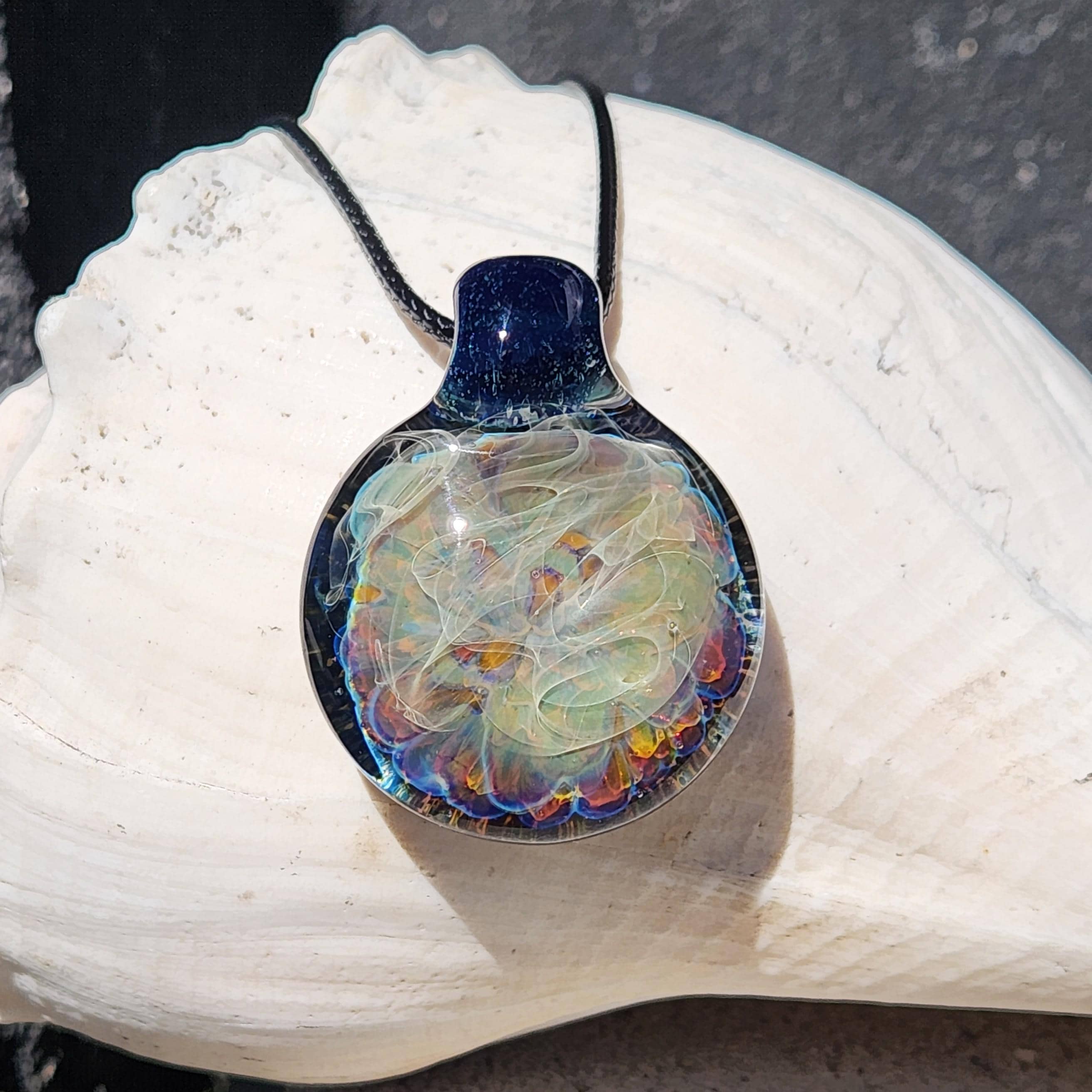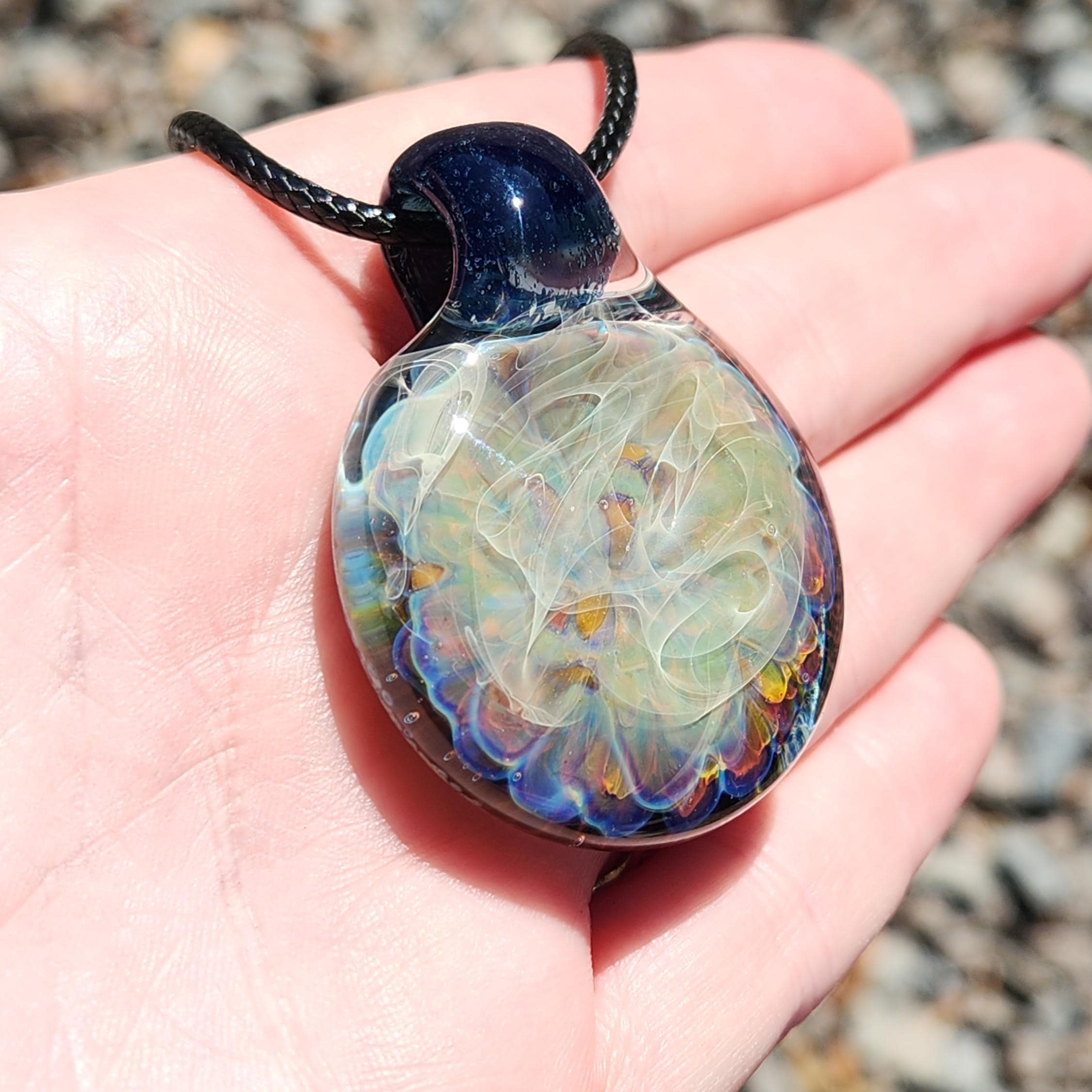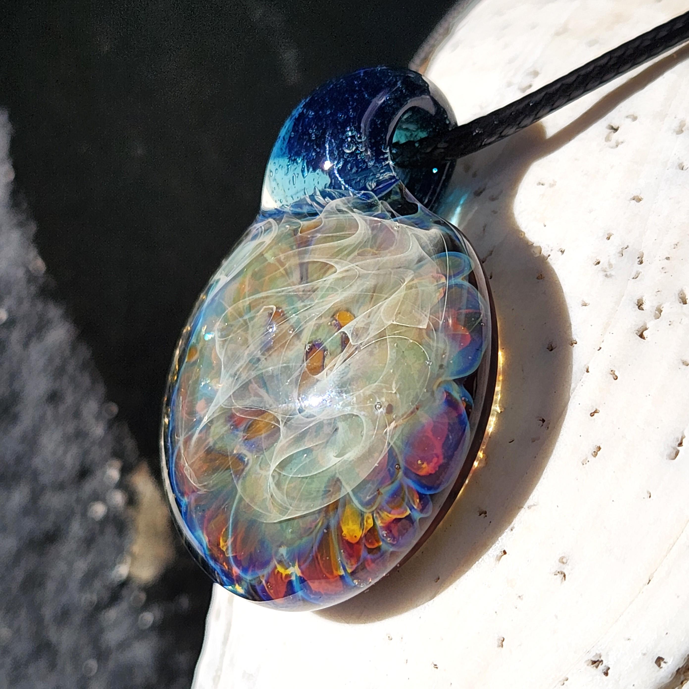 Flame-worked one at a time, this piece is shaped, layered, fumed, and finished to bring out depth, color, and a soft inner luminescence. No two pendants ever come out the same, the one in the photos is the exact one you’ll receive.