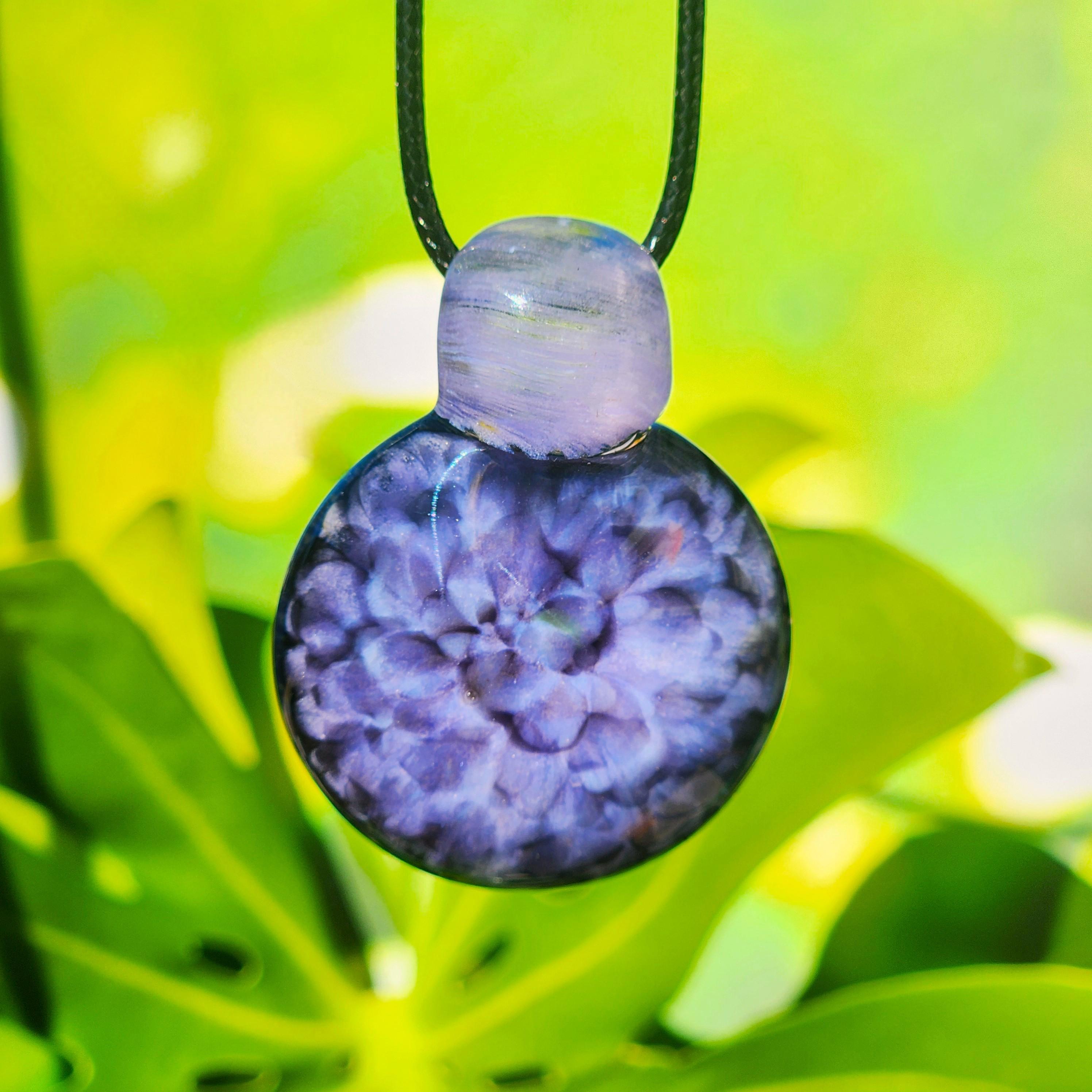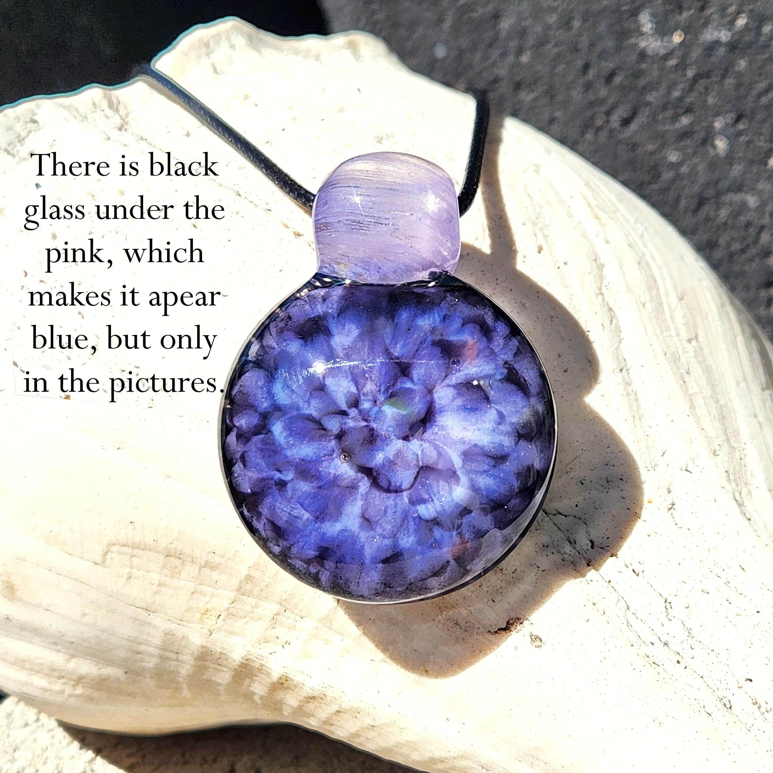 Due to the black glass layered behind the petals, this pendant may appear more blue or lavender in photographs. In person, the soft pink tones of the flower shine through, especially in natural light.