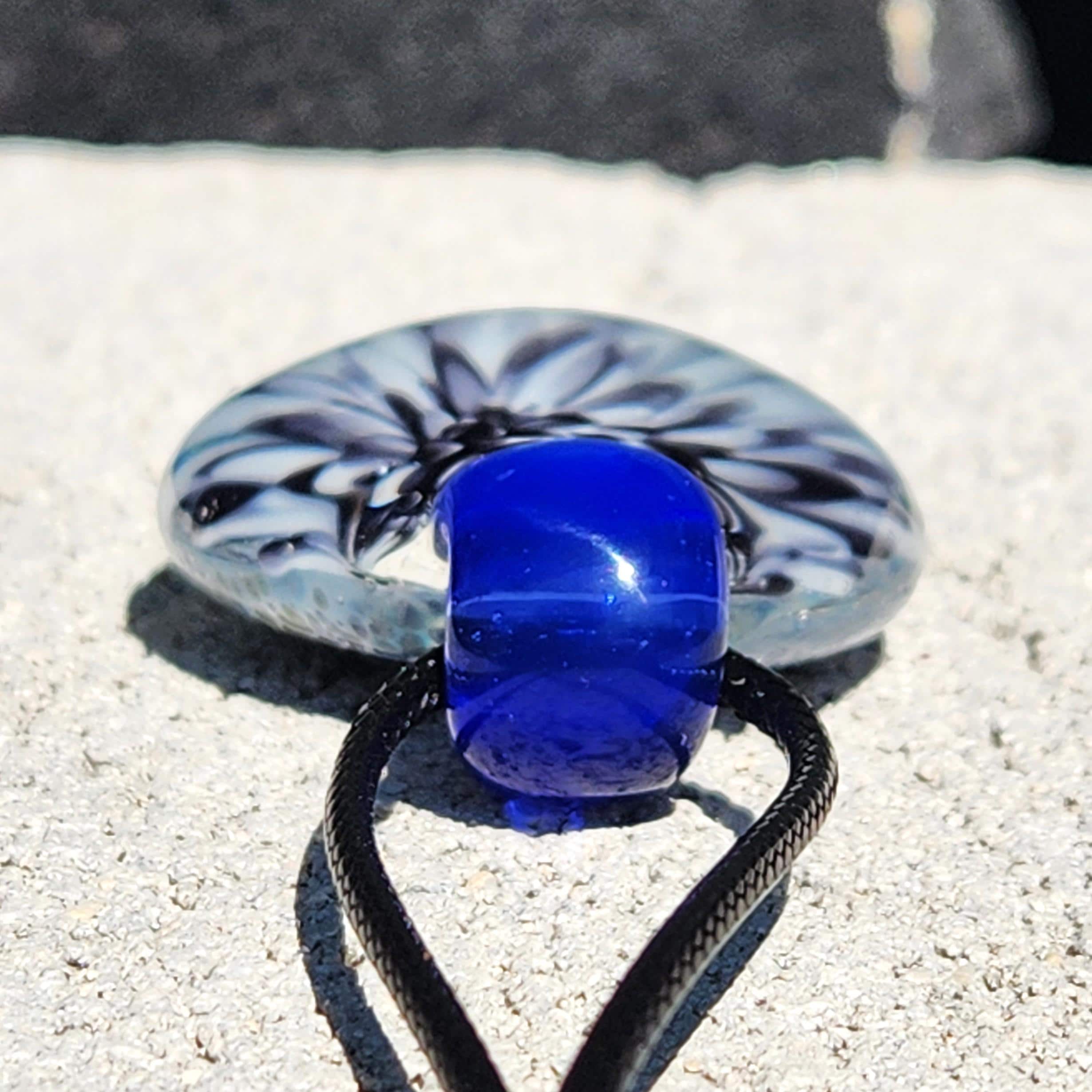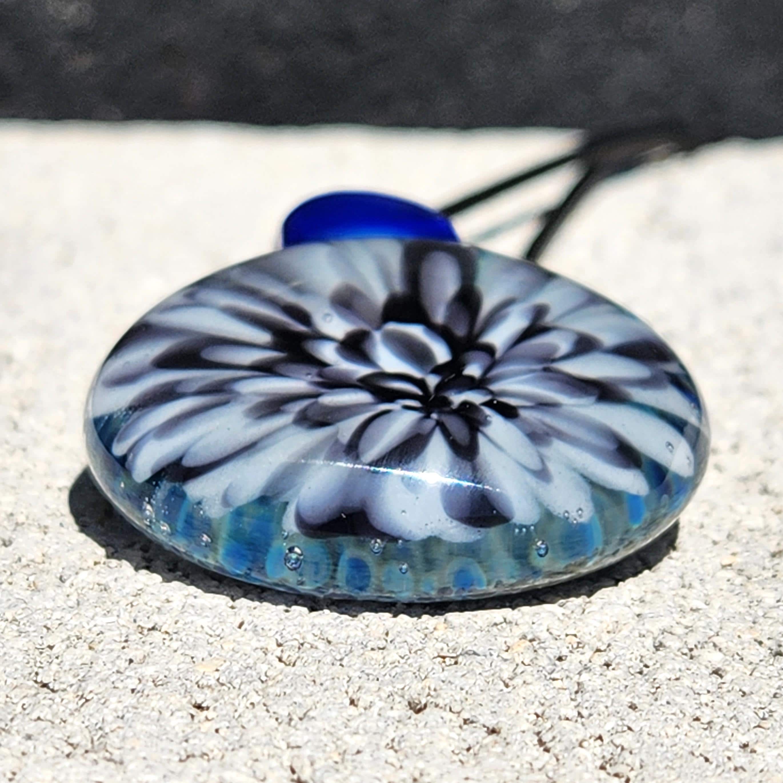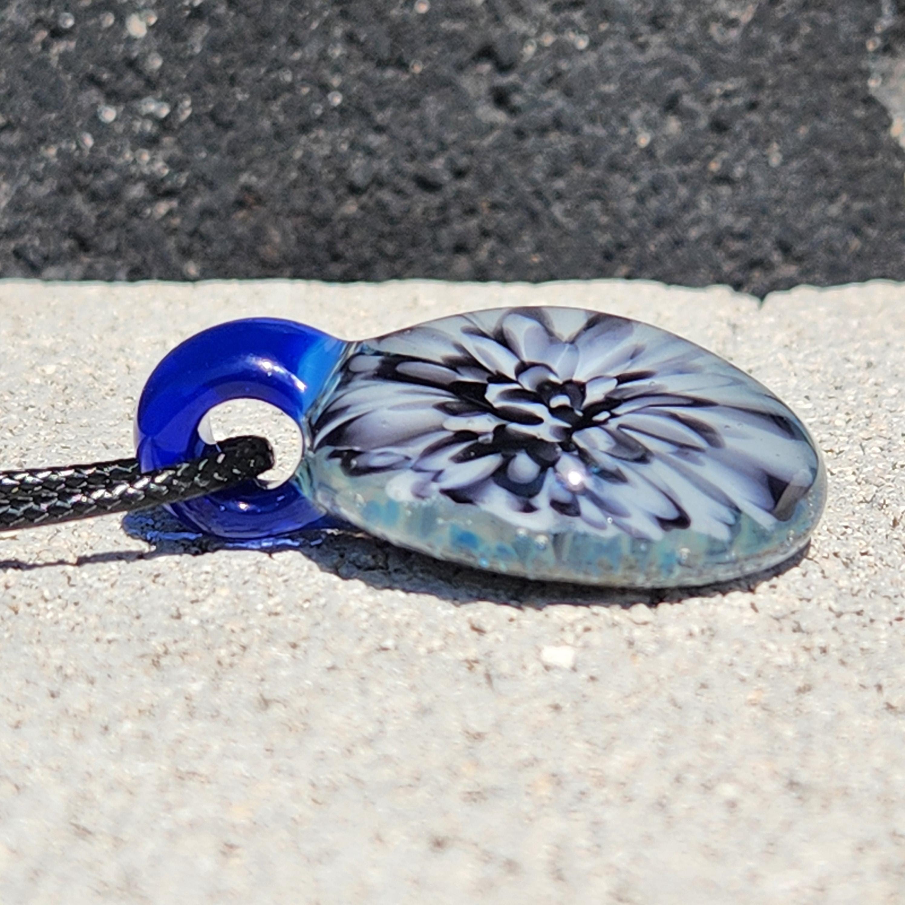 This glass pendant has beautiful blue, gray and black colors swirling inside it, with different hues showing, every time it shines in the sun. The pictured piece is the one you will be holding in your own hand.