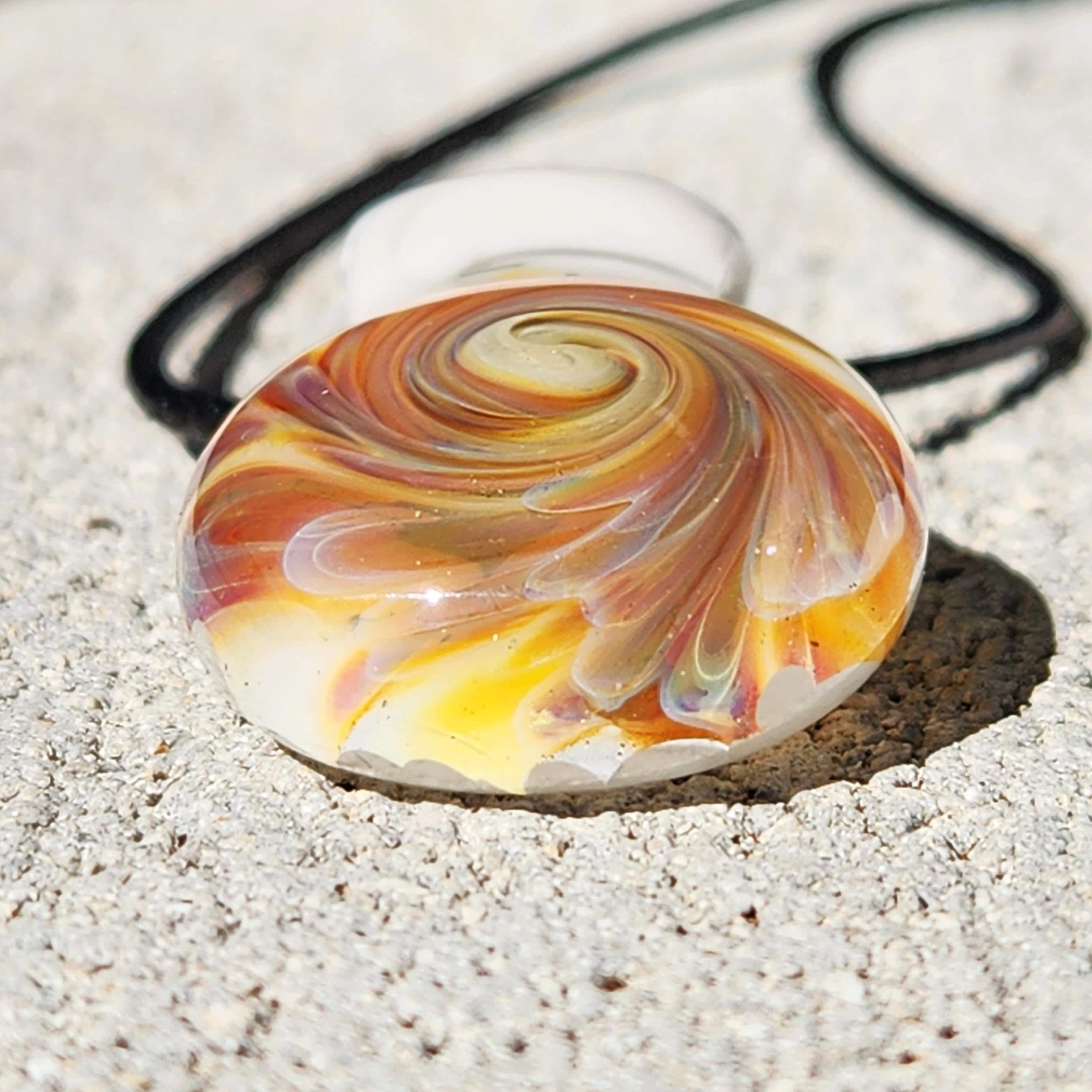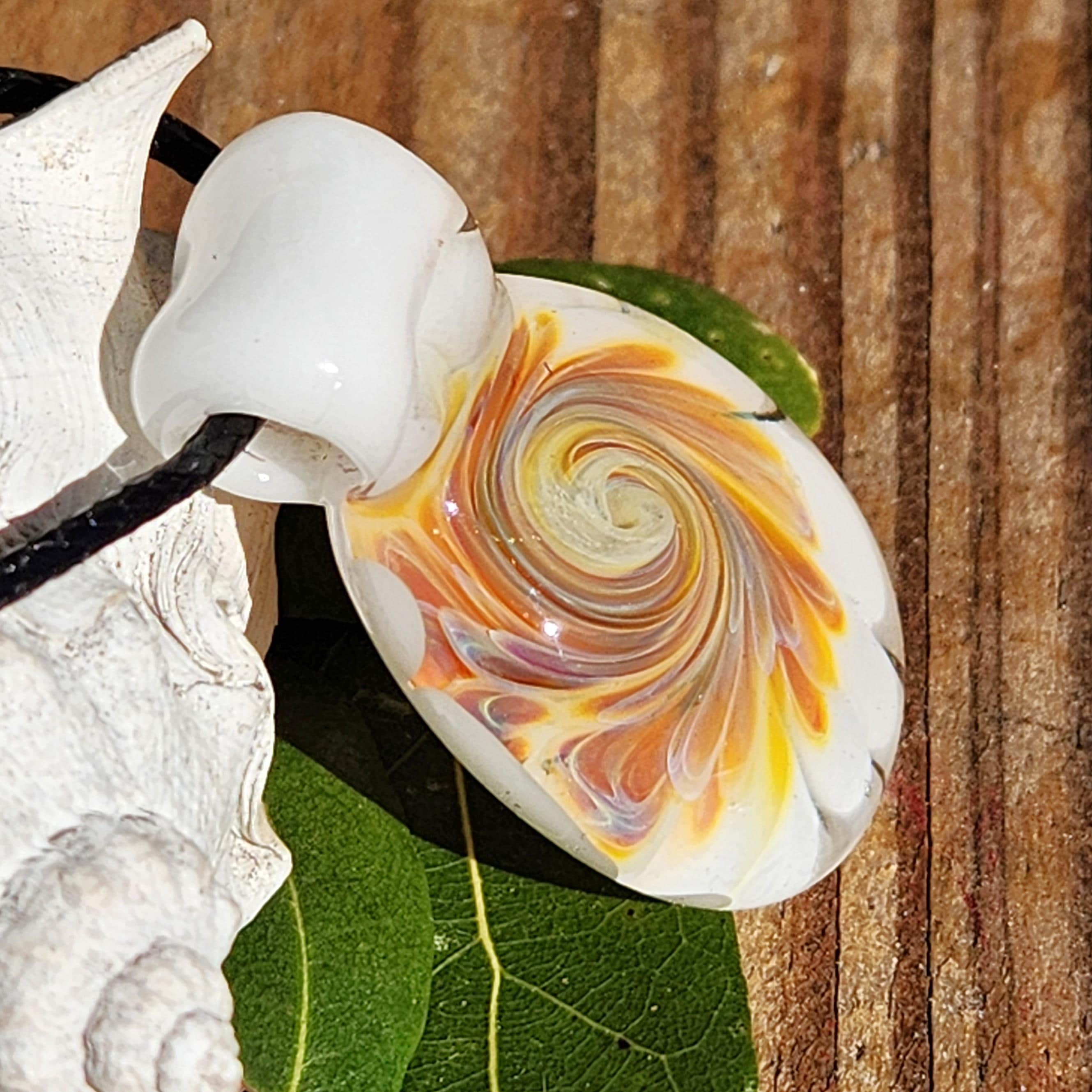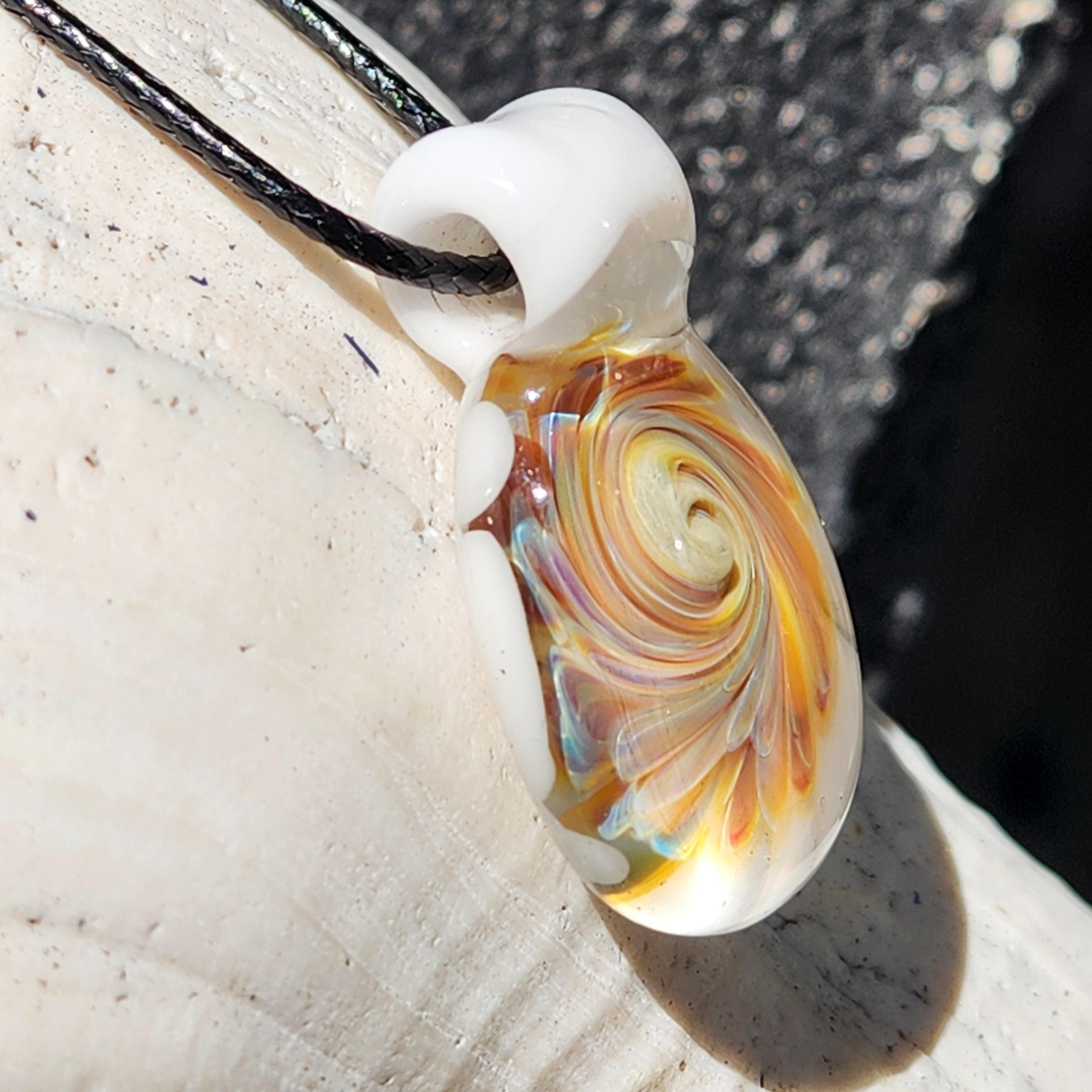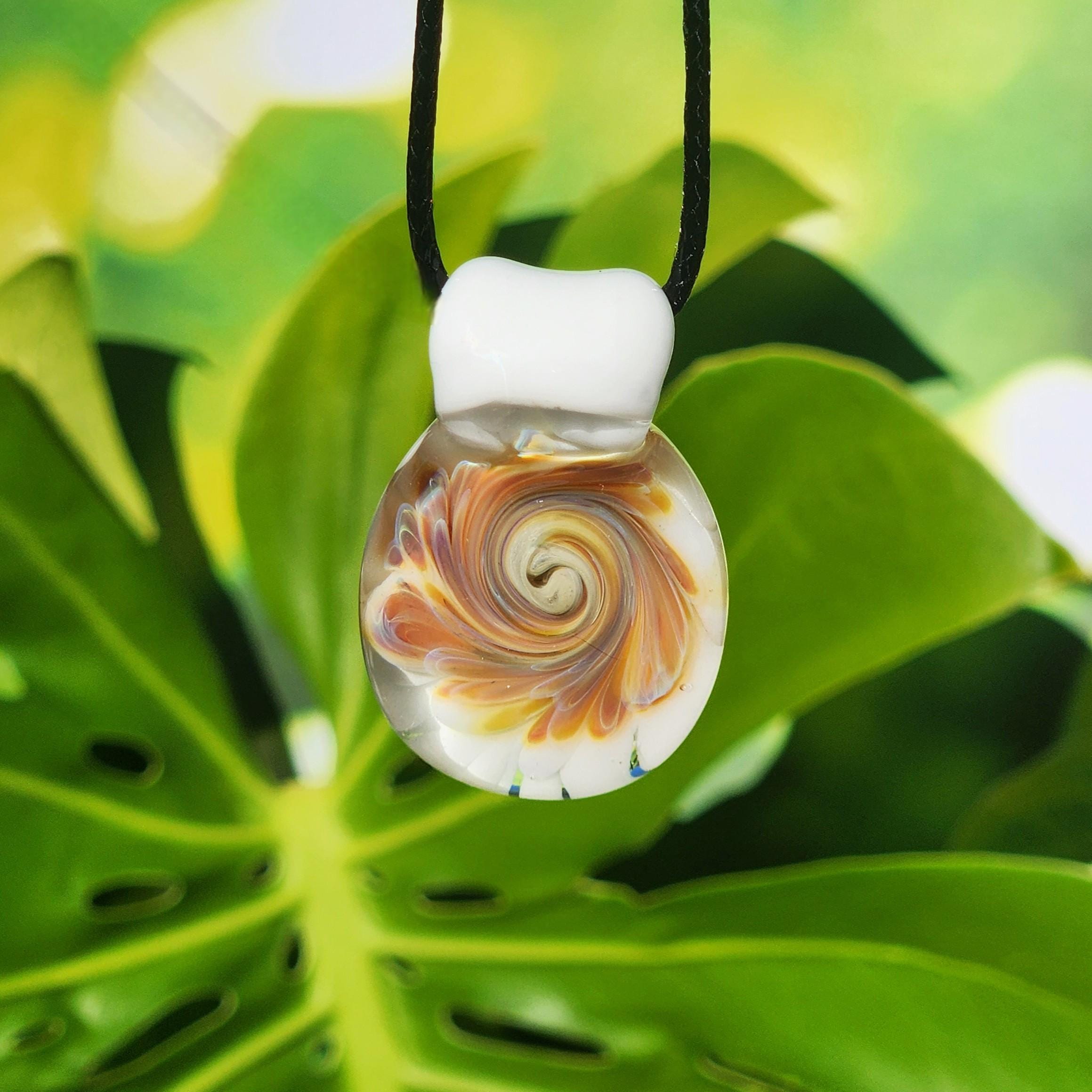 The top is finished in smooth white glass, creating a clean, balanced contrast to the warm swirling center. Each pendant is carefully shaped and polished by hand, making every piece truly one of a kind.