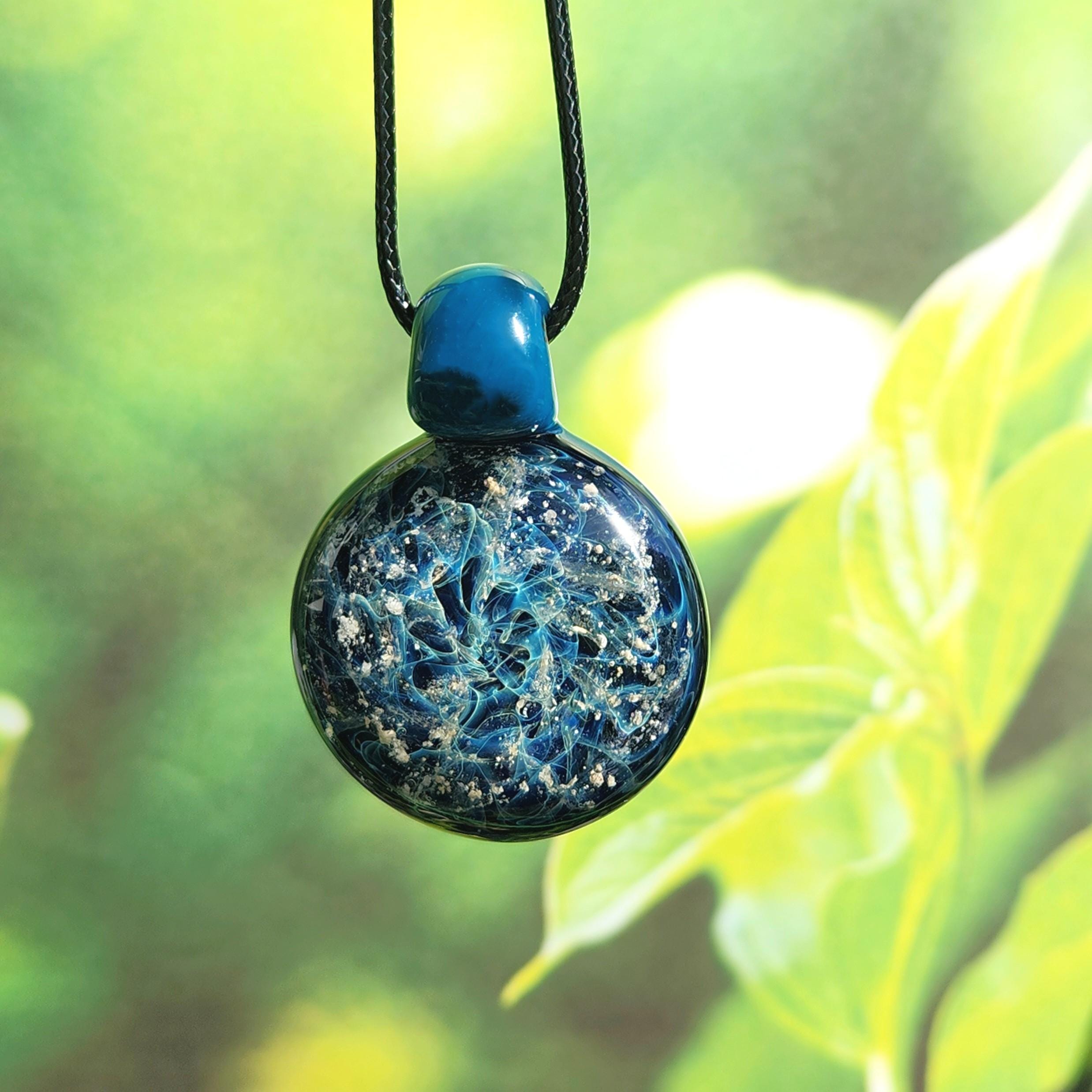 Keep their memory close with this handmade Galaxy Urn Necklace. Crafted with love and molten borosilicate glass, this custom cremation pendant is infused with the ashes of your beloved pet and accented with pure silver fuming to create a swirling, galaxy-like effect. Each memorial pendant is individually hand blown in our studio, making every piece truly unique.