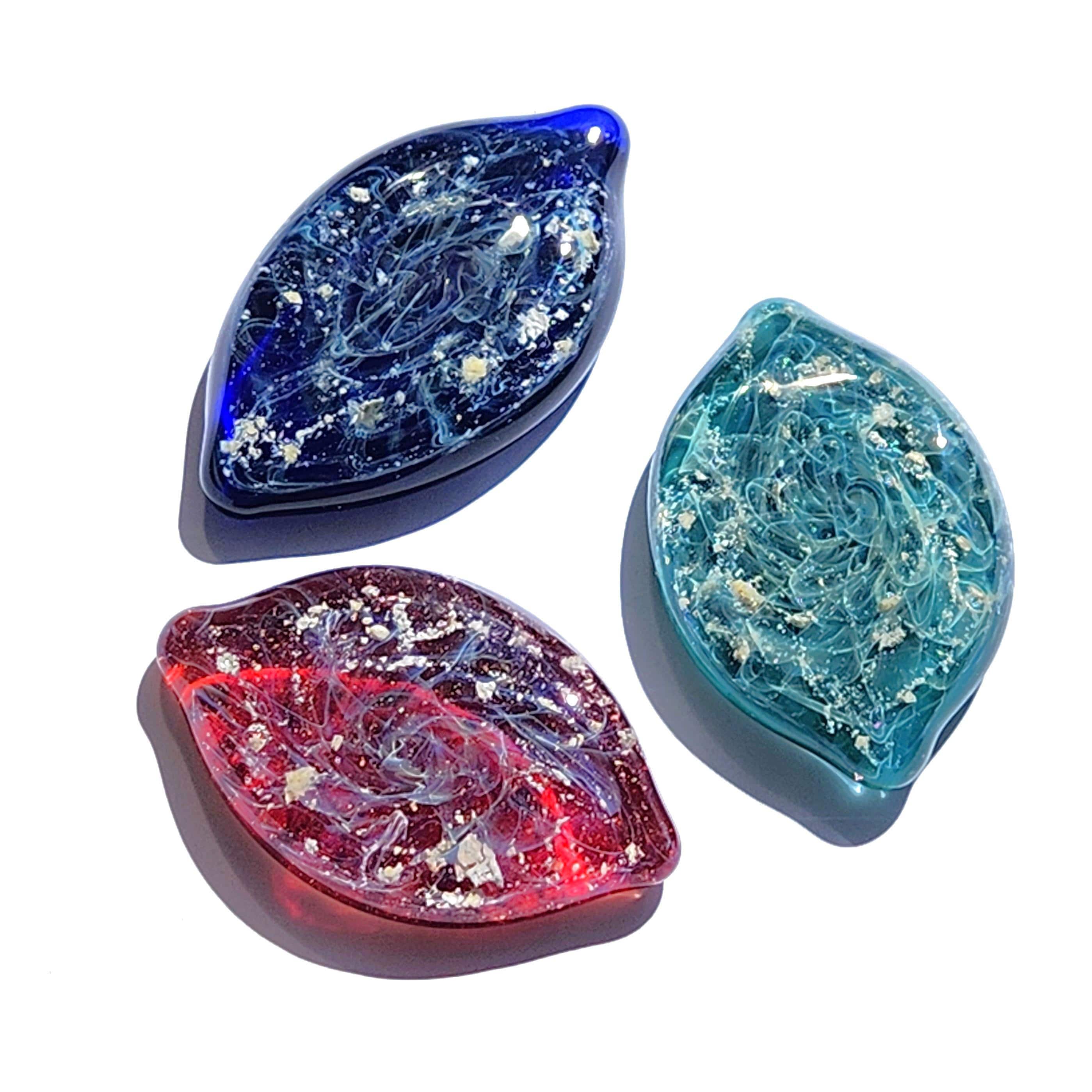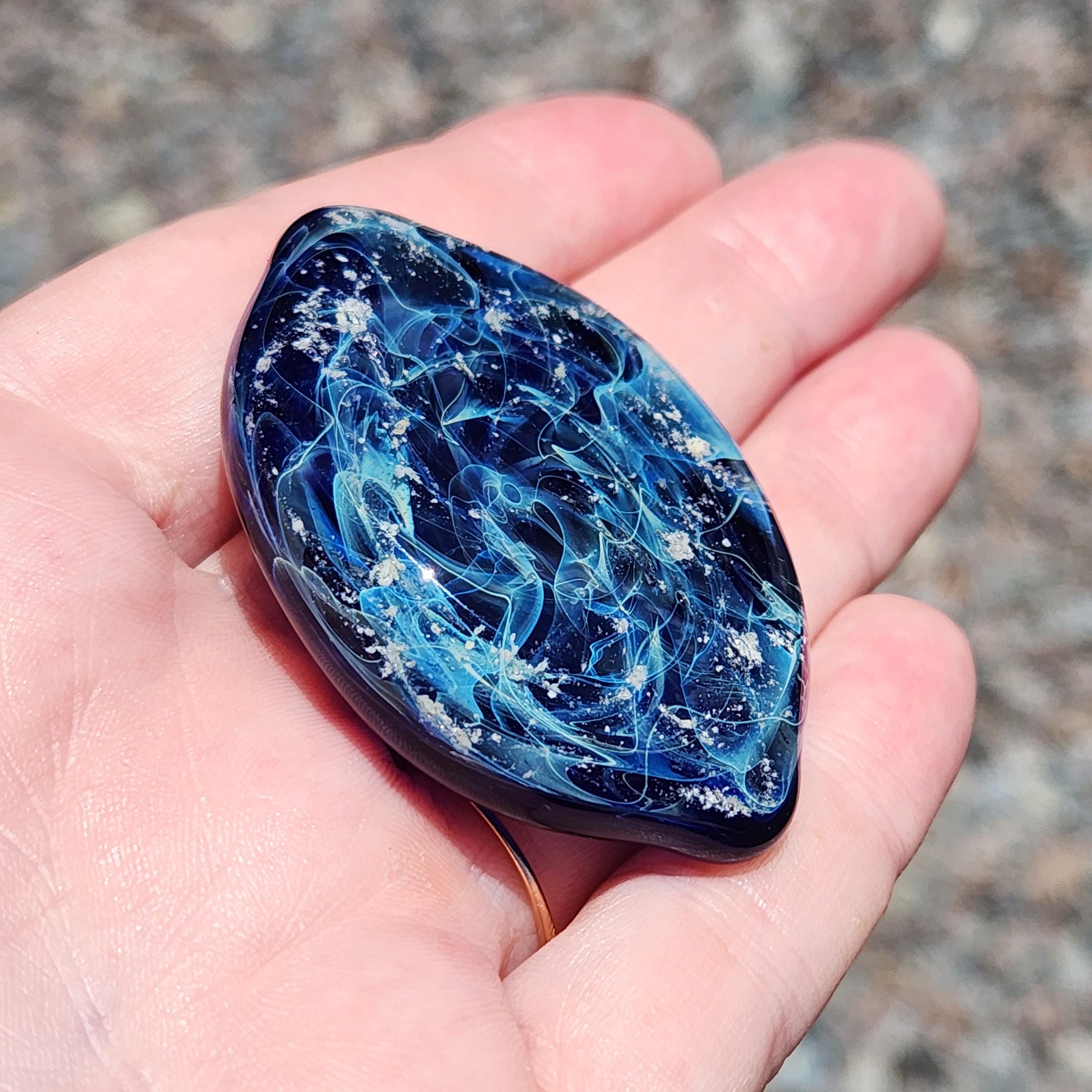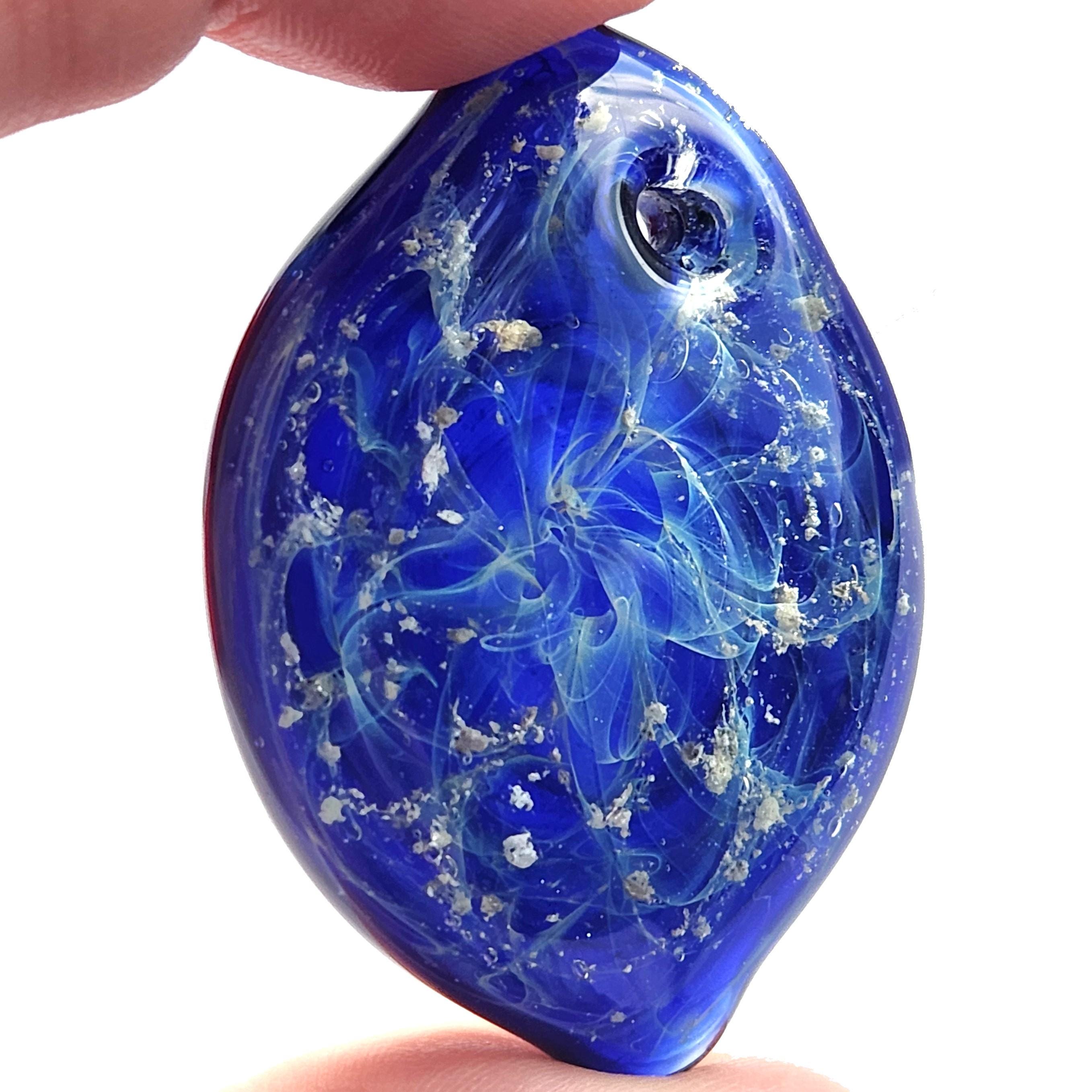 This royal blue glass cremation touchstone is a heartfelt way to keep your beloved pet or loved one always near. Handcrafted from molten borosilicate glass, each piece is infused with your provided ashes and sealed forever inside a swirling galaxy of light.