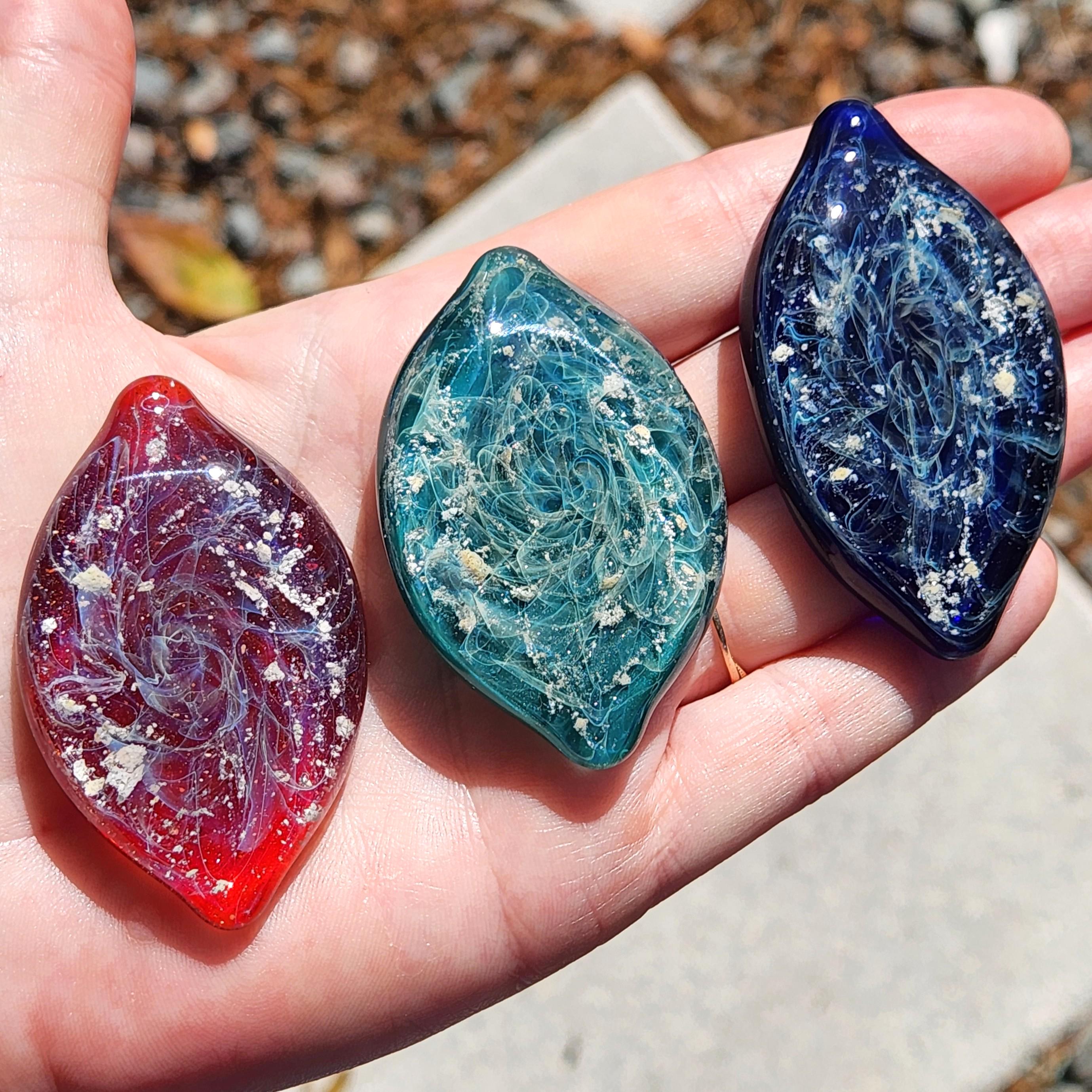 The Galaxy Cremation Touchstone is a unique, handmade pet memorial keepsake designed to hold the ashes of your beloved pet. Crafted with care, each touchstone features your pet's ashes mixed with molten glass and pure silver fuming, forming a stunning swirling galaxy within the glass. The ashes are fully sealed, making the touchstone waterproof and durable.