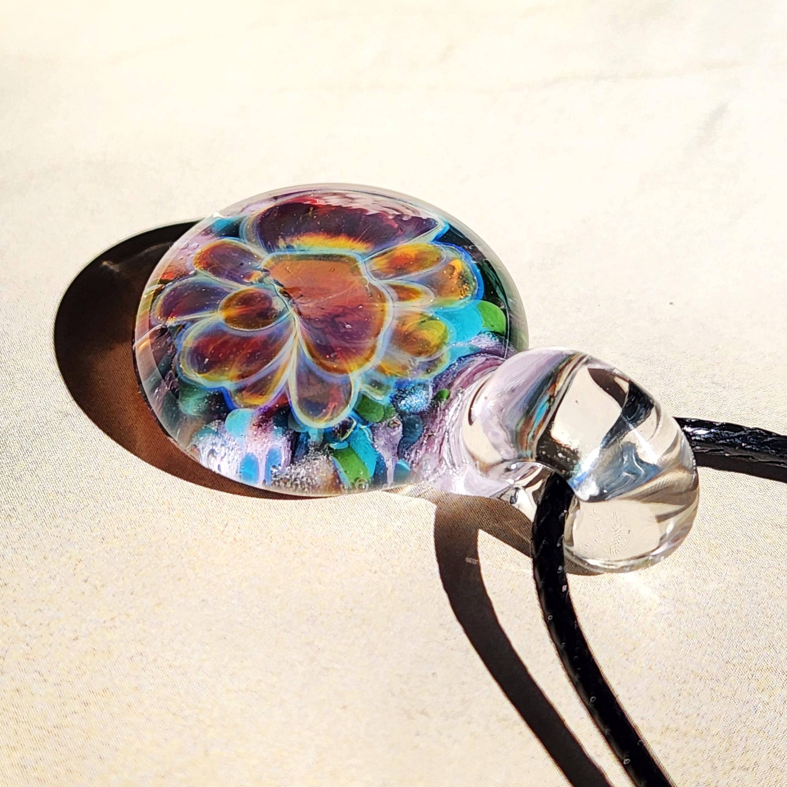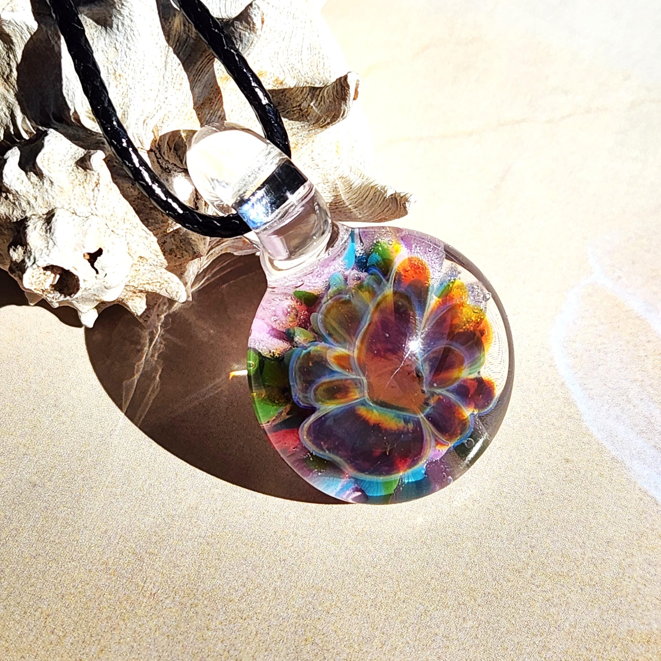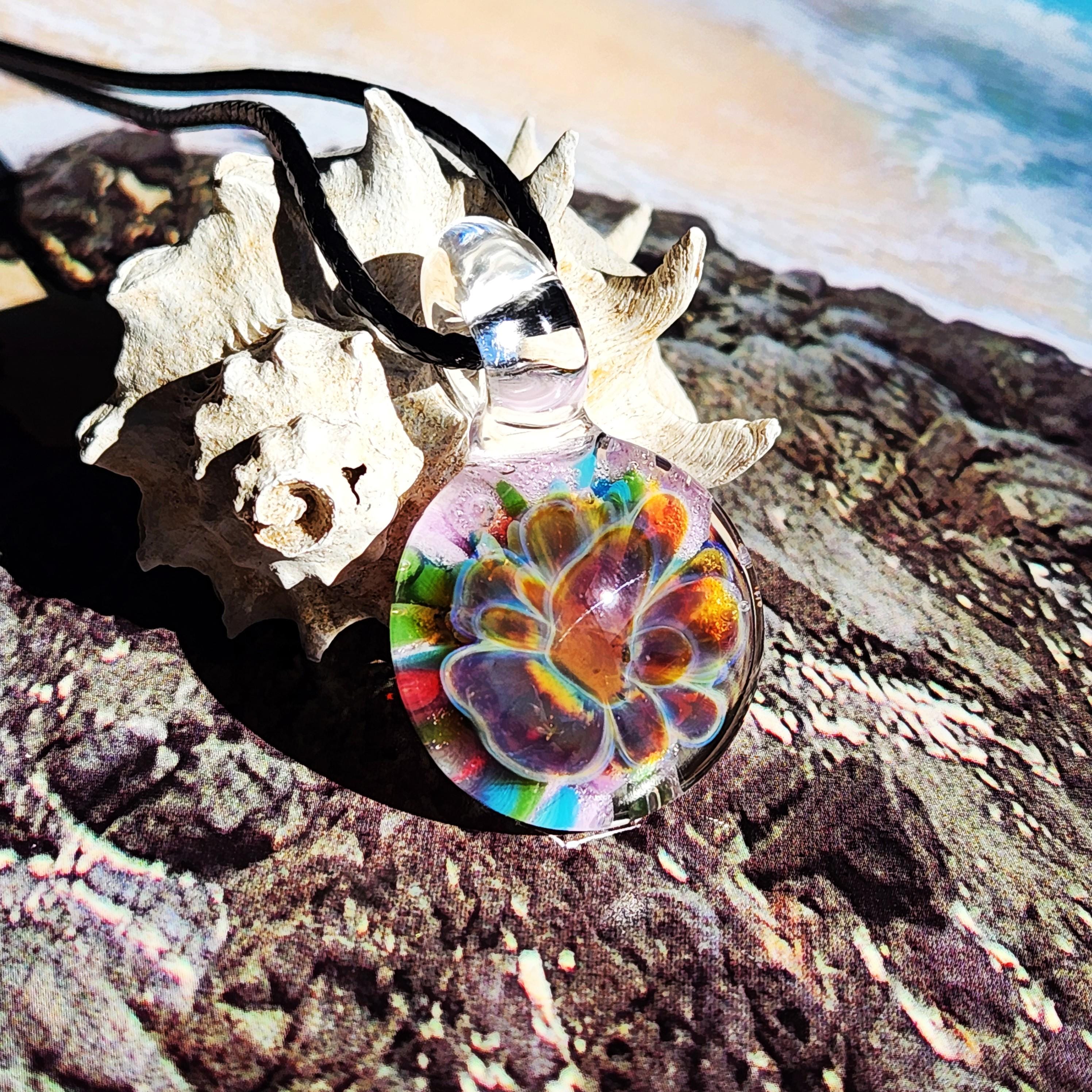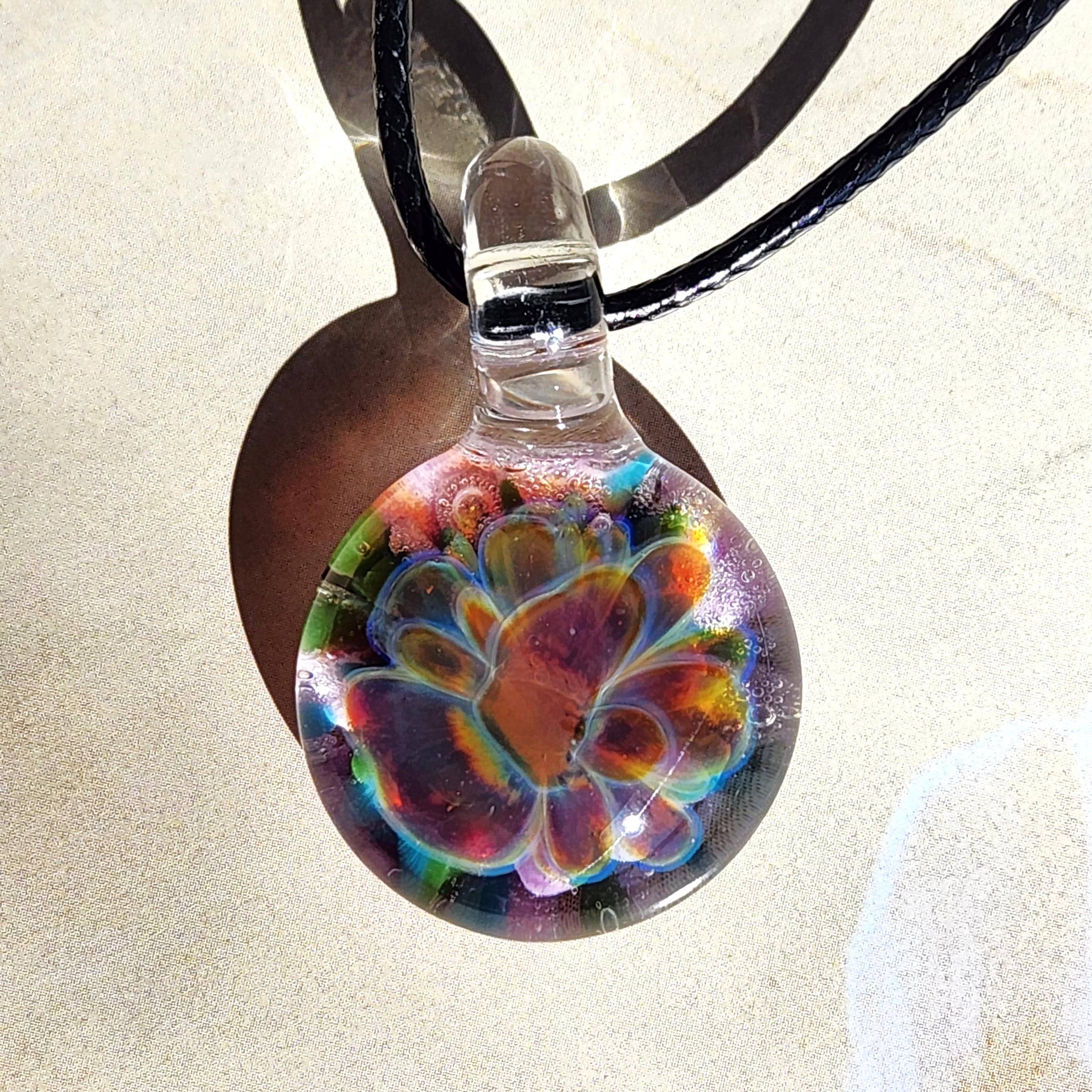 This one-of-a-kind pendant is small, lightweight, and full of subtle color. Made with borosilicate glass, it features a dreamy rainbow flower blooming against a multicolor base. The glass gently shifts colors depending on the light, creating flashes of blue, green, and purple. The design is clean and timeless, perfect for everyday wear.