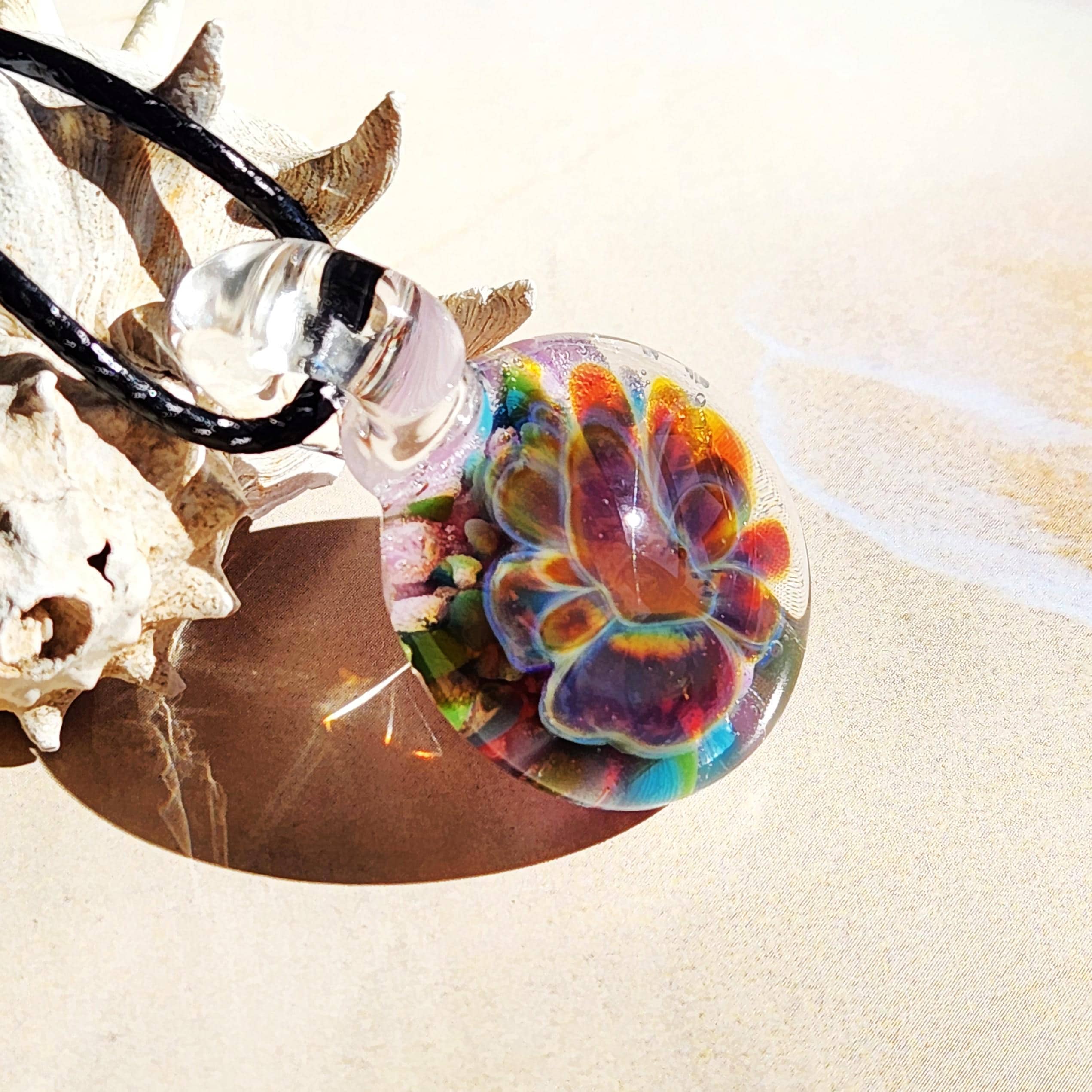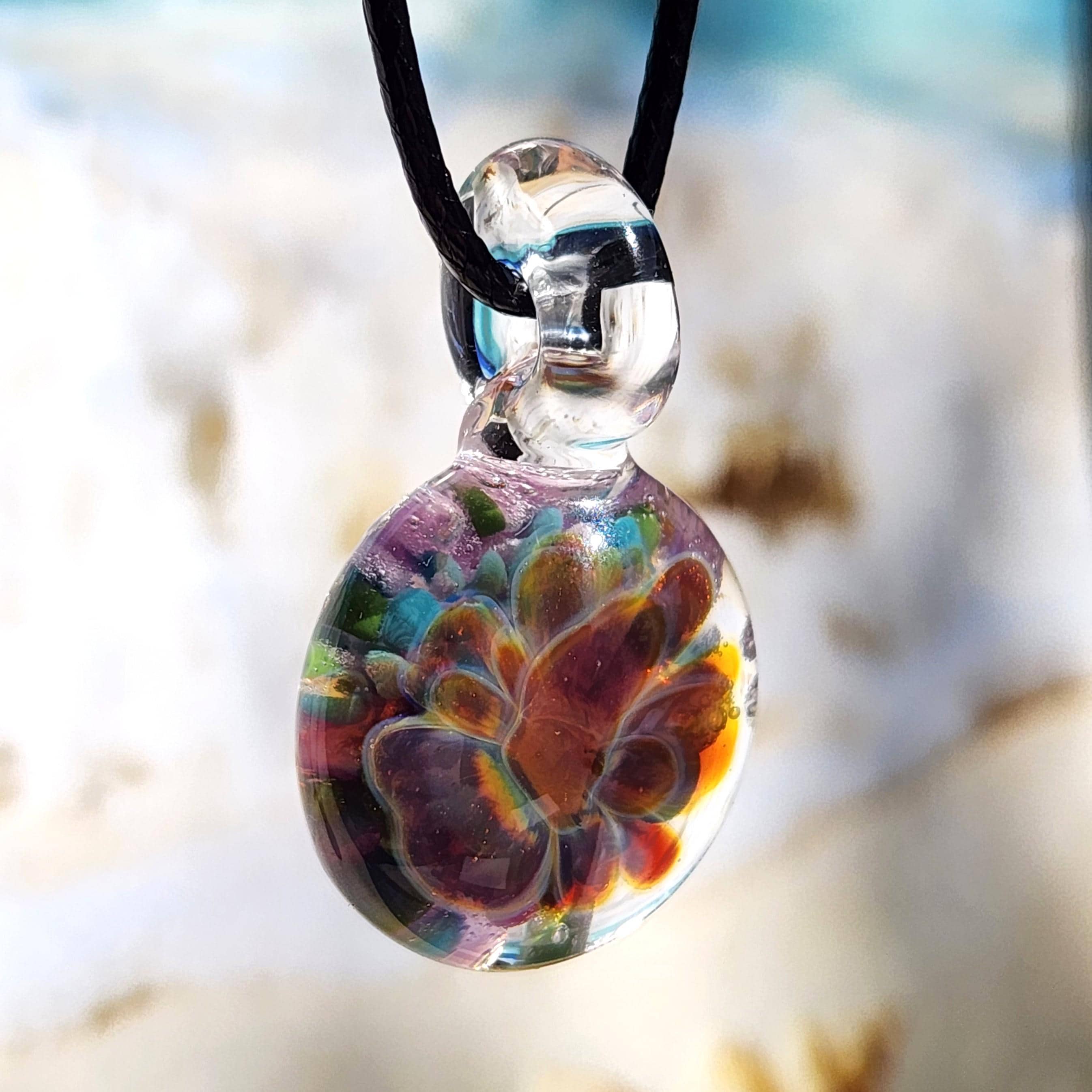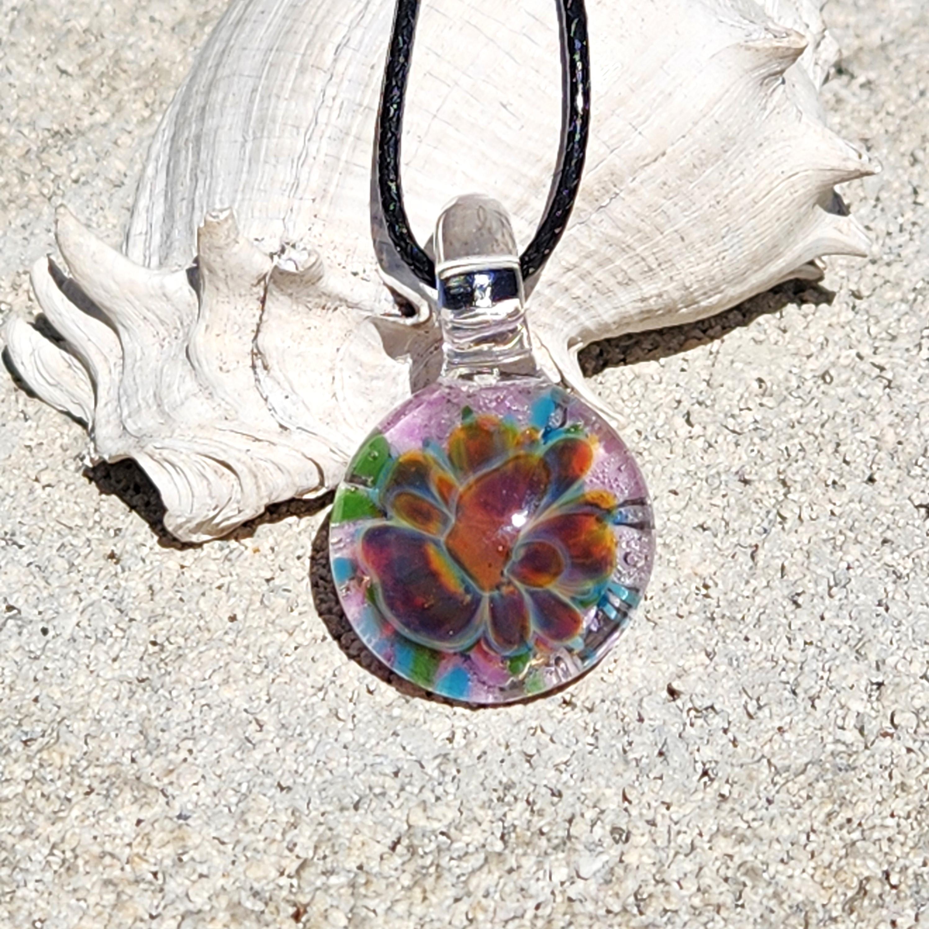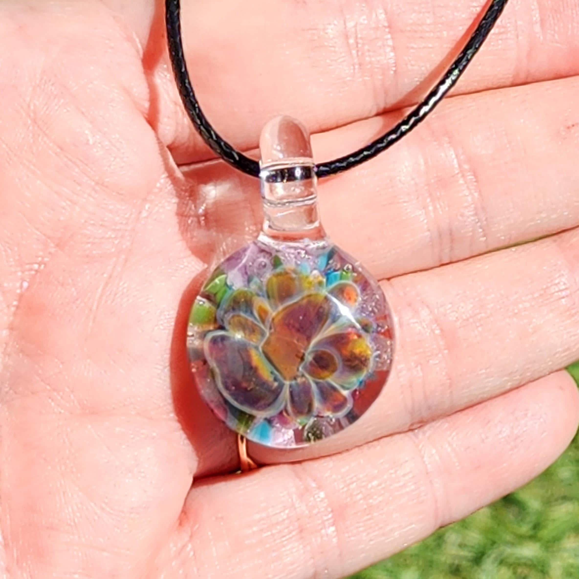 This one-of-a-kind pendant is small, lightweight, and full of subtle color. Made with borosilicate glass, it features a dreamy rainbow flower blooming against a multicolor base. The glass gently shifts colors depending on the light, creating flashes of blue, green, and purple. The design is clean and timeless, perfect for everyday wear.