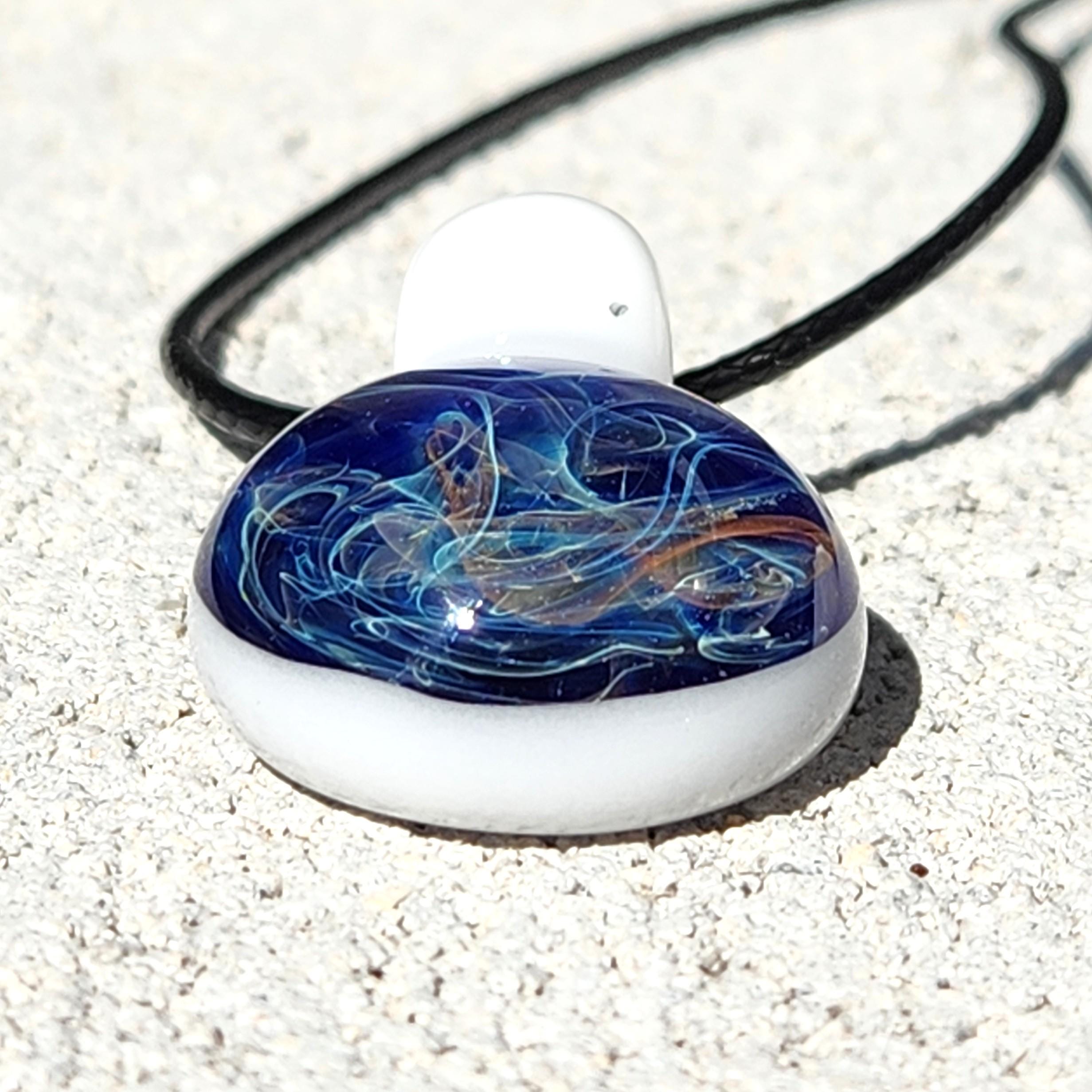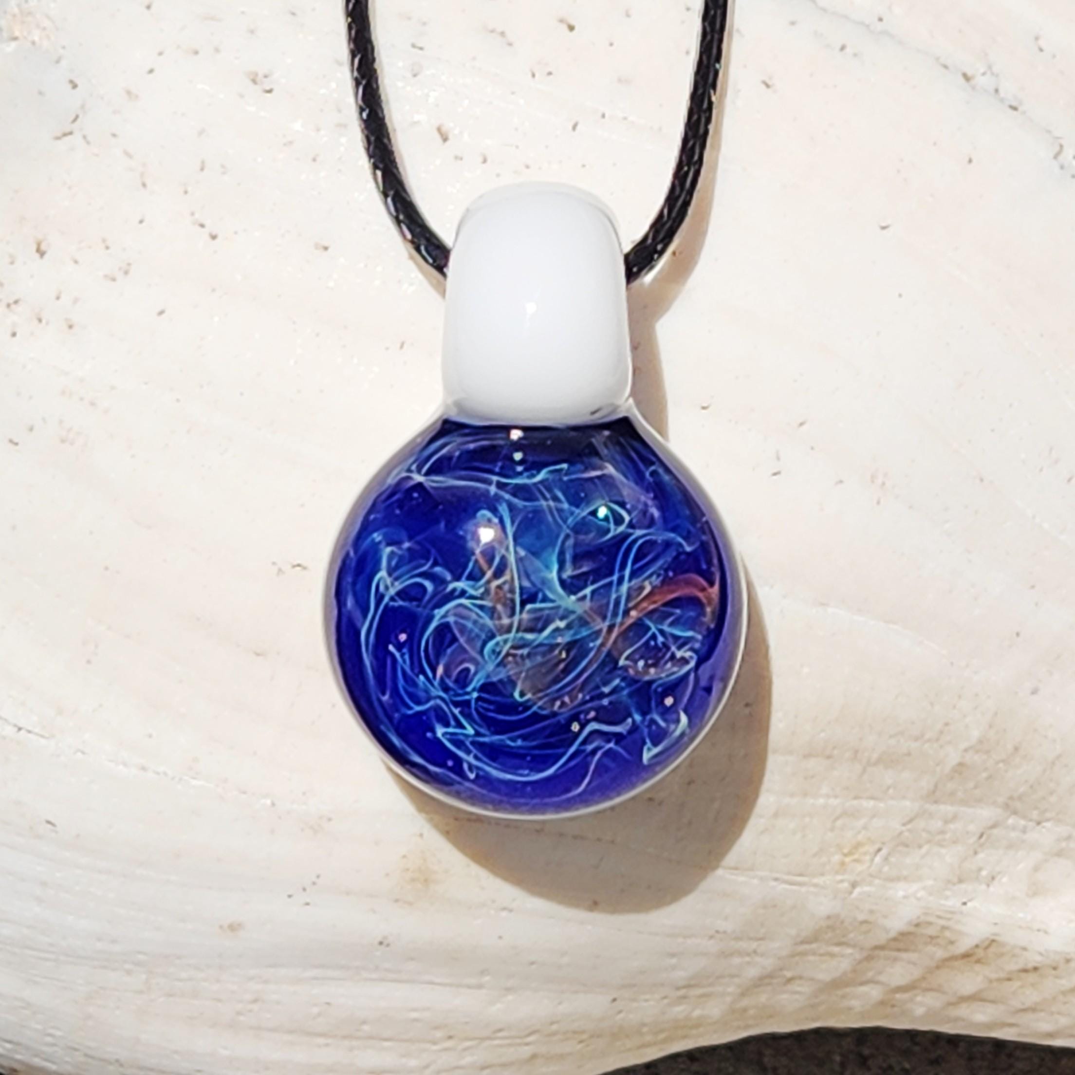Sized at approximately 0.9" wide and 1.2" long, it’s the perfect pendant for anyone who loves handmade jewelry, galaxy-inspired art glass, or meaningful artisan gifts.