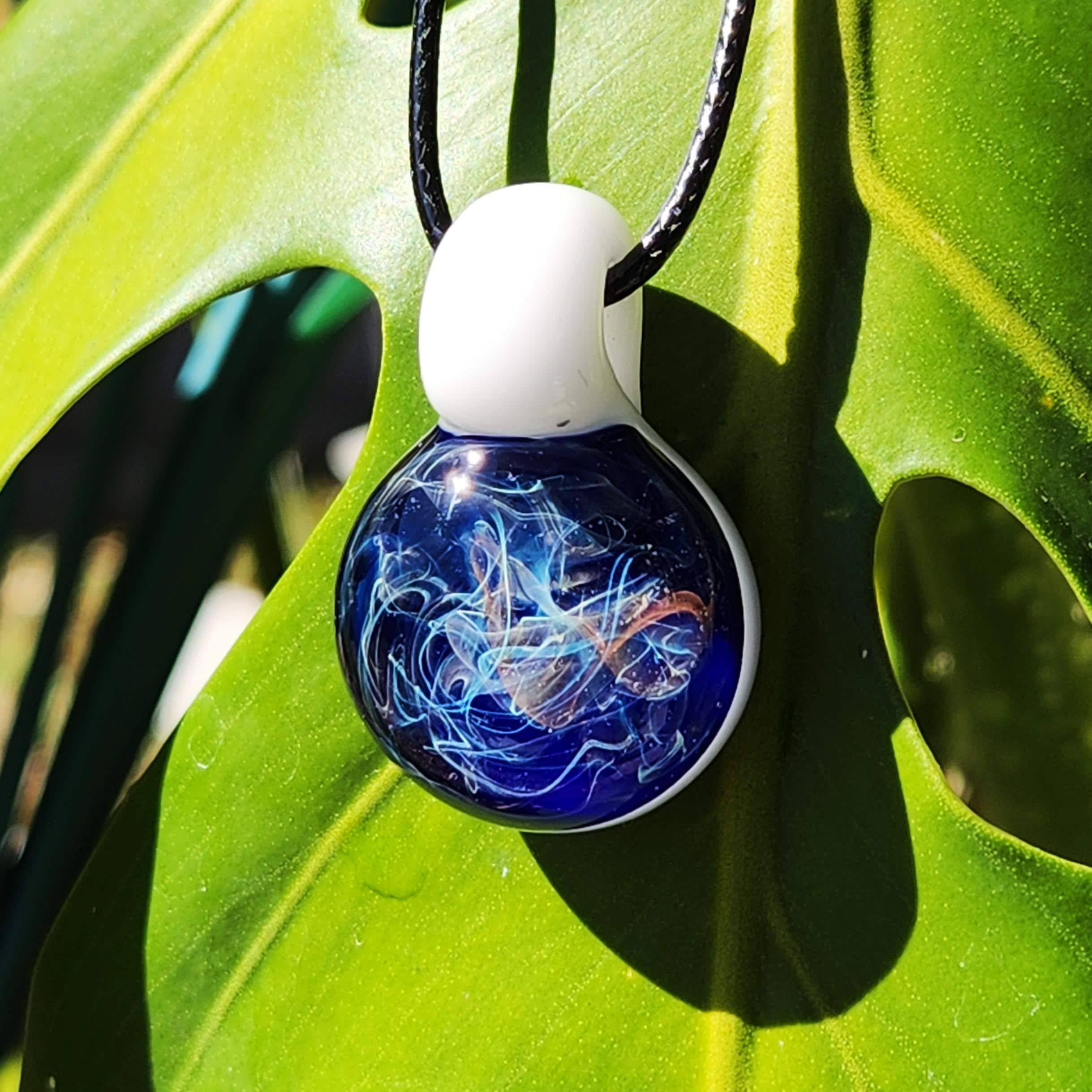 Handmade Blue & White Galaxy Pendant Necklace. Filled with shimmering silver and gold, this pendant is a delicate little universe you can wear every day. The deep blue background glows with soft swirls of pure silver and pure gold fuming, highlighted with tiny sparkles that catch the light beautifully. The outer casing is a clean, bright white that makes the blue center pop even more, it is elegant, lightweight, and one of a kind.