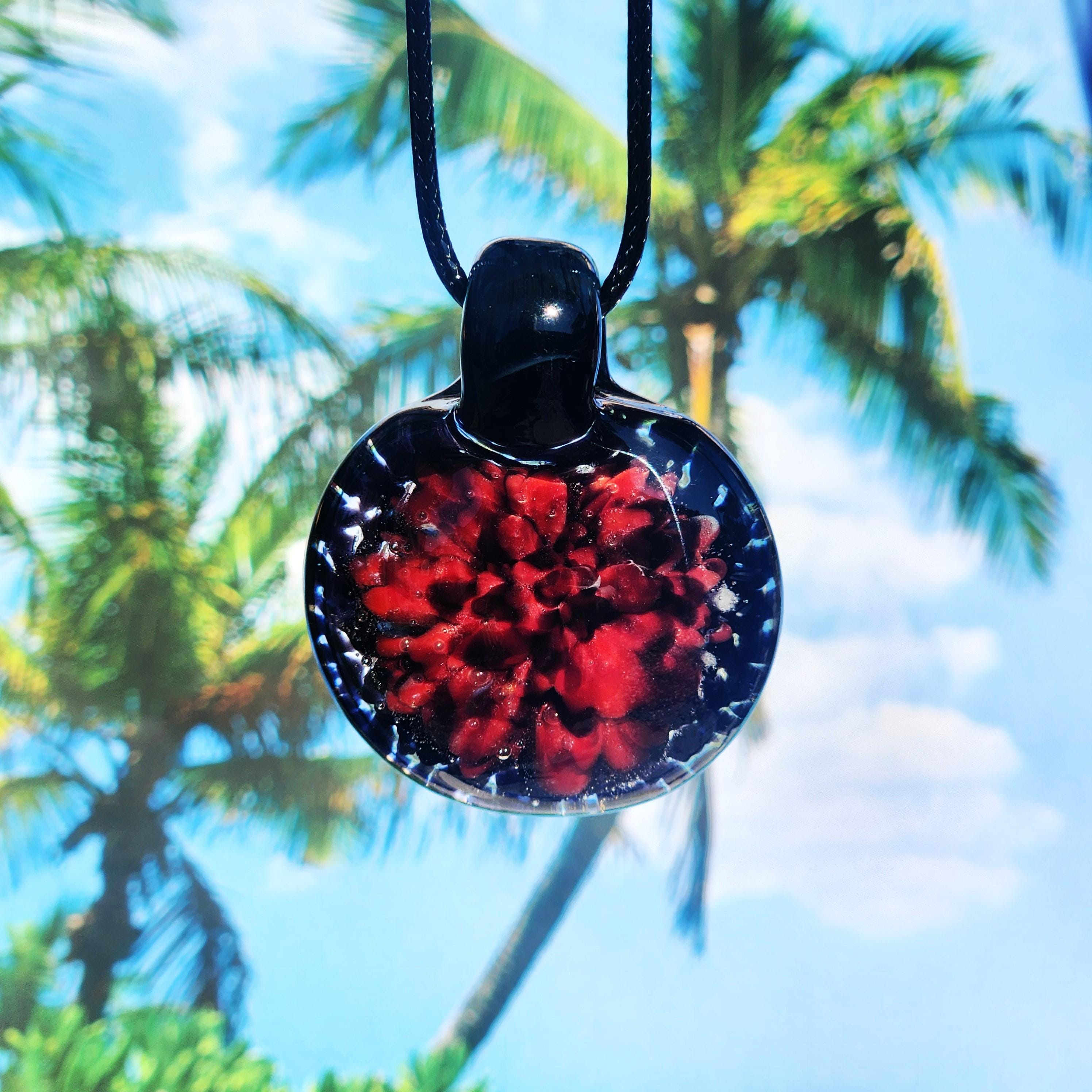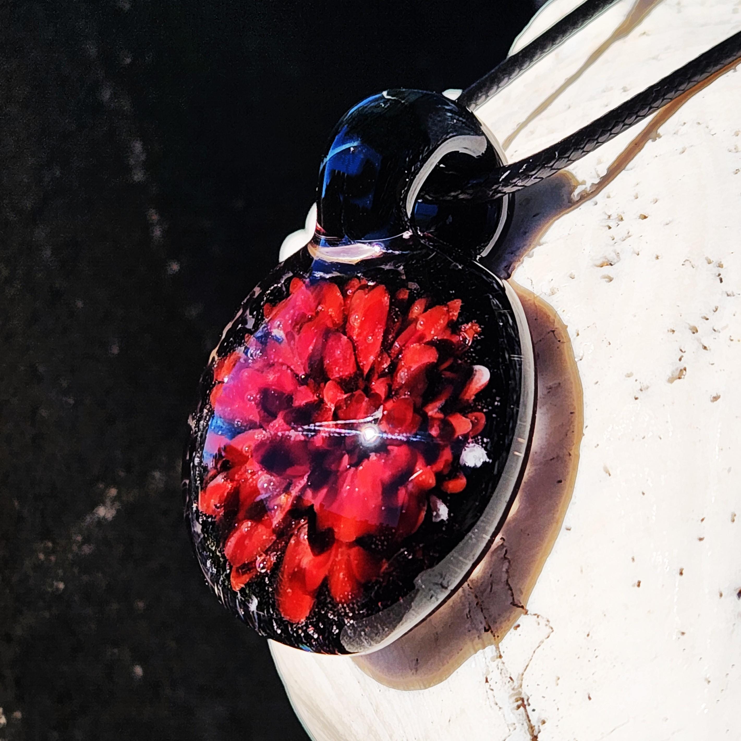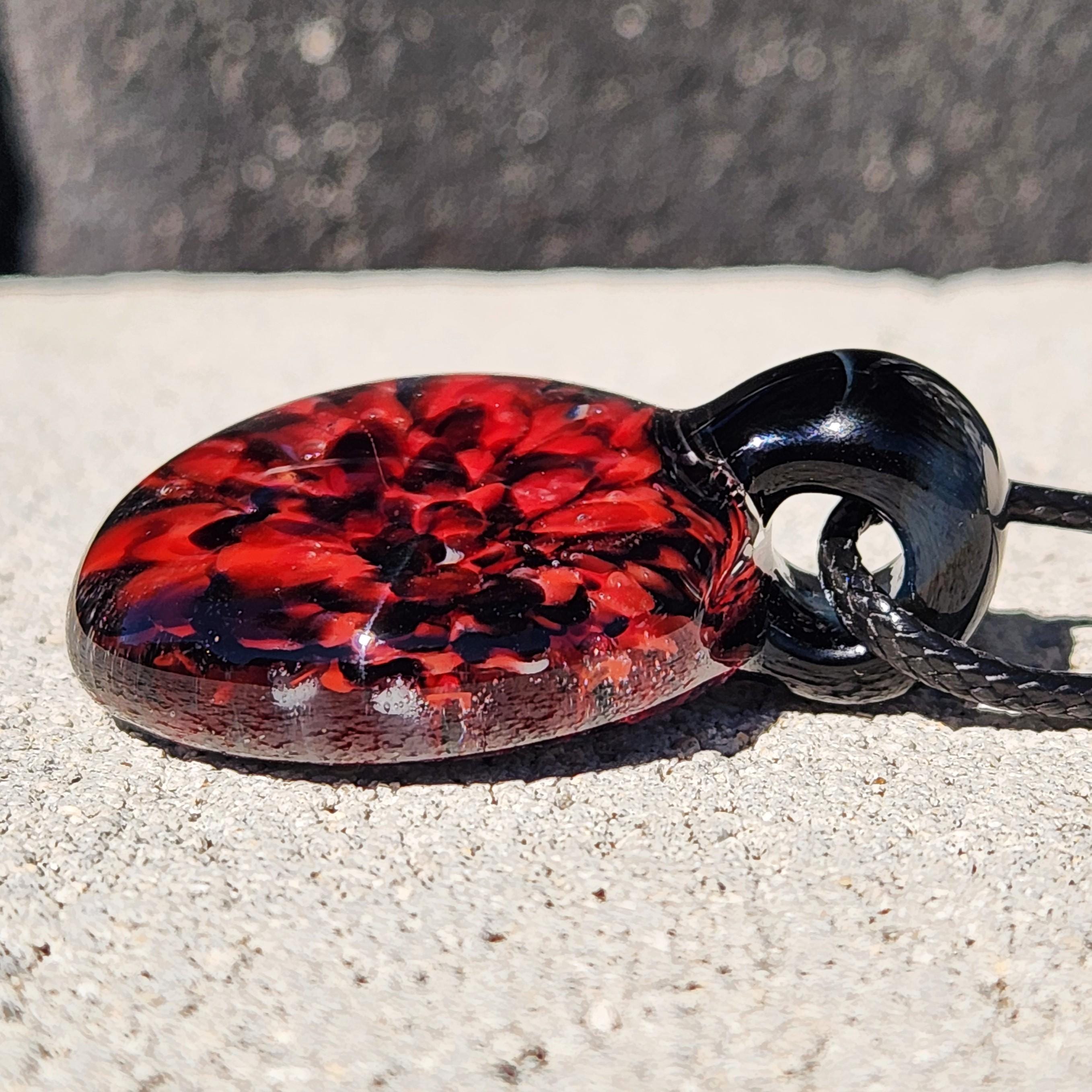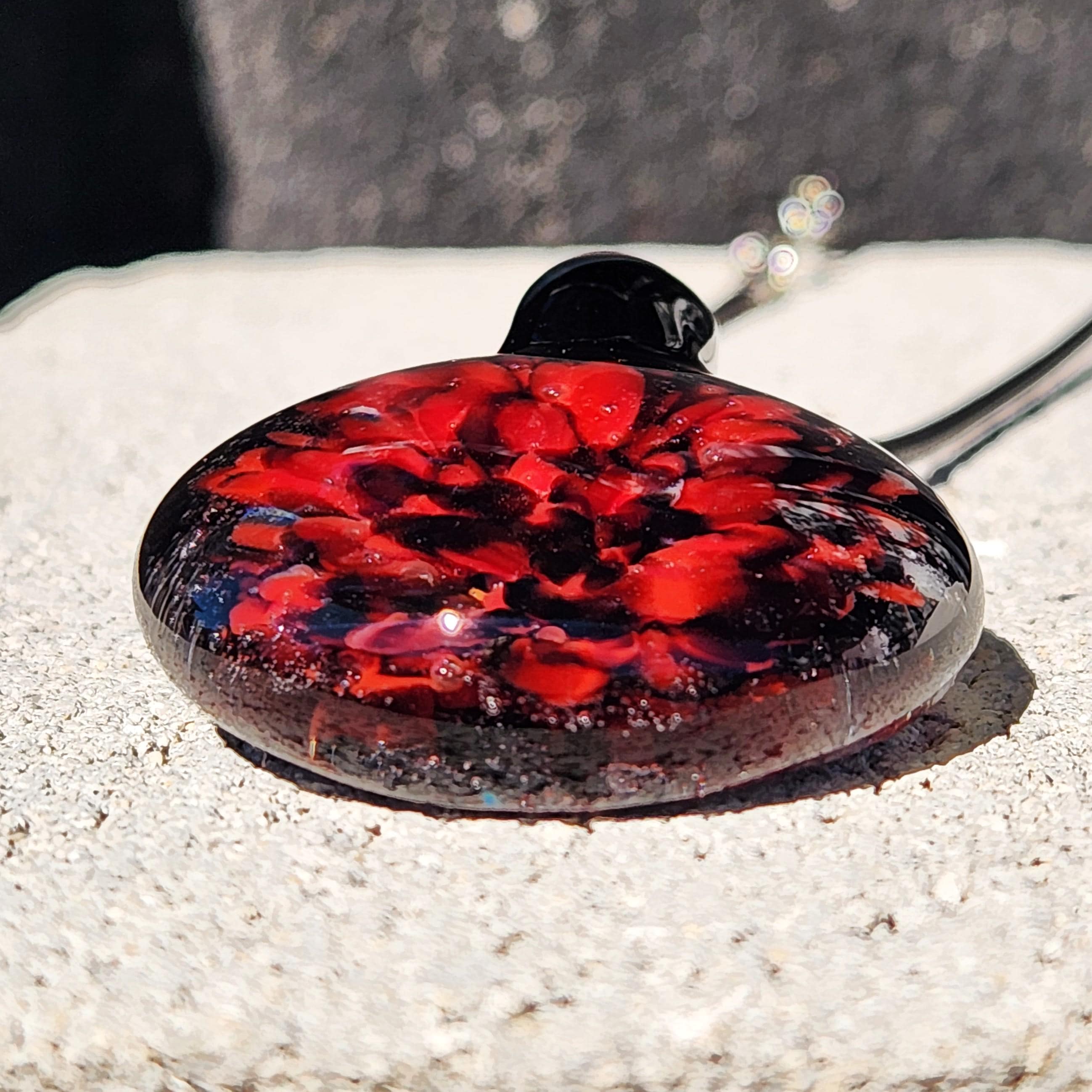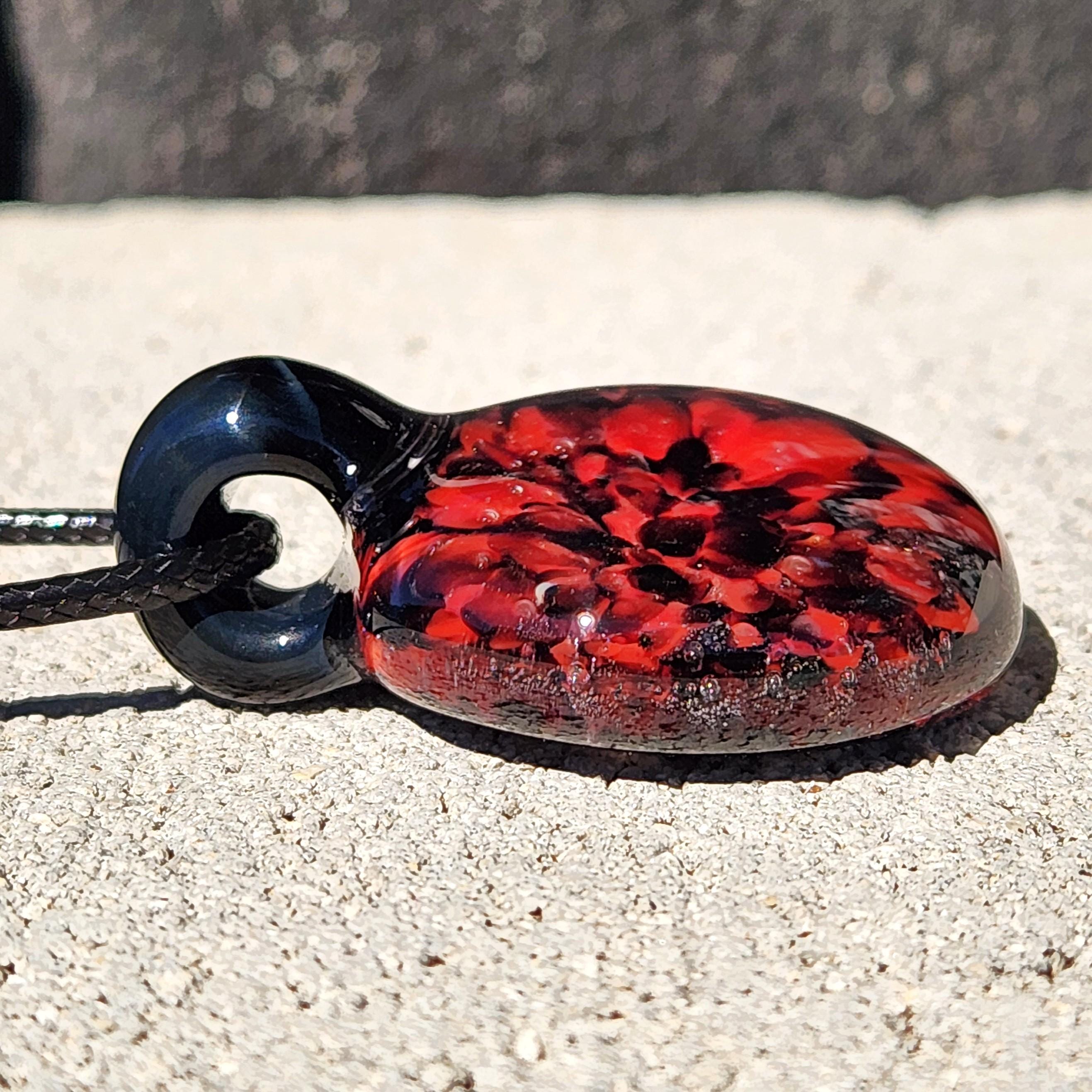 This handmade glass pendant features glowing hues of red borosilicate glass, swirling together like a flame within a crystal orb. The vibrant colors shift beautifully in sunlight, revealing different tones depending on the angle. Surrounded by bold black crushed glass, this piece offers contrast and elegance in a dramatic yet wearable design.