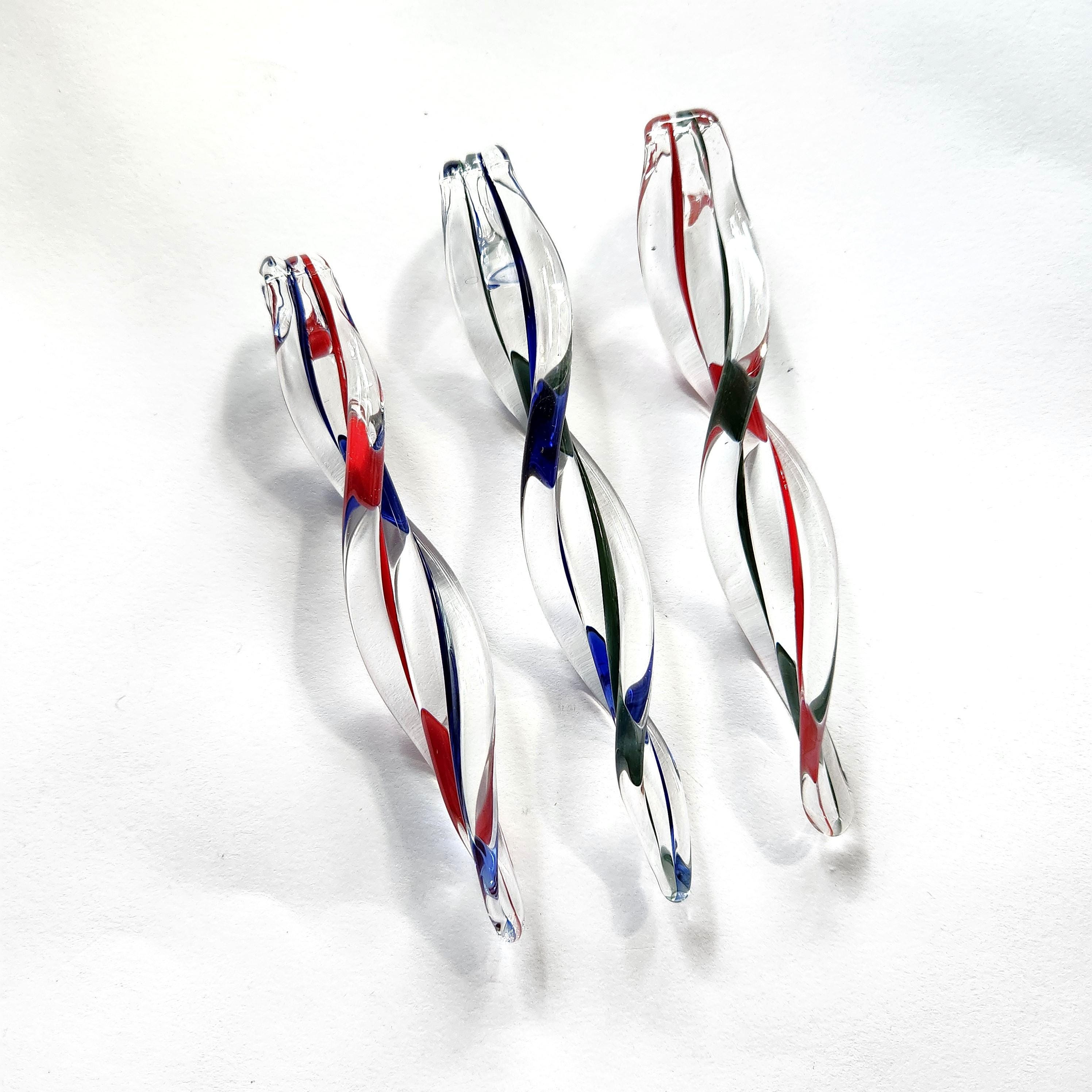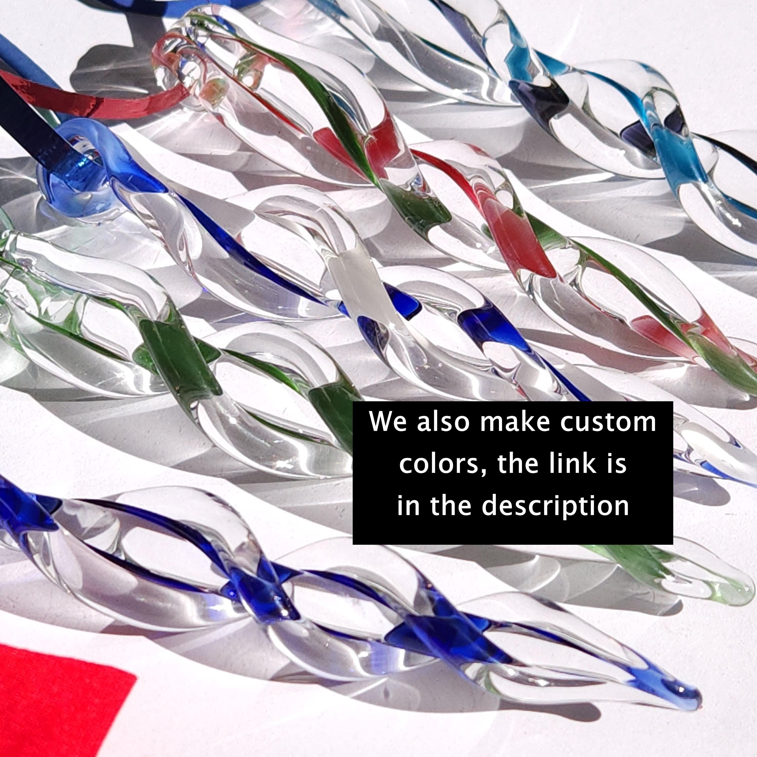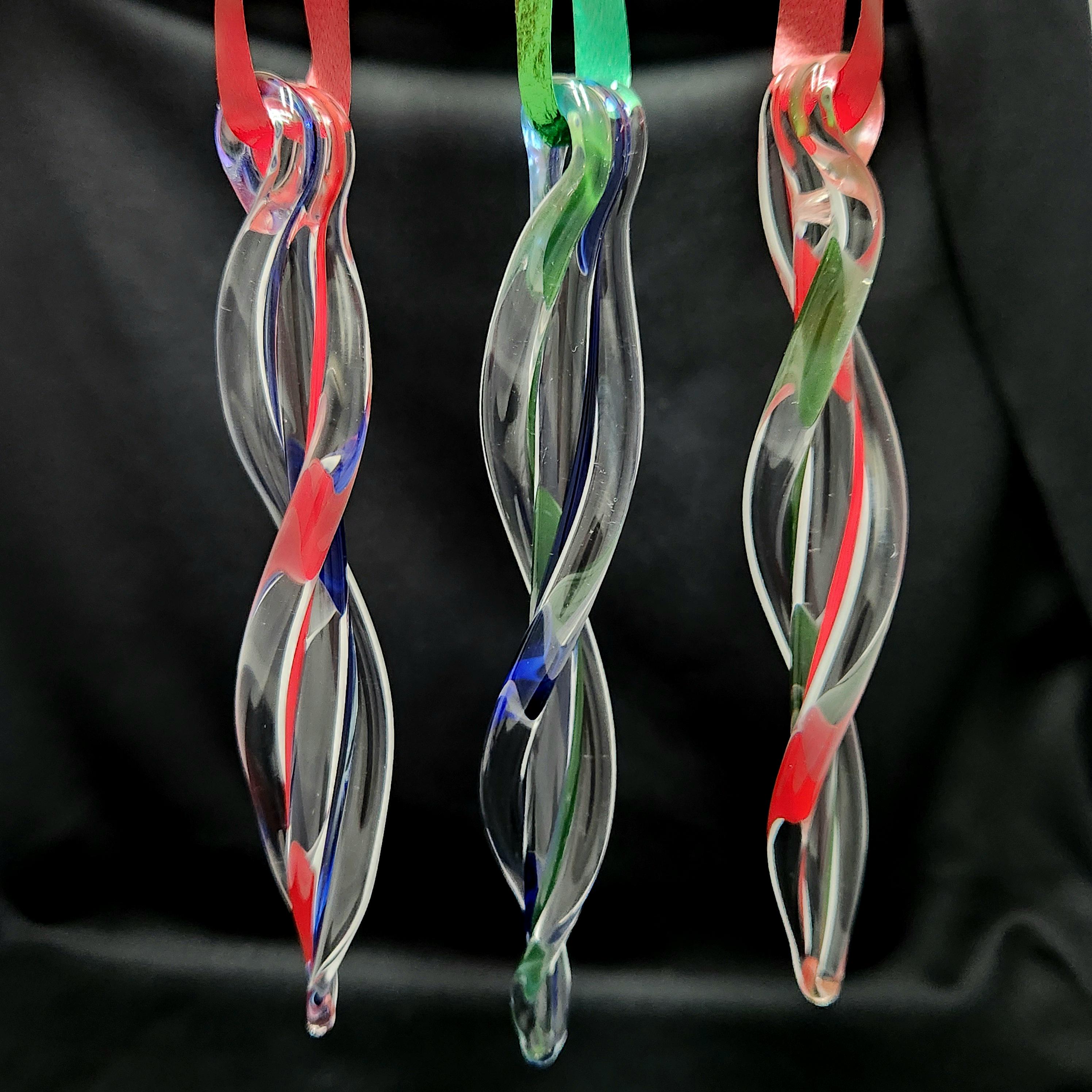 Bring a touch of festive sparkle to your home with this set of 3 handmade glass icicle ornaments. Each ornament features a unique color combination: red & green, red & blue, and blue & green. The twisted spiral design catches the light beautifully, making them perfect for both holiday decor and year-round suncatchers.